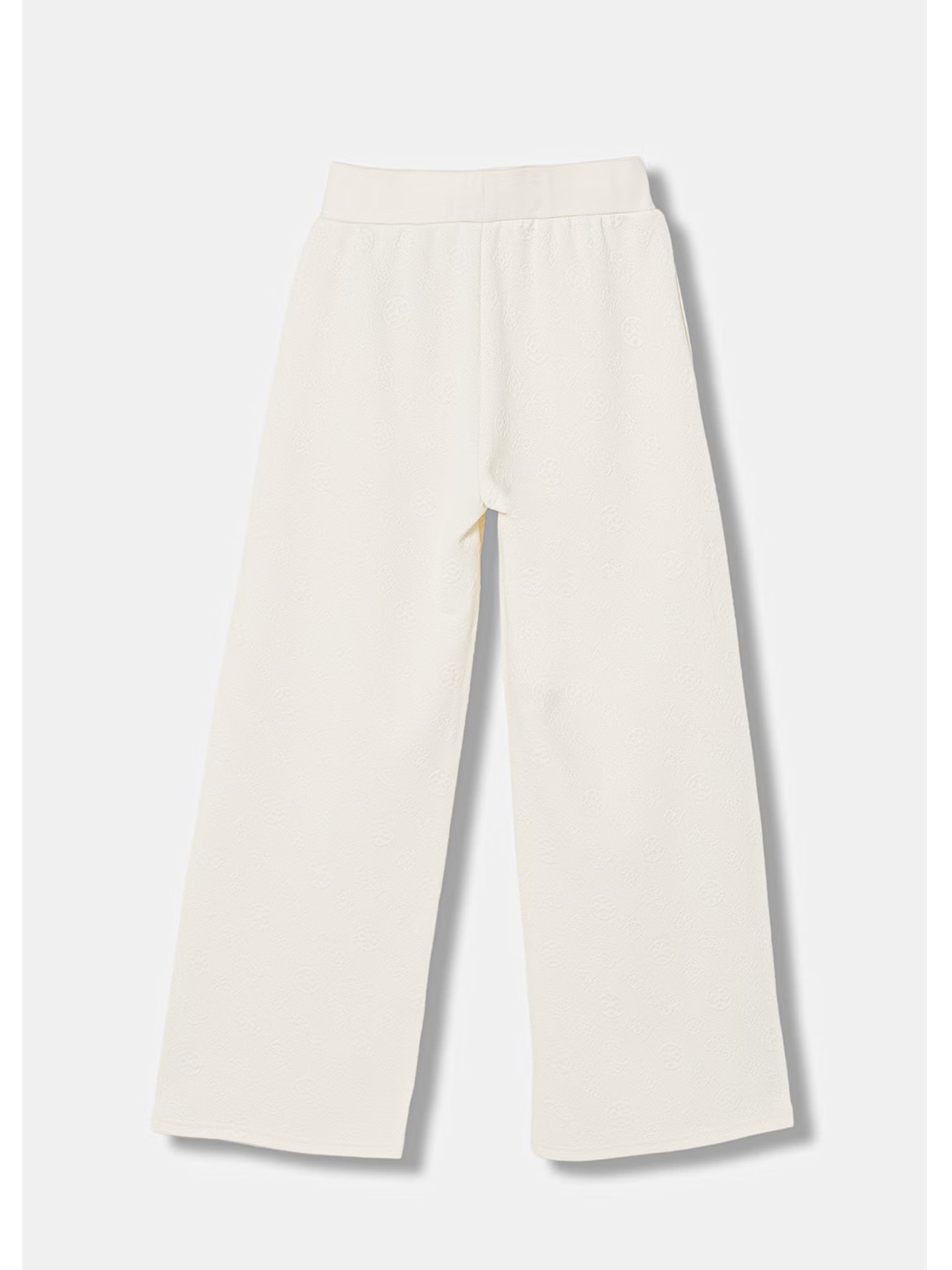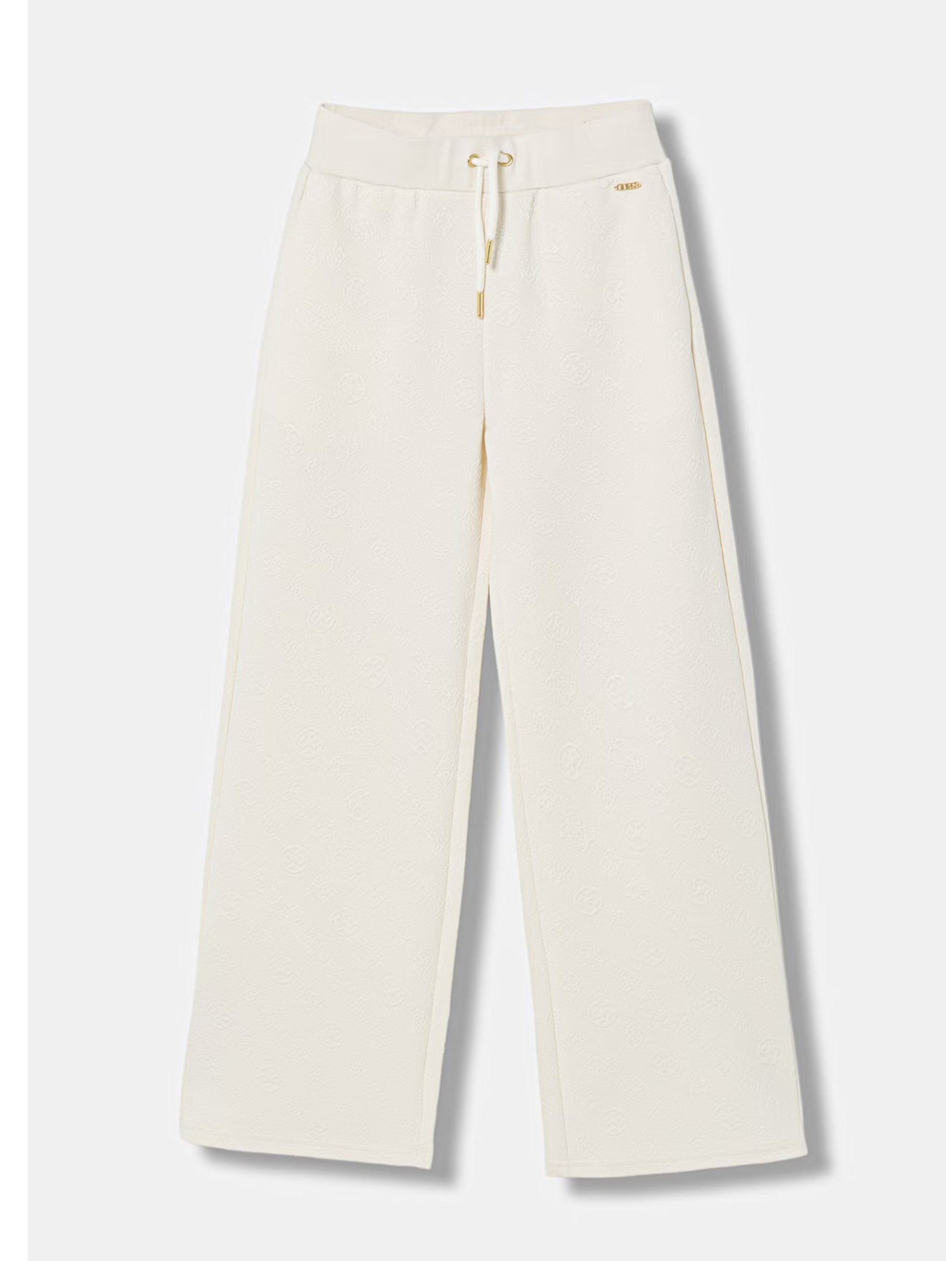 Pantaloni tuta beige Guess da bambina logo all over. Questi pantaloni Guess, realizzati da un tessuto morbido e leggero, perfetti per la stagione primaverile, hanno la banda elastica sul punto vita regolabile con lacci, due tasche laterali aperte, logo Guess all over e gamba larga