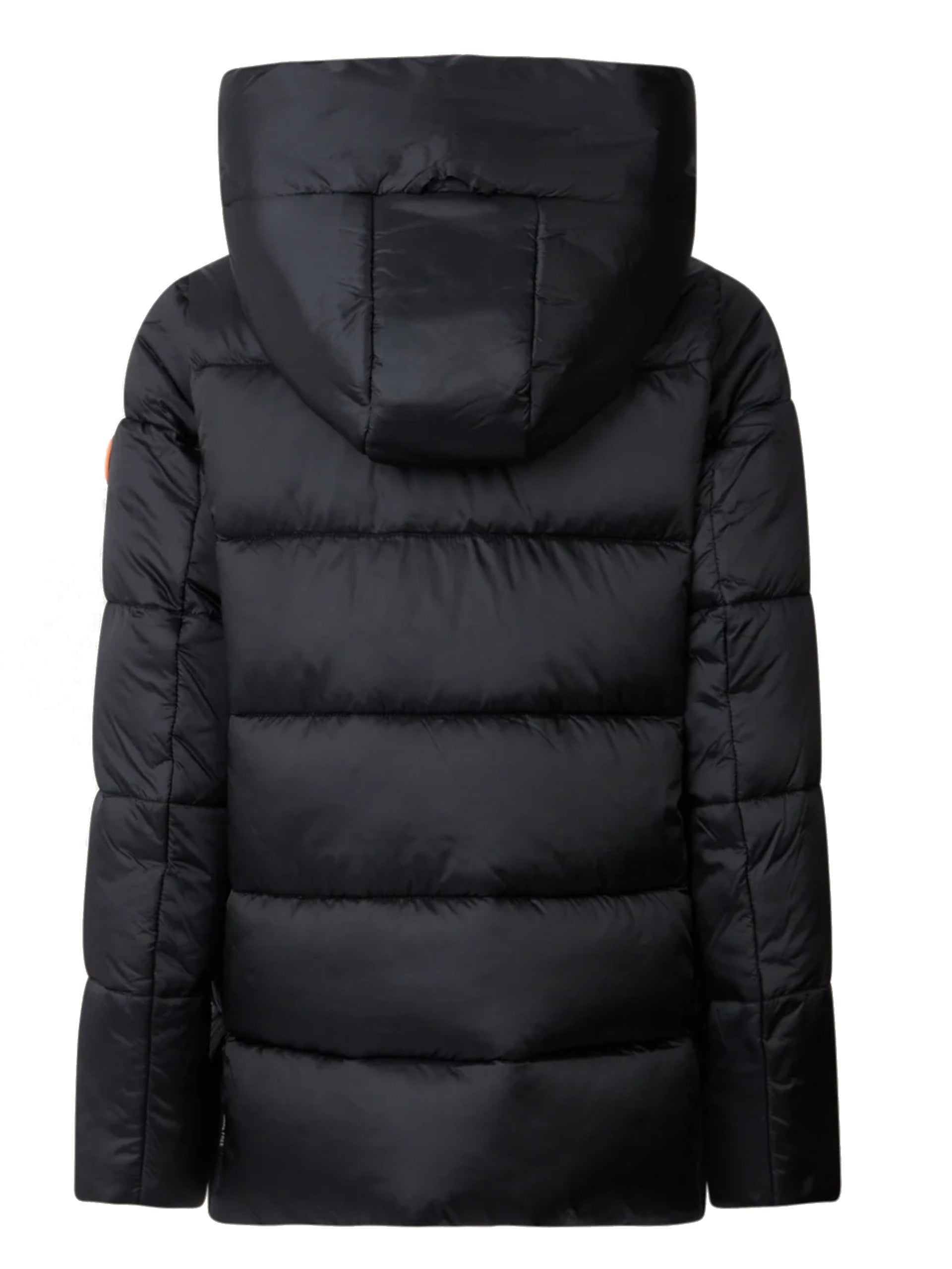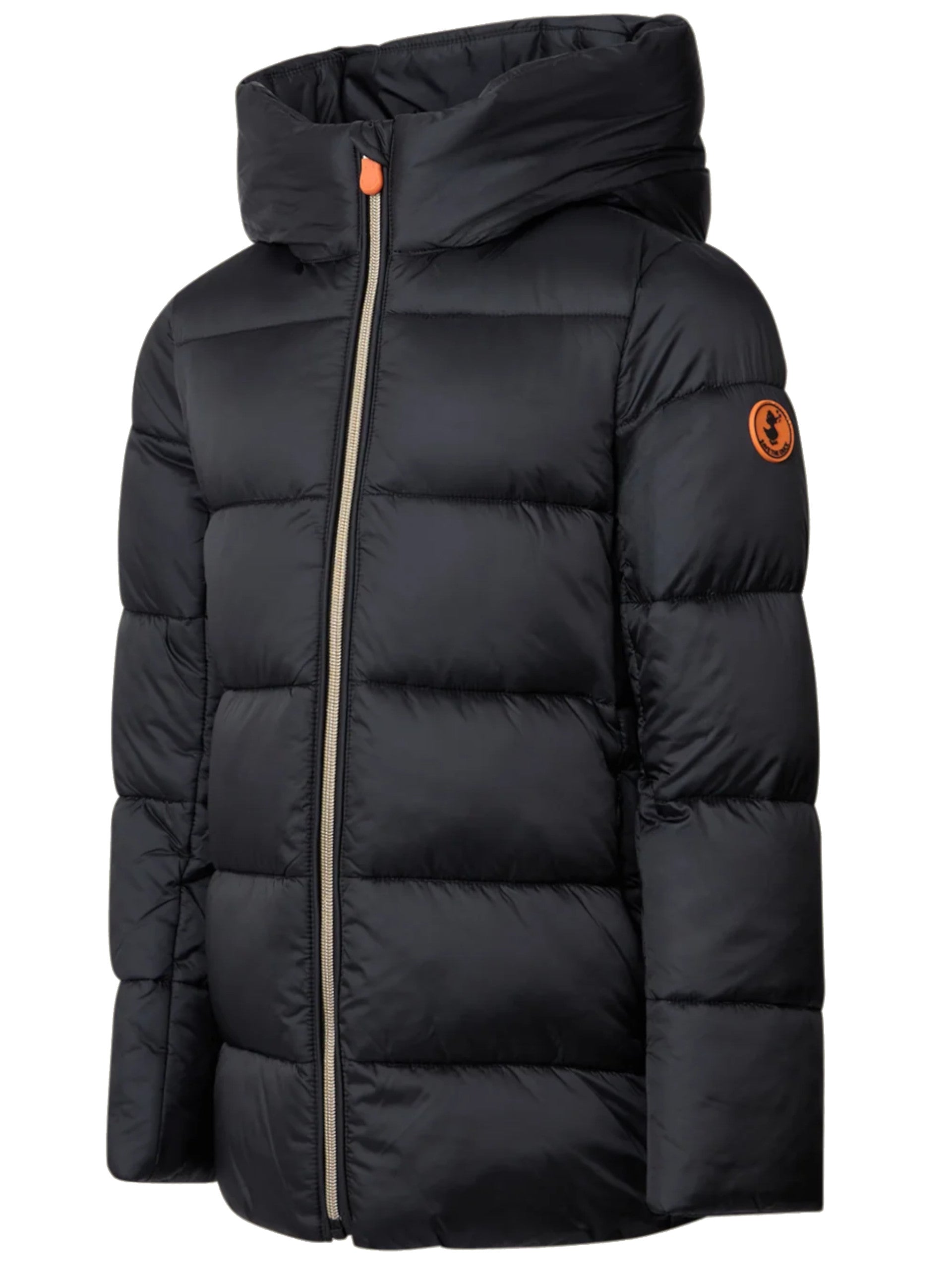 Cappotto Save The Duck nero da bambina Gracie J45650GIRIS21. Questo piumino Save The Duck nero ha il cappuccio fisso, la chiusura full zip doppio cursore, due tasche laterali con chiusura zip a filo,polsini elasticizzati ed il patch gommato del brand applicato sulla manica sinistra.