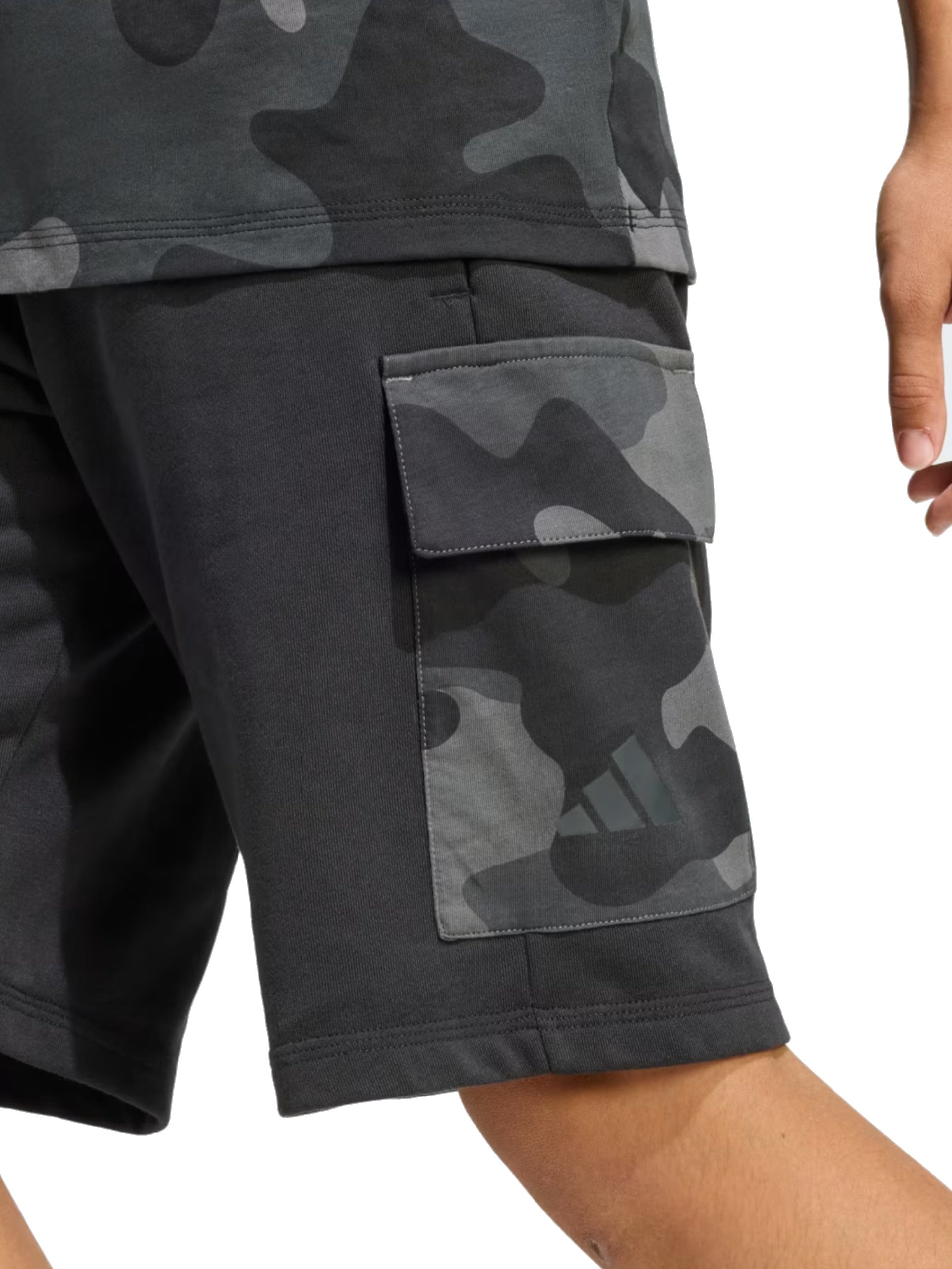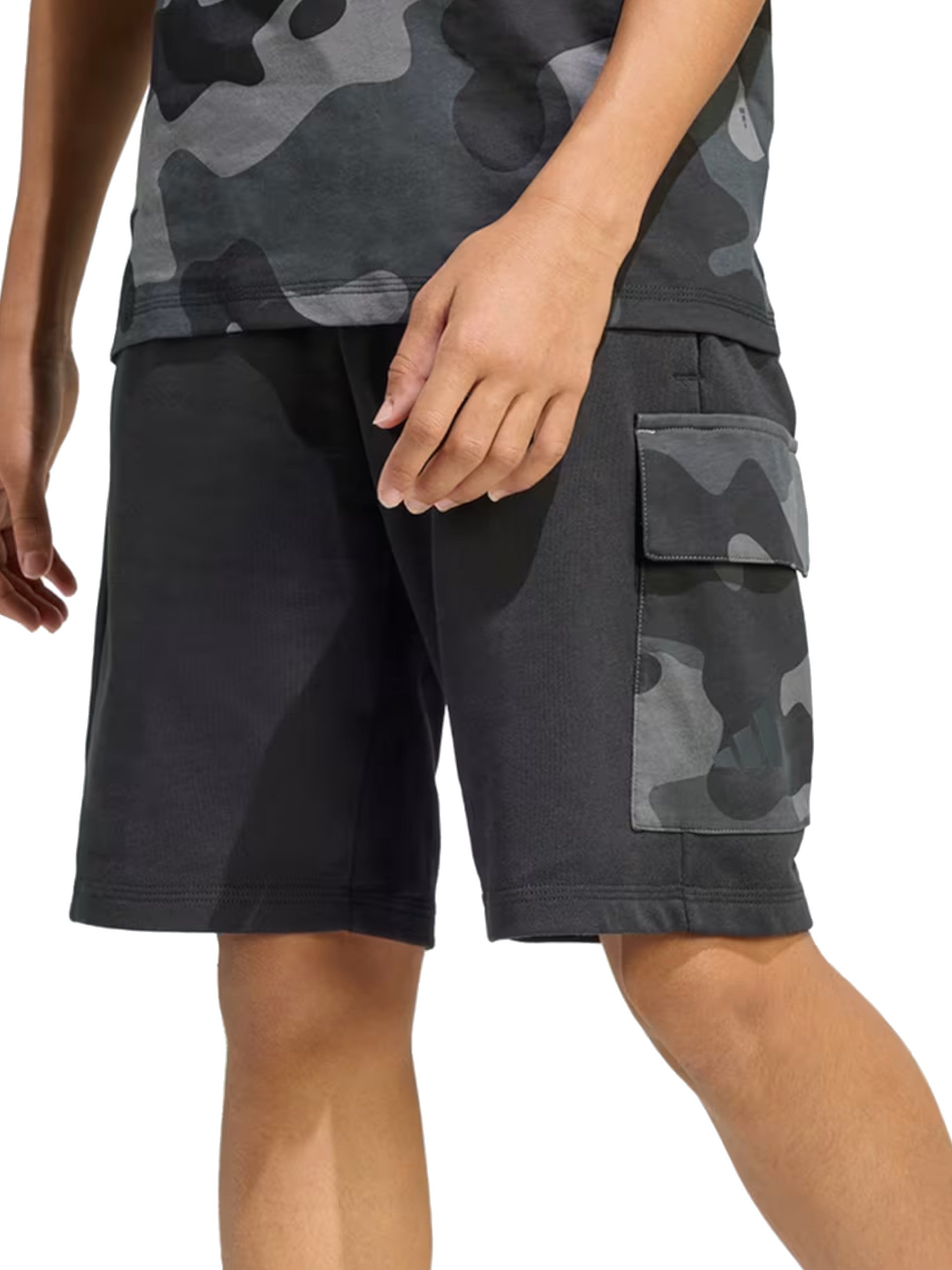 Pantaloncini cargo Adidas da bambino nero. Questi pantaloncini Adidas, realizzati in cotone, hanno la bamda elastica sul punto vita regolabile con i lacci, due tasche laterali e una tasca grande sul lato sinistro