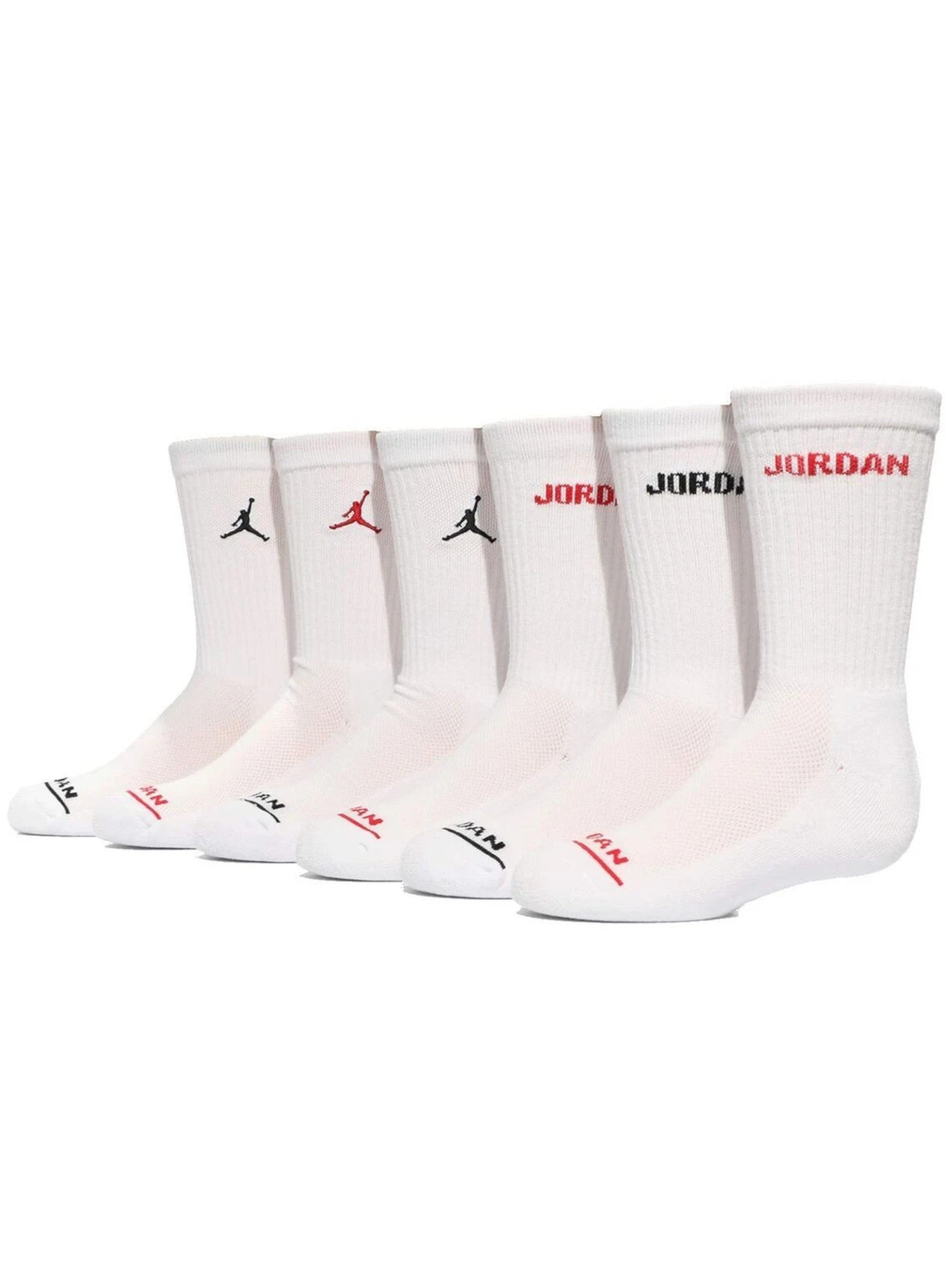 Calzini Jordan Legend 6 paia bianchi BJ0343. Set Calzini Jordan bianchi da bambino e bambina, modello mezza gamba. Questi calzini Nike Jordan bianchi hanno l'iconico Jumpman ricamato sul davanti a contrasto colore e sono stati realizzati in morbida spugna.