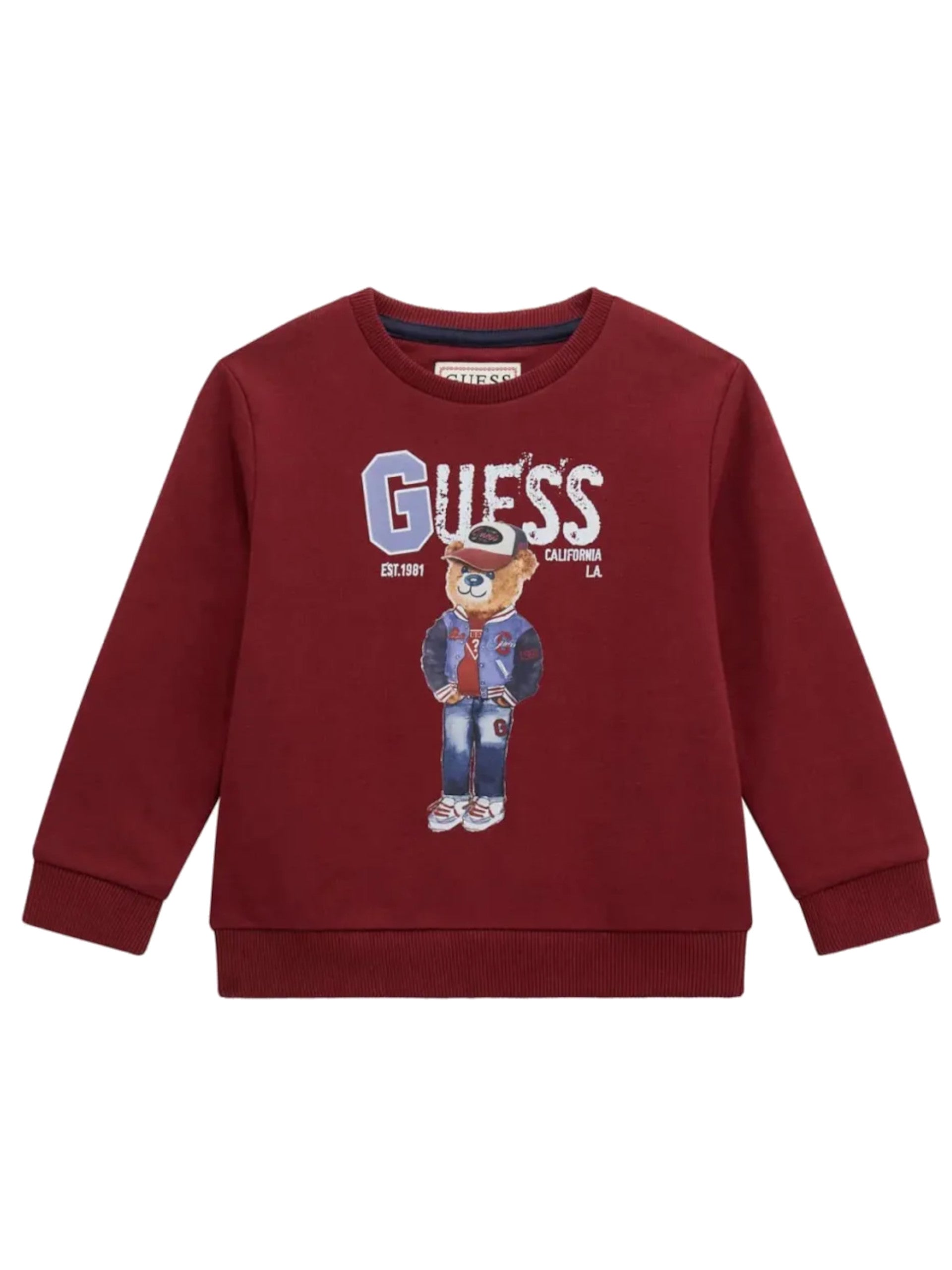 Felpa Guess bordeaux da bambino girocollo maxi stampa orsacchiotto N5YQ05KAD74, realizzata in 100% puro cotone. Questa felpa Guess bambino ha le maniche lunghe, la maxi stampa Guess con orsacchiotto,polsini e fondo elasticizzati.