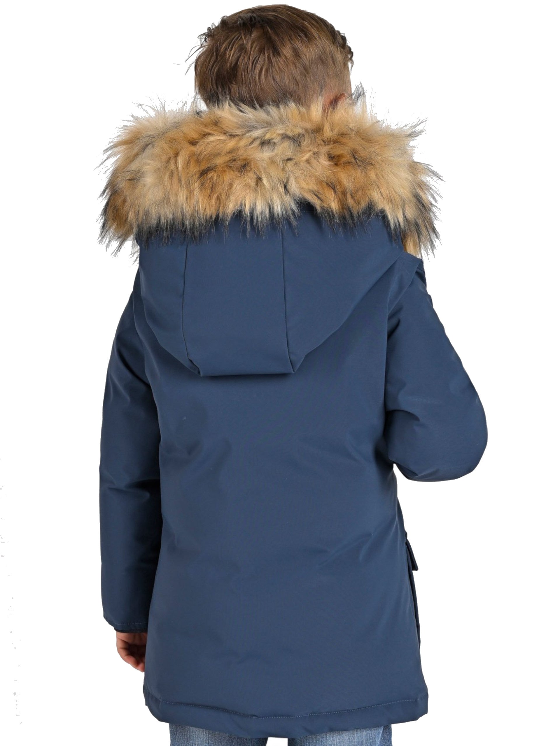 Giacca Canadian blu da bambino con imbottitura in piuma naturale. Questo cappotto Canadian Manitoba Tech ha il cappuccio fisso regolabile con coulisse in pelliccia ecologica removibile, la chiusura full zip con patta a bottoni, due tasche laterali con bottoni, una tasca interna con velcro, polsini elasticizzati a costine e fondo regolare. Patch gommato a contrasto colore sulla patta del cappotto.