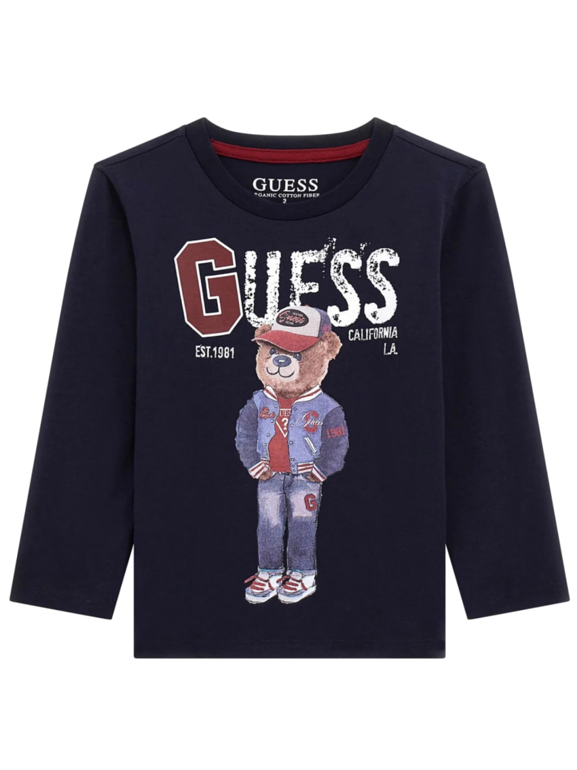 Maglia Guess blu da bambino con stampa Guess orsacchiotto N5YI23K8HM4, realizzata in 100% puro cotone. Questa t-shirt Guess blu girocollo ha le maniche lunghe e la stampa Guess con orsacchiotto sul davanti.