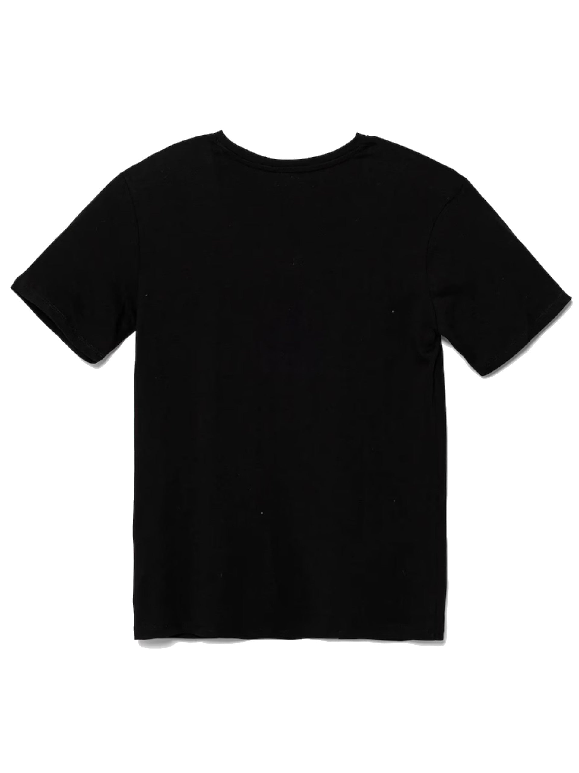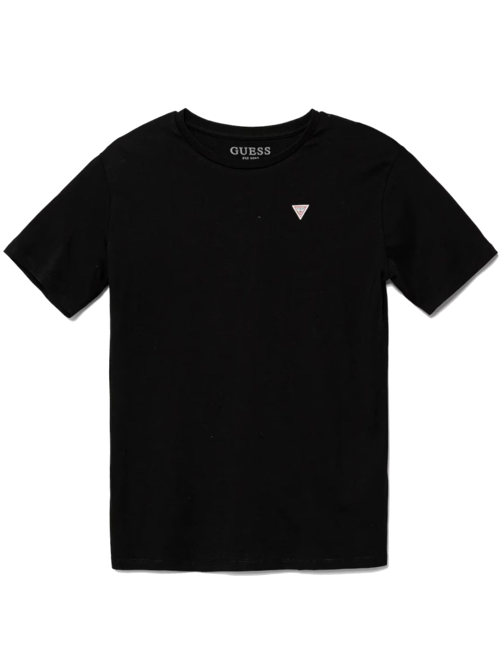 Maglia Guess nera da bambino con patch Guess L5YI38K5M20, realizzata in 100% puro cotone. Questa t-shirt Guess nera girocollo ha le maniche corte e il patch Guess cucito lato cuore.