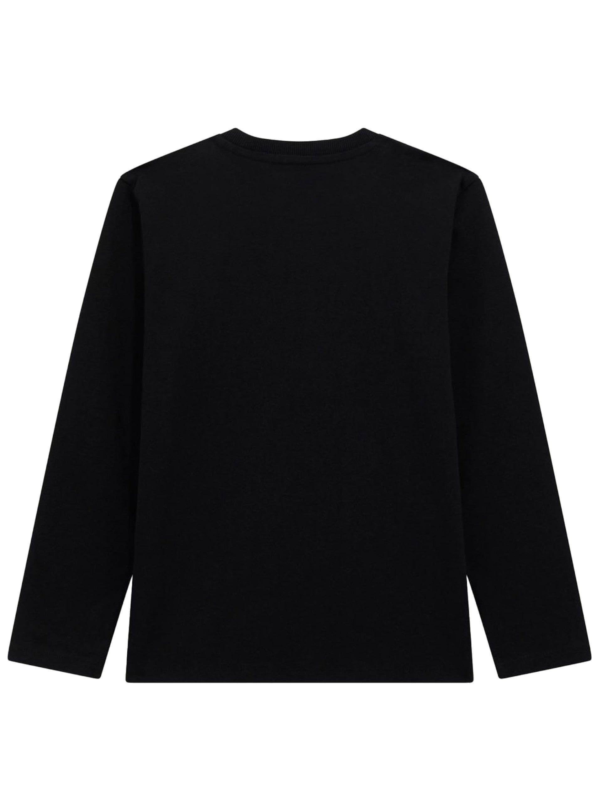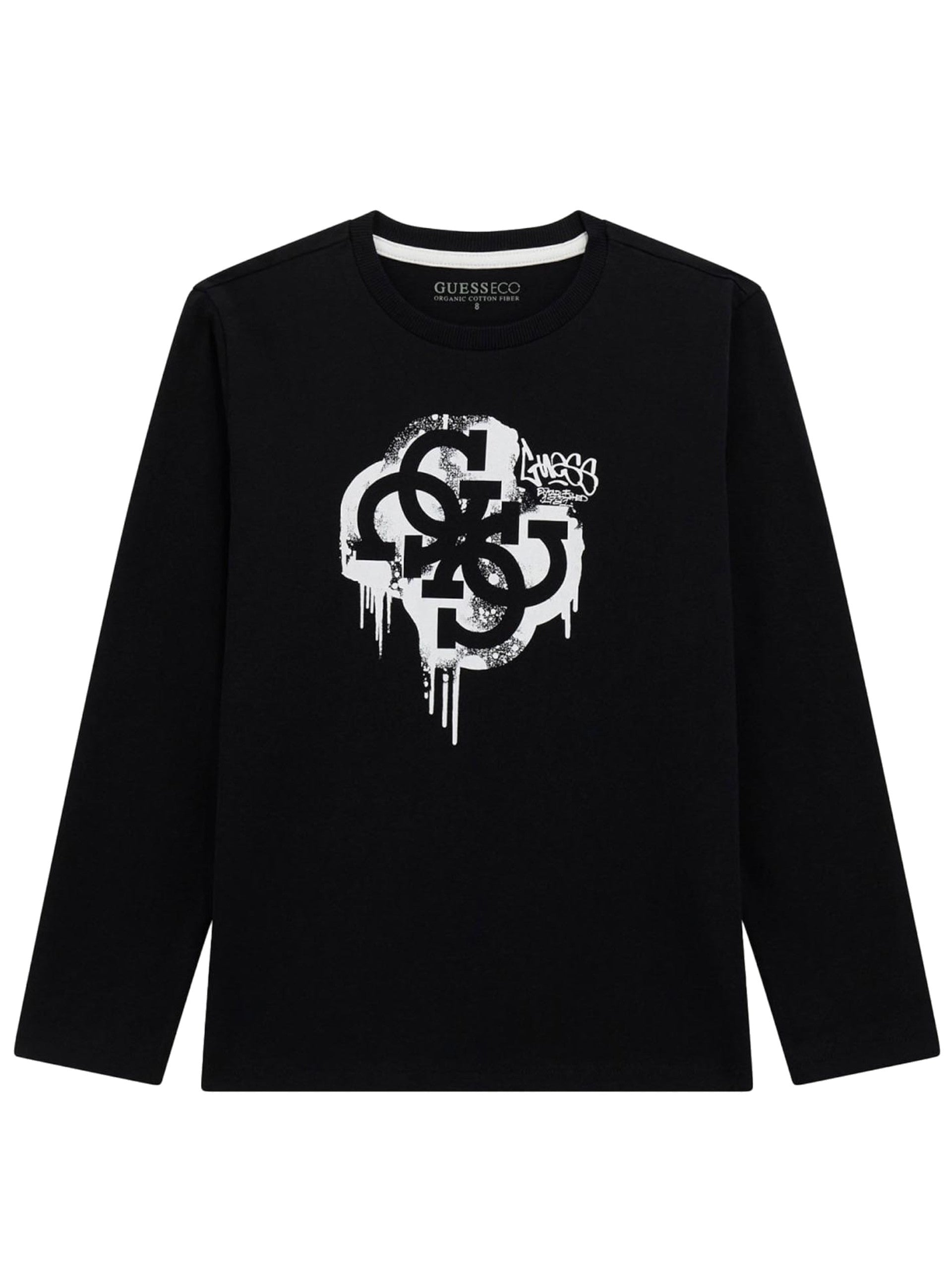 Maglia Guess nera da bambino maniche lunghe con stampa L5BI01I3Z14, realizzata in 100% puro cotone. Questa t-shirt Guess nera girocollo ha le maniche lunghe e la stampa Guess sul davanti a contrasto.
