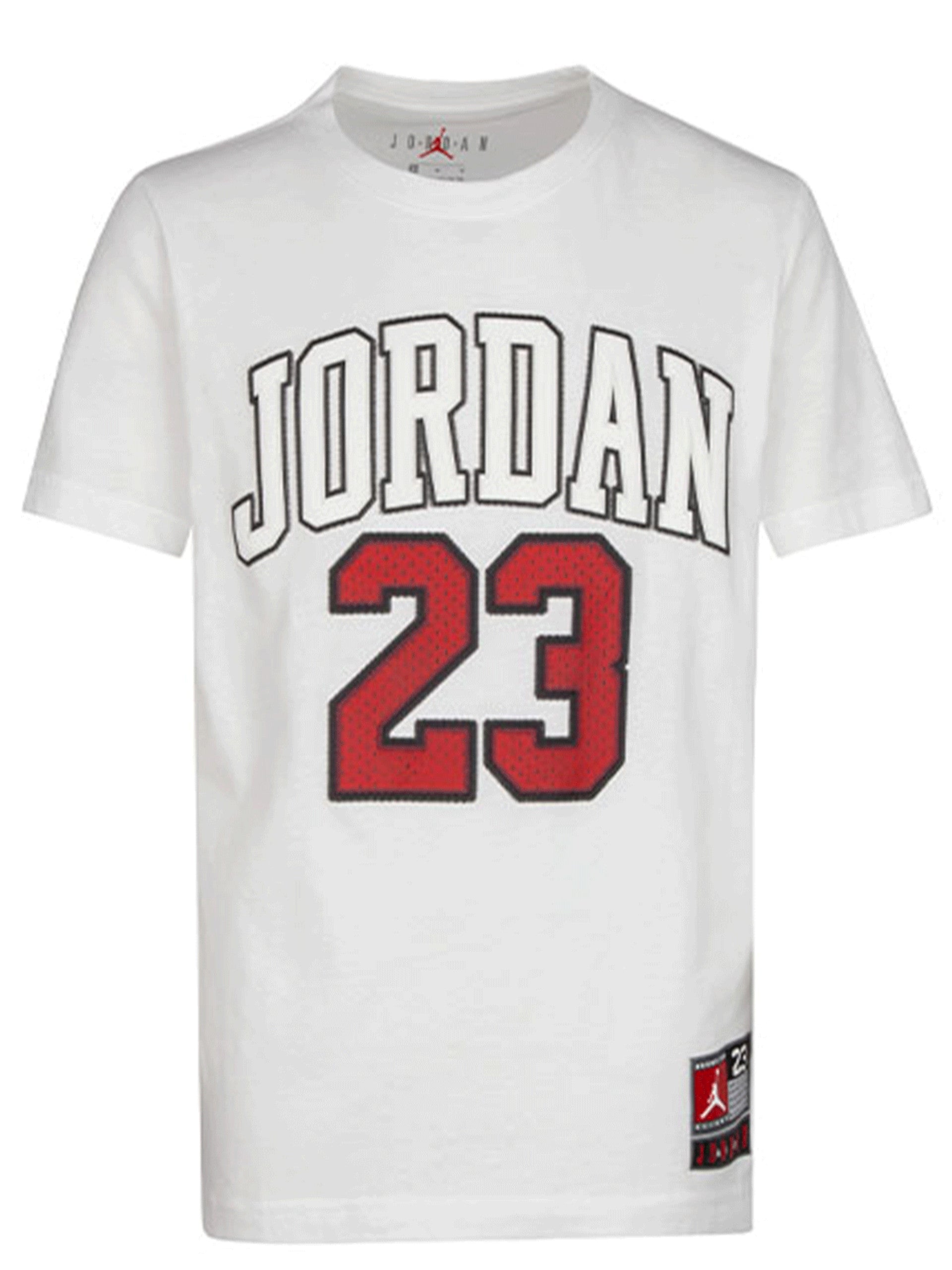 Maglia Jordan bianca da bambino maxi patch 95A088, realizzata in cotone. Questa t-shirt Jordan bianca girocollo ha le maniche corte e il maxi patch Jordan applicato sul davanti.