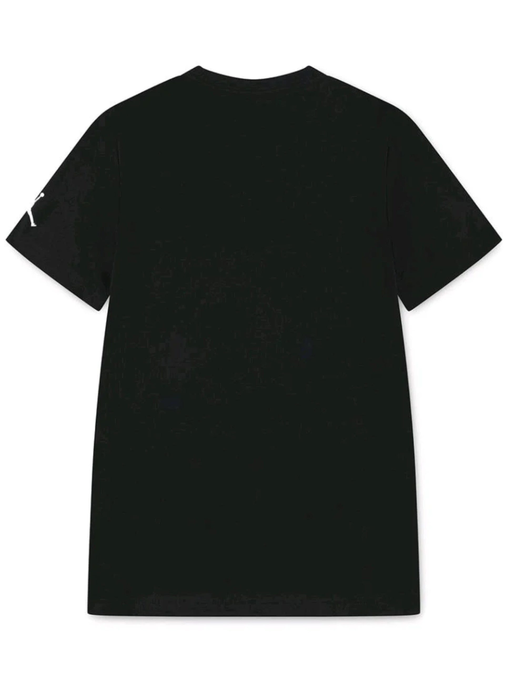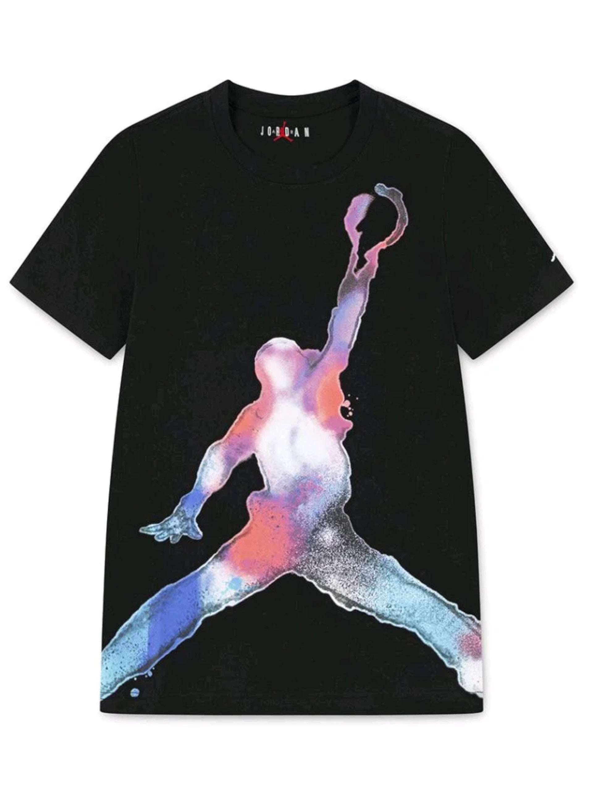 Maglia Jordan nera da bambino maxi stampa fluo Jumpman 95D820, realizzata in cotone. Questa t-shirt Jordan nera girocollo ha le maniche corte e la maxi stampa fluo Jumpman sul davanti.