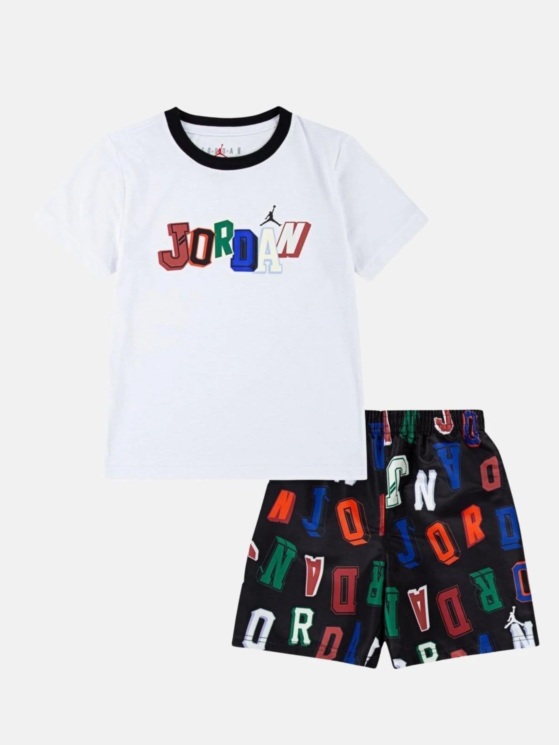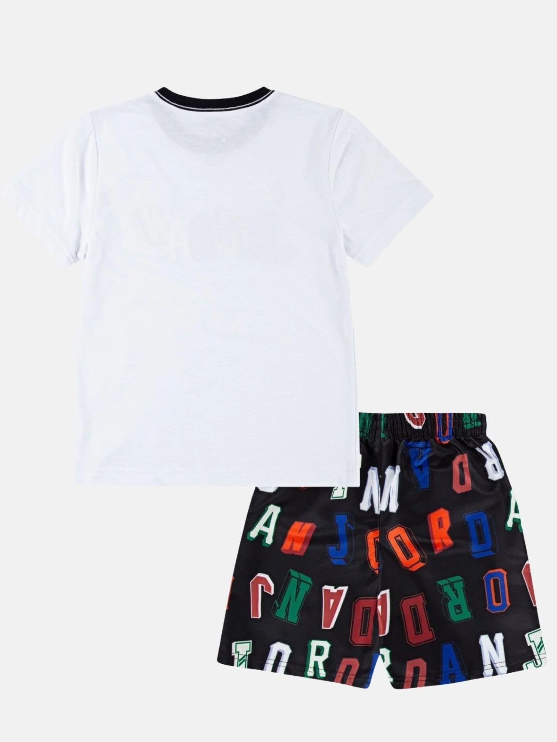 Tuta Jordan bianca e nera da neonato Court Of Legends 65D705. La t-shirt di questo completo Jordan girocollo ha le maniche corte e la maxi stampa gommata sul davanti. I pantaloncini di questo completino Jordan hanno la banda elastica sul punto vita, il logo Jumpman ricamato sul fondo e la stampa logo all over.