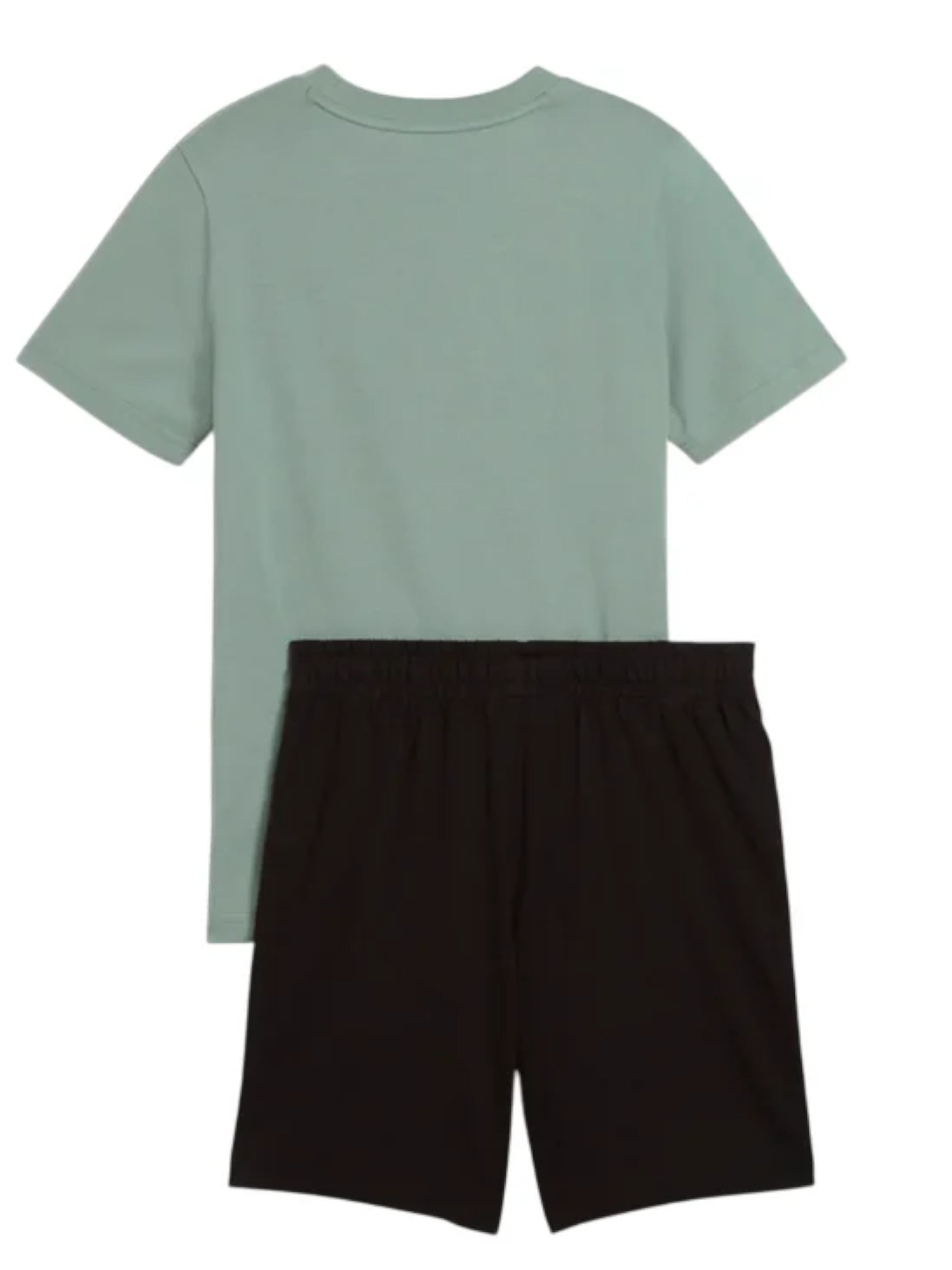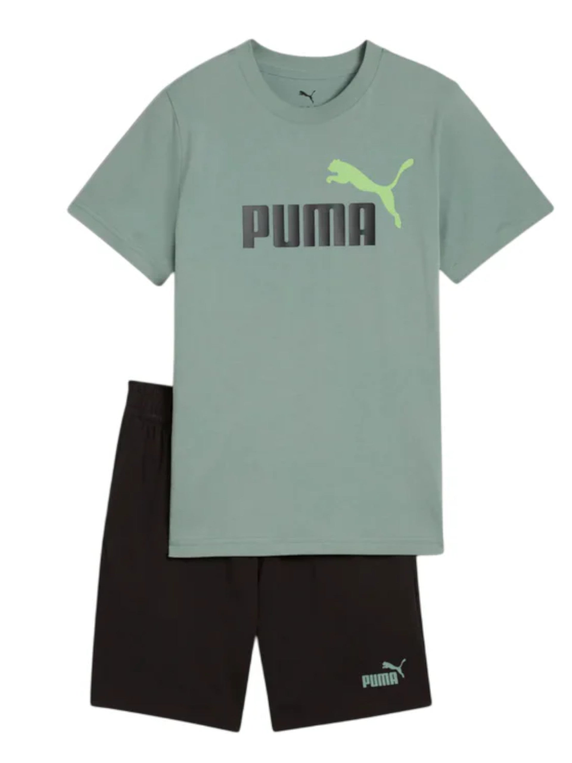 Tuta Puma verde e nera da bambino con bermuda 686298. La t-shirt di questo completino Puma ha le maniche corte e la maxi stampa sul davanti a contrasto colore. I pantaloncini di questo completo Puma hanno la banda elastica sul punto vita, due tasche laterali aperte e il logo applicato sul fondo.