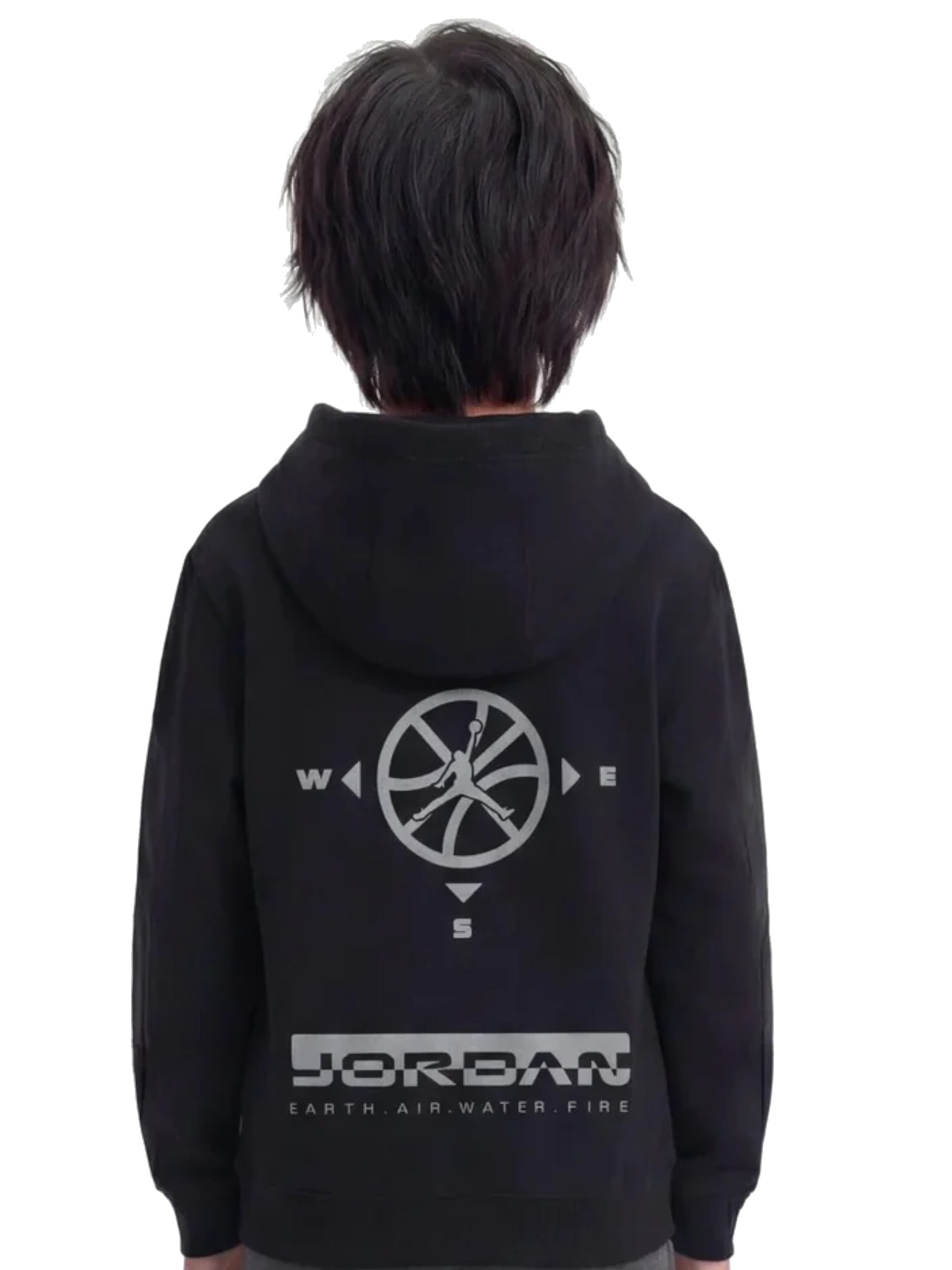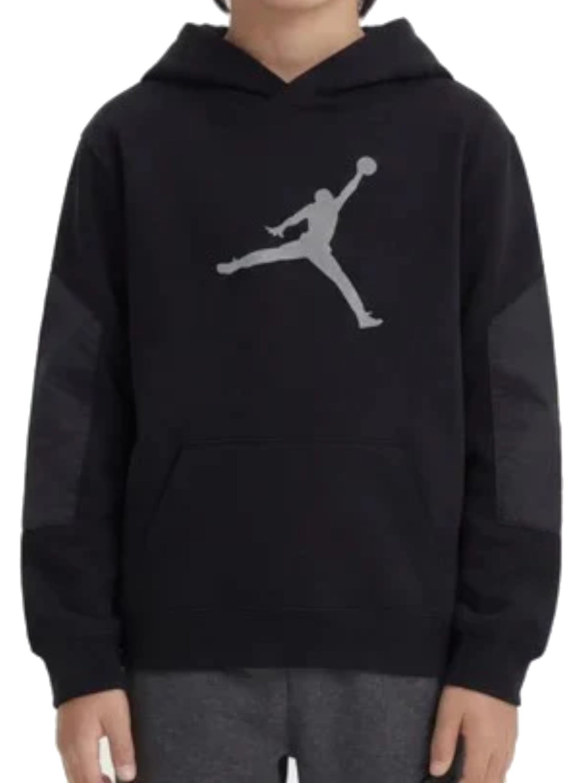 Felpa nera da bambino con cappuccio Jordan con maxi stampa. Questa falpa nera, realizzata in morbido cotone, perfetta per la stagione primaverile, è caratterizzata dal cappuccio fisso, l'iconi maxi logo Jordan sul davanti, sul retro troviamo la maxi stampa, tasche a marsupio, polsini e fondo elasticizzati