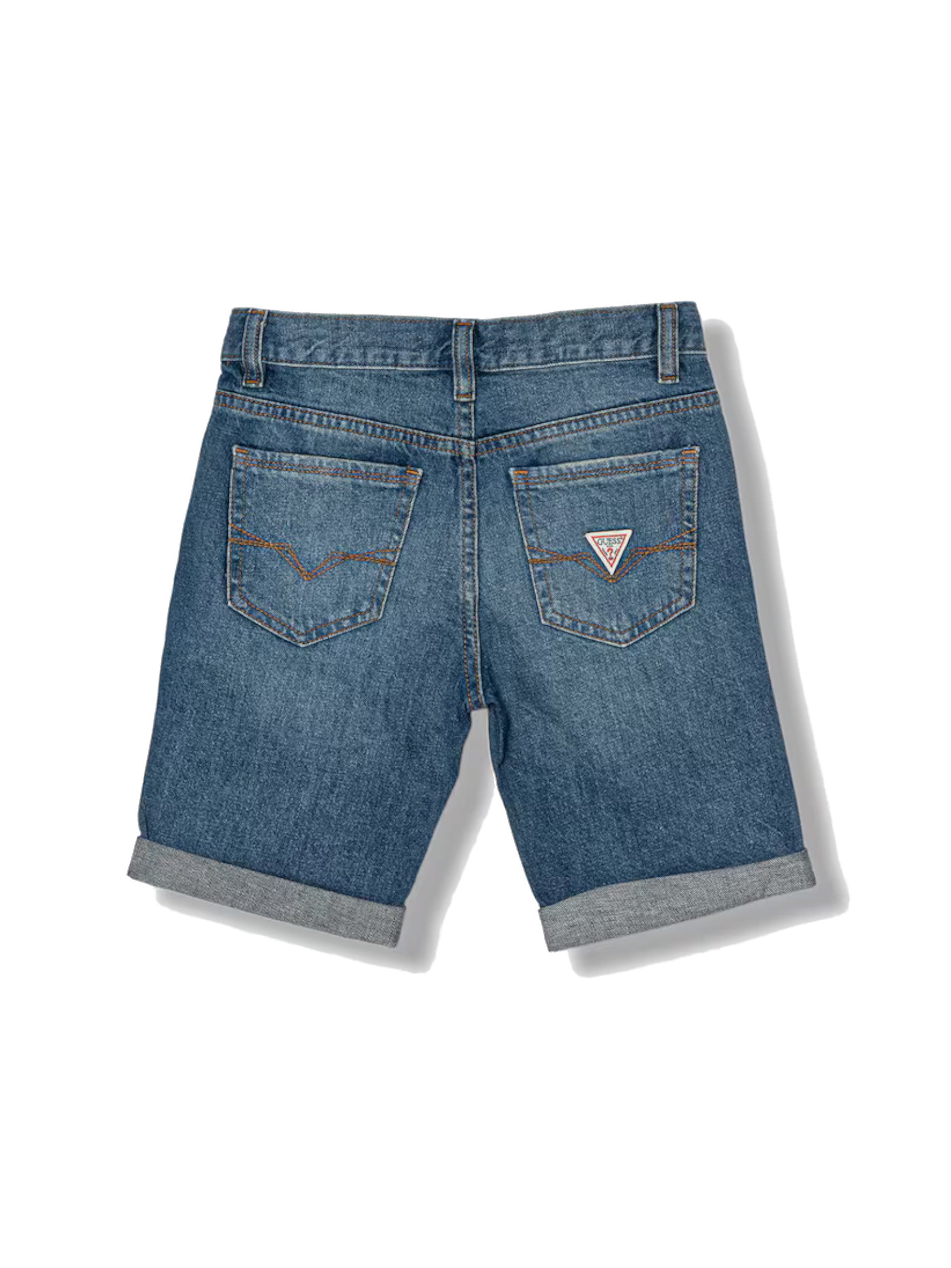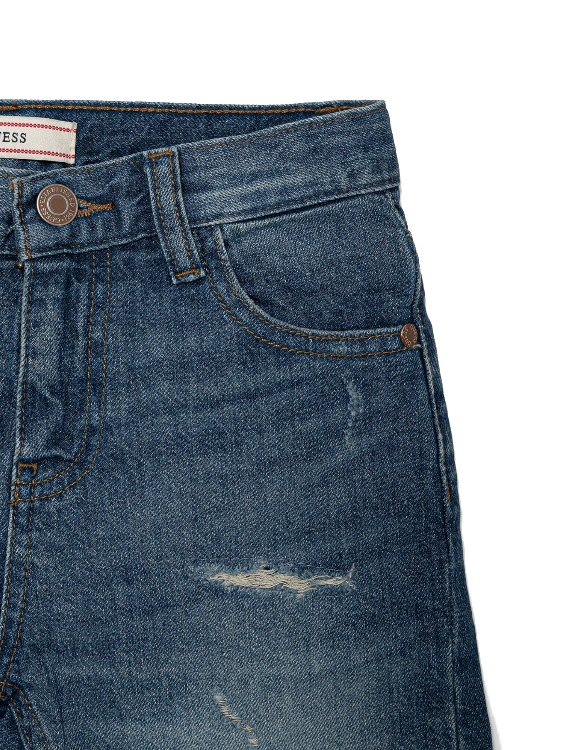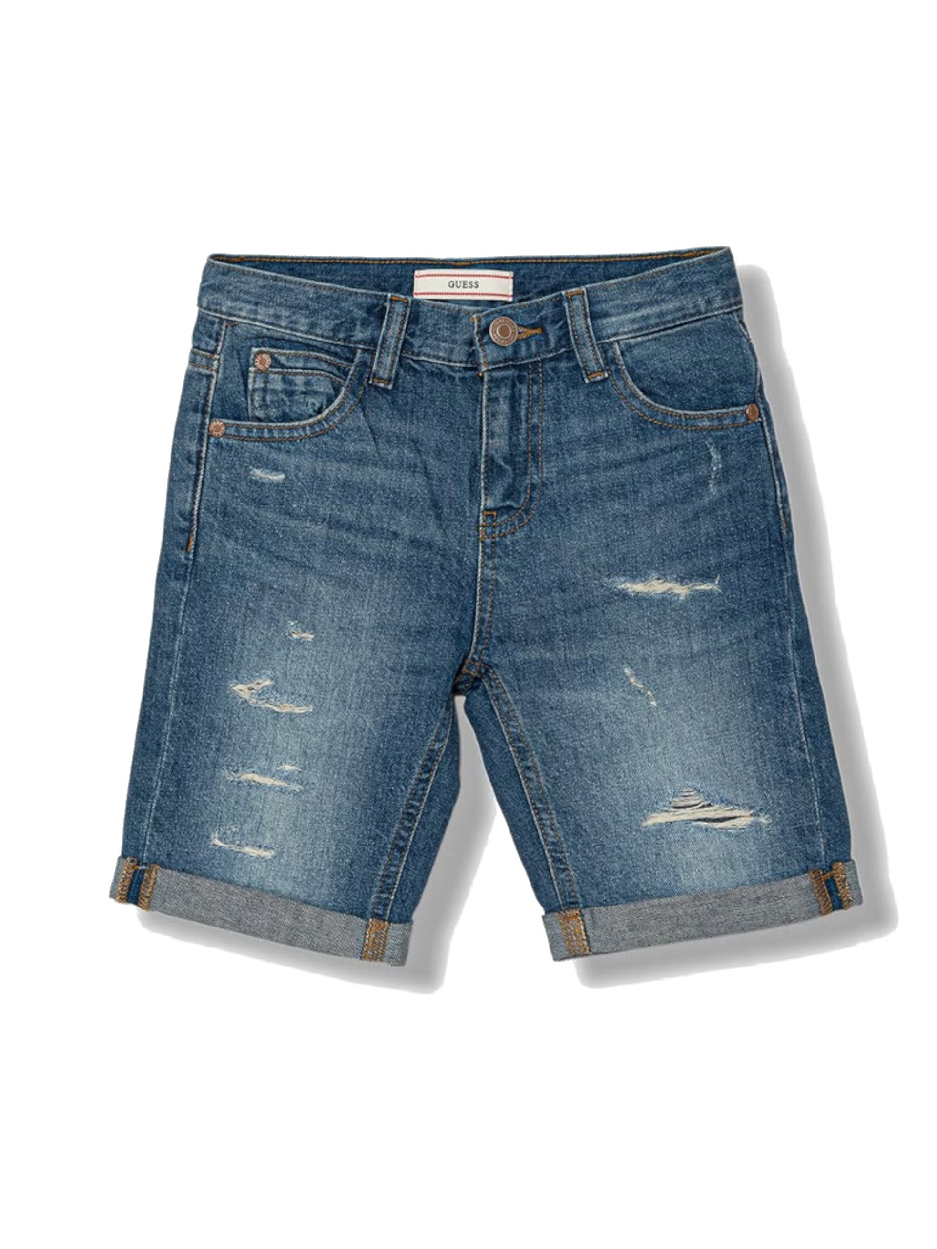 Pantaloncini Jeans Guess da bambino con strappi. Questi bermuda da bambino, realizzati in cotone, perfetti per la stagione primavera-estate, e perfetti per un outfit casual ed elegante, sono caratterizzati dalla chiusura con bottone più zip, passanti per la cintura, due tasche laterali e due tasche a filo sul retro e logo Guess applicata sulla tasca destra sul retro.