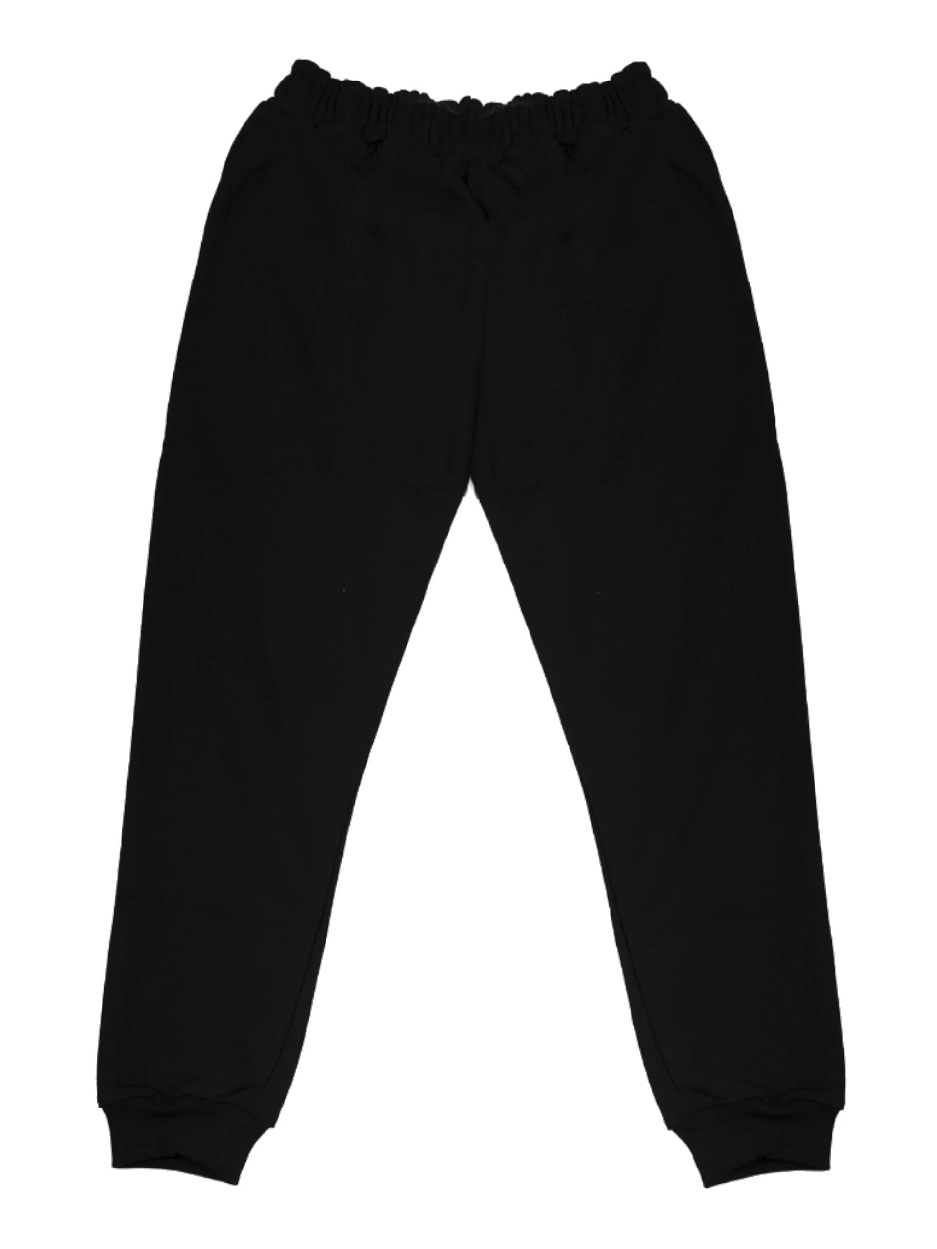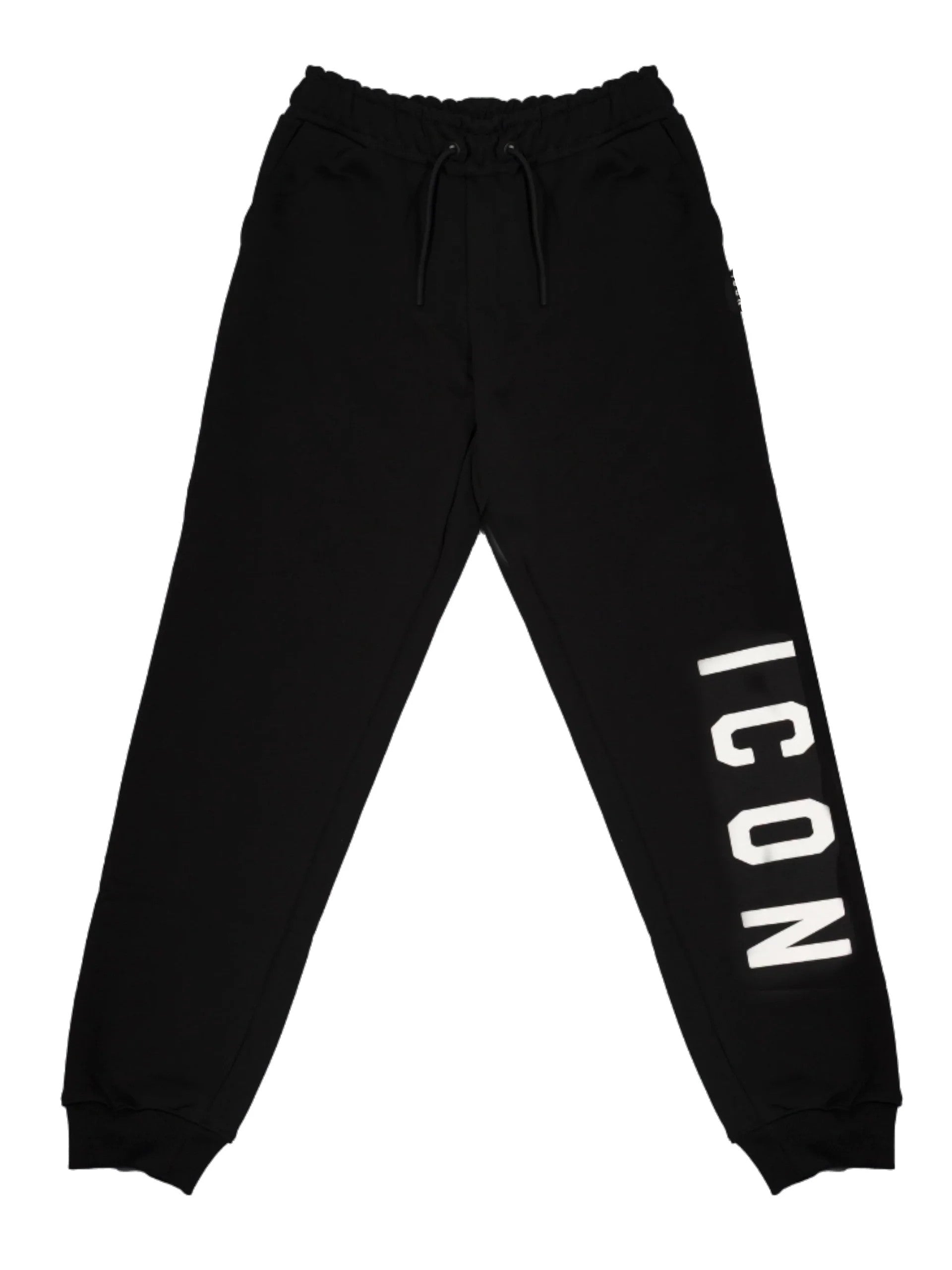 Pantaloni tuta neri da bambino Icon. Questi pantaloni, realizzati in morbido cotone, perfetti per la stagione primavera-estate e sono perfetti per un look sportivo, hanno la banda elastica sul punto vita con lacci regolabili, due tasche laterali aperte e la maxi scritta Icon bianca applicata sulla gamba a sinistra.