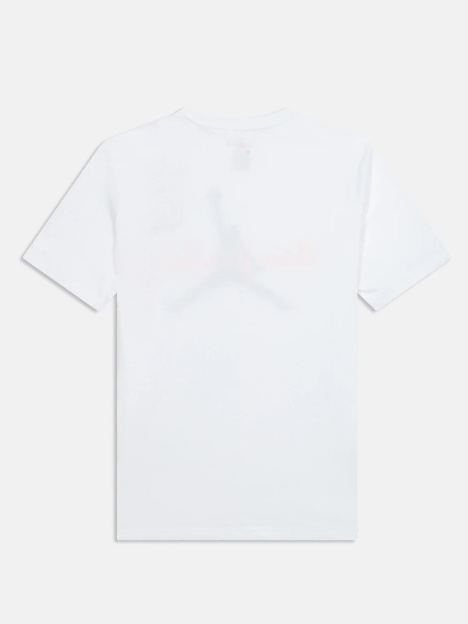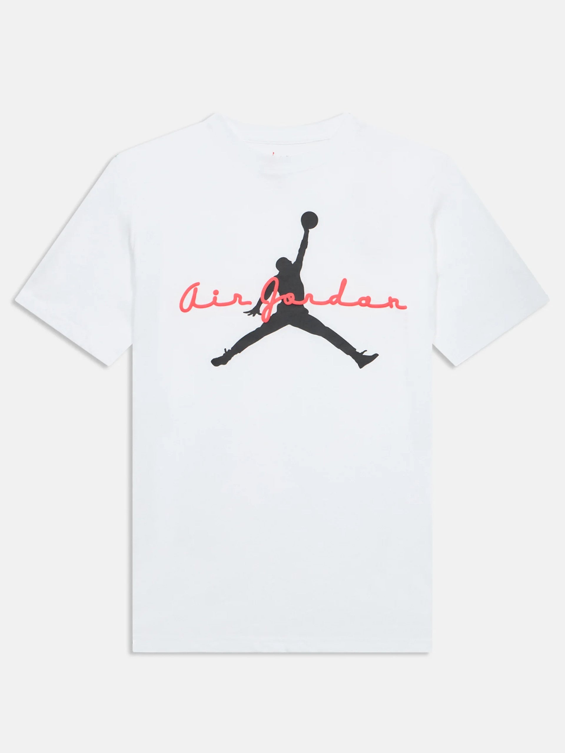 T-shirt Jordan bianca da bambino Essentials Script maxi logo. Questa T-shirt bianca da bambino, realizzata in cotone, perfetto per la stagione primavera-estate, è caratterizzata dal girocollo, maniche corte, sul davanti troviamo il maxi logo e la scritta Air Jordan rossa