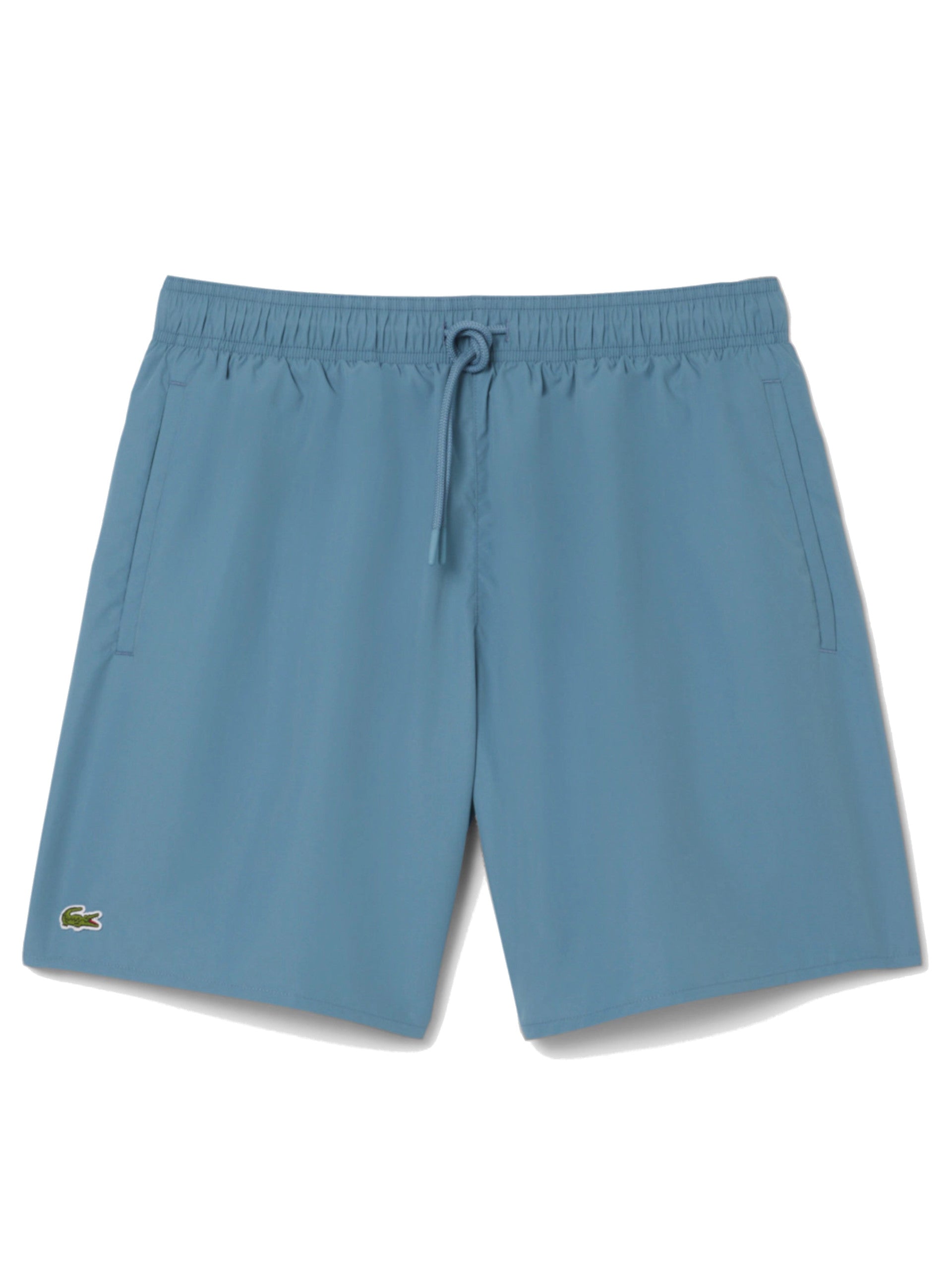 Costume mare Lacoste celeste da uomo con coccodrillo MH9088. Questo costume Lacoste celeste ha la banda elastica sul punto vita regolabile con laccetti, due tasche laterali aperte, una tasca posteriore e l'iconico coccodrillo a contrasto colore.
