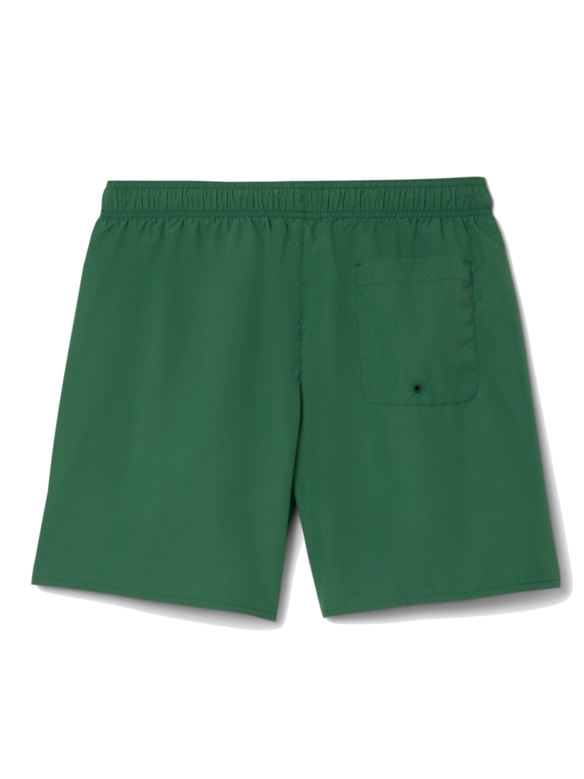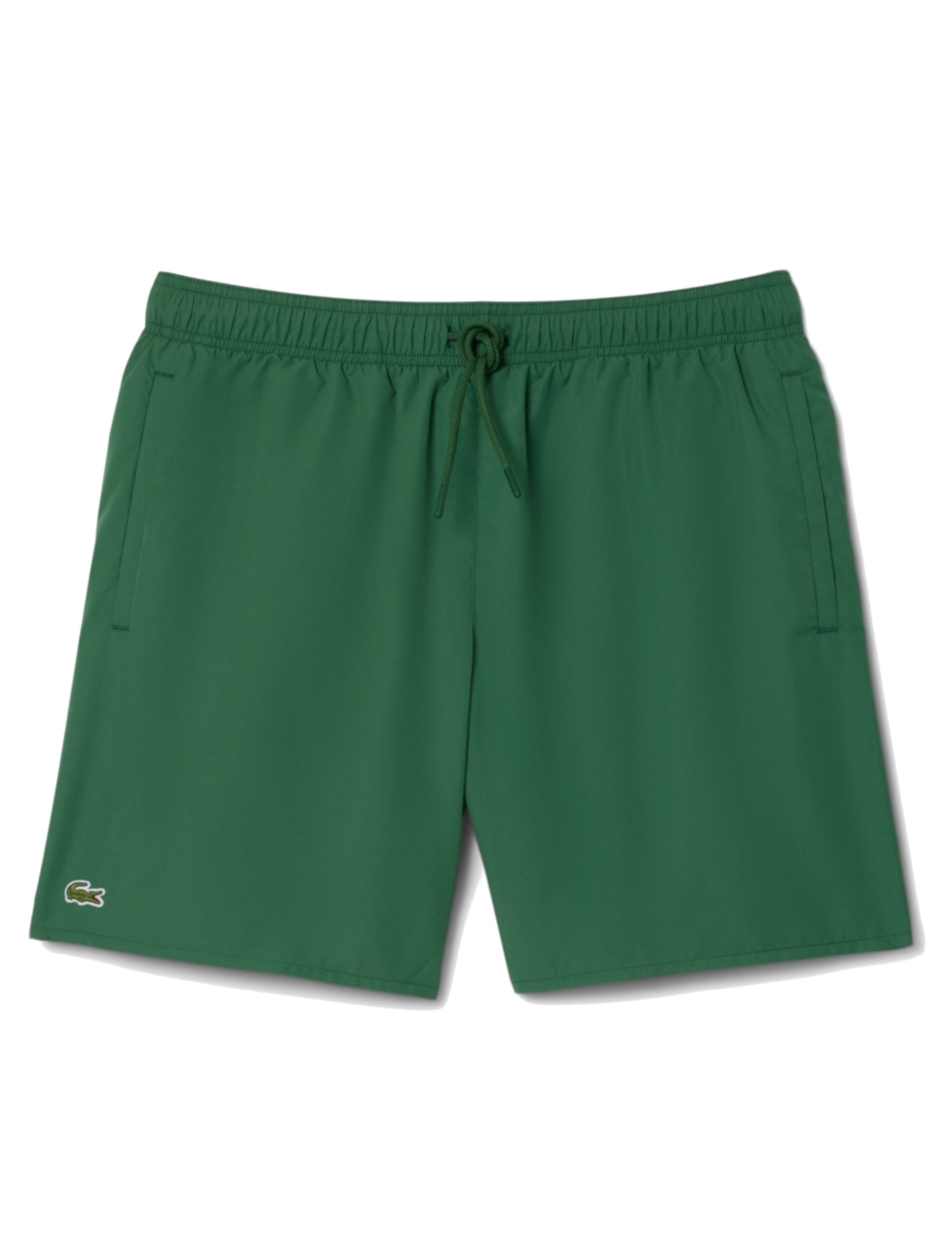 Costume mare Lacoste verde da uomo con coccodrillo MH9088. Questo costume Lacoste verde ha la banda elastica sul punto vita regolabile con laccetti, due tasche laterali aperte, una tasca posteriore el'iconico coccodrillo a contrasto colore.