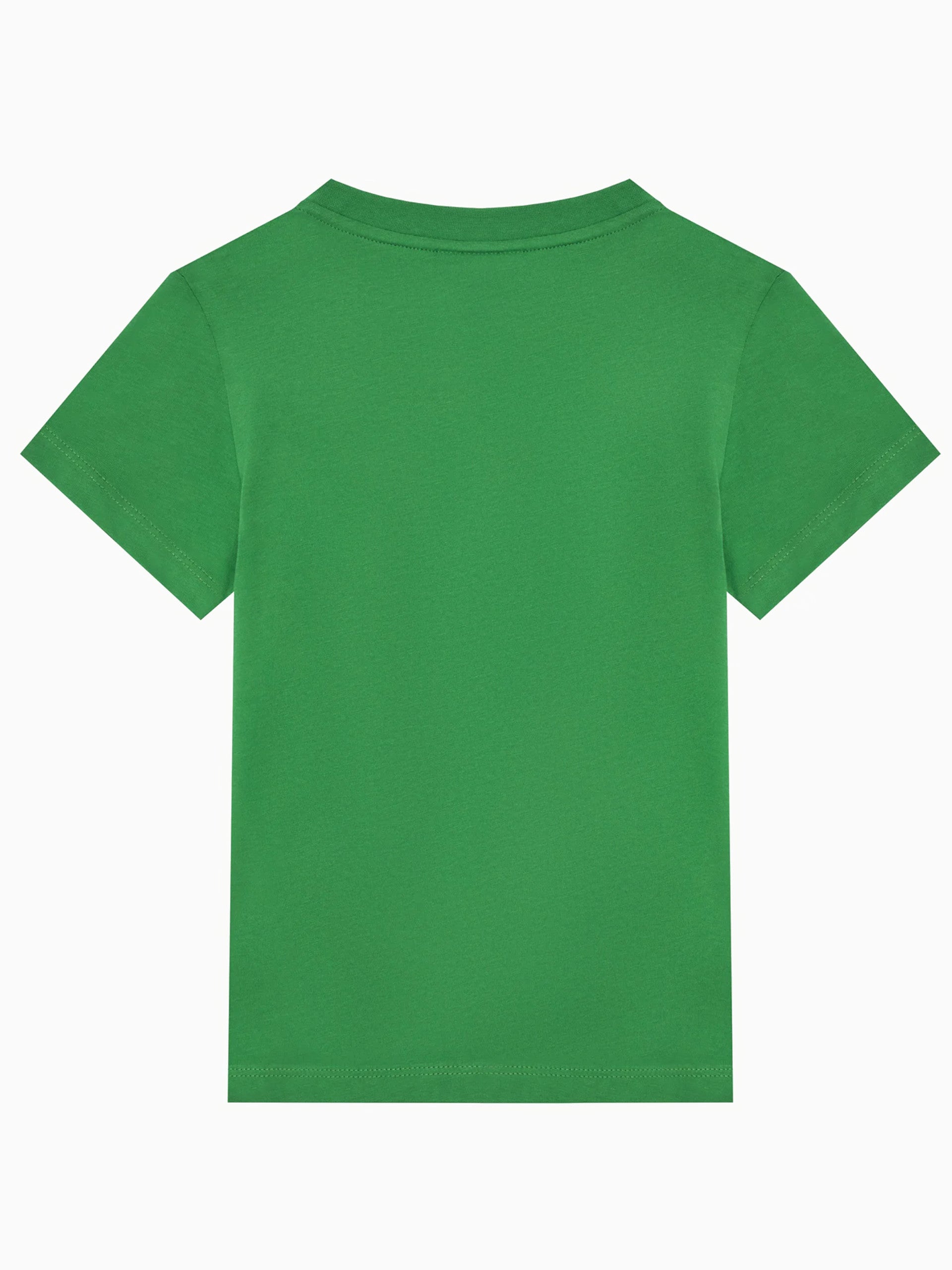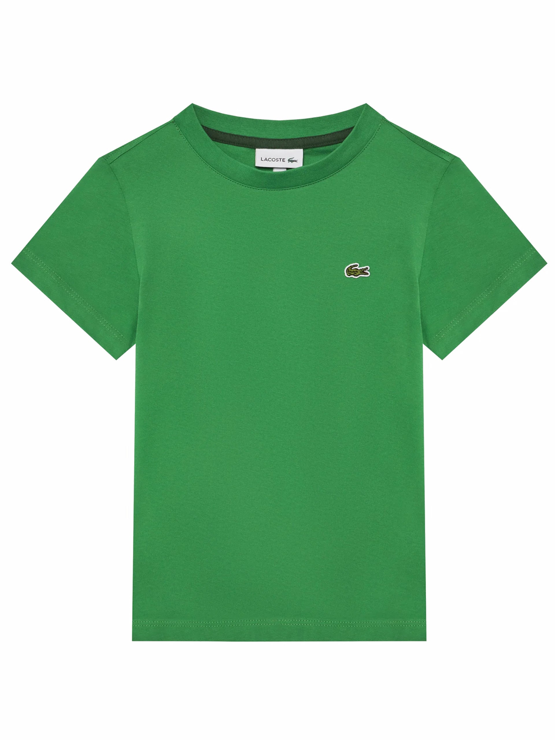 Maglia Lacoste verde da bambino maniche corte TJ1122, realizzata in 100% puro cotone. Questa maglia Lacoste verde girocollo ha le maniche corte, il fondo regolare e l'iconico coccodrillo del brand applicato sul cuore a contrasto colore.