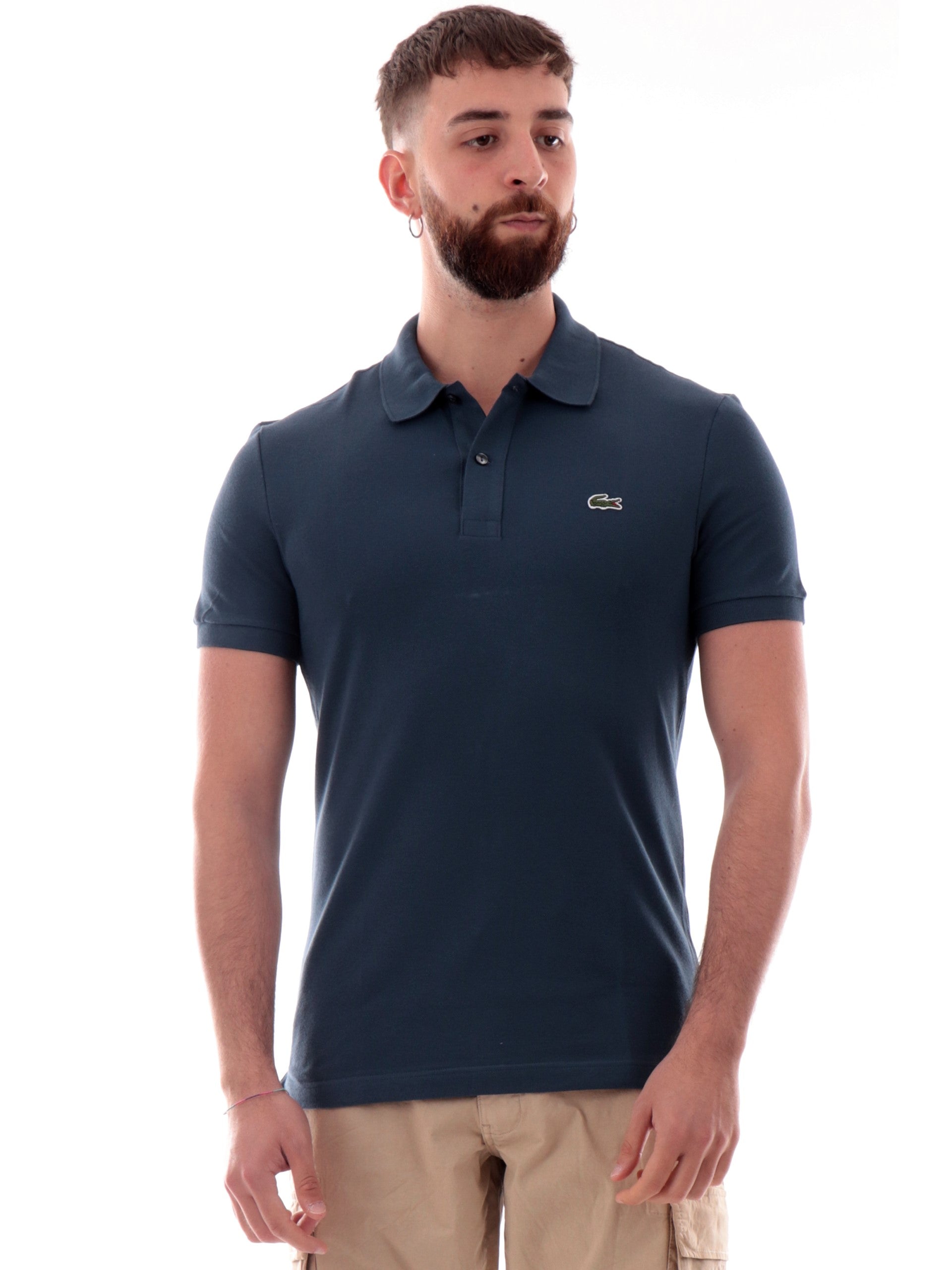 Polo Lacoste blu da uomo slim Fit 4012, realizzata in 100% puro cotone. Questa polo Lacoste blu ha il colletto tradizionale, le maniche corte, la chiusura con tre bottoni e il logo del brand applicato sul cuore a contrasto colore.