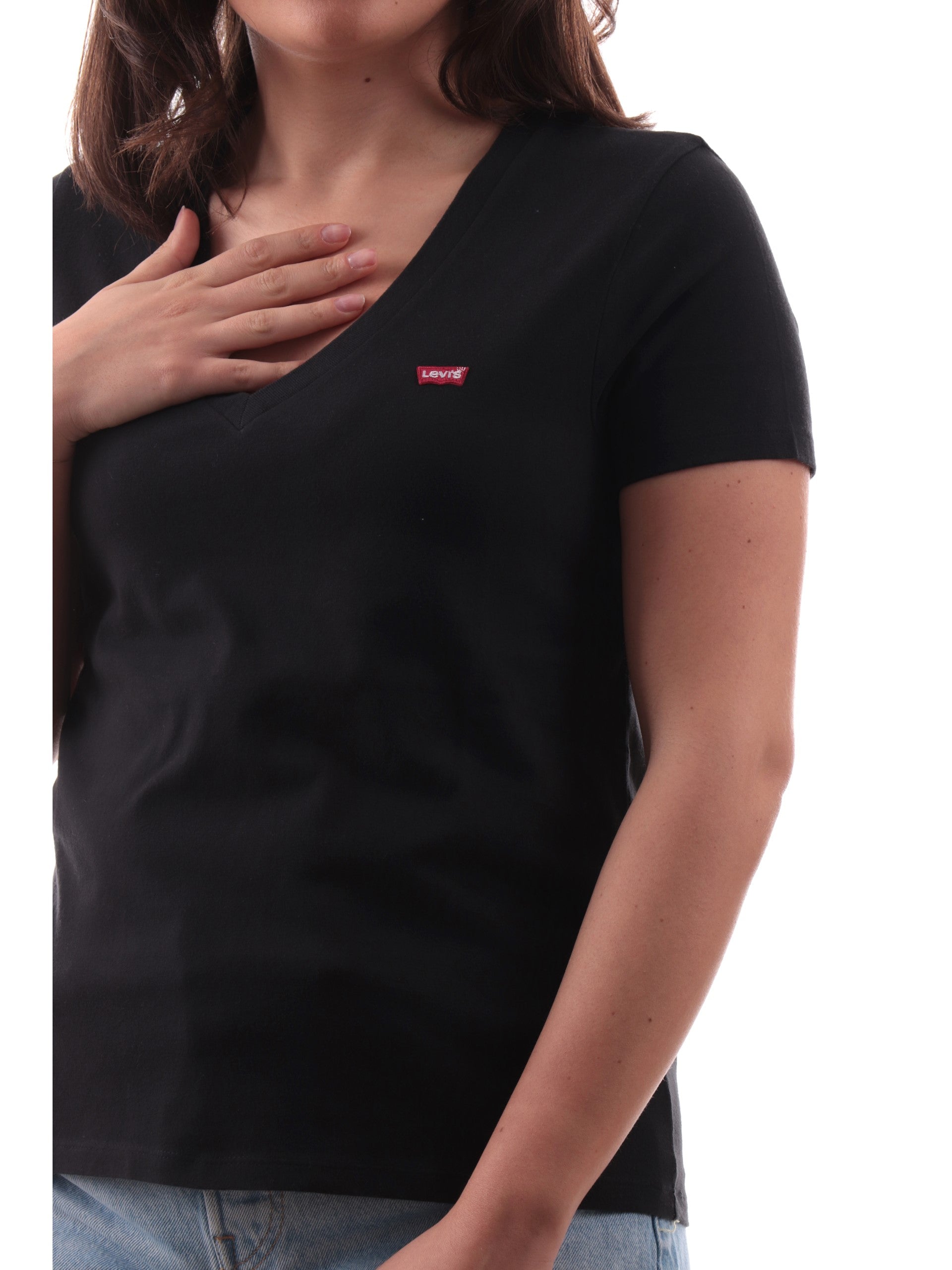 Maglia Levis scollo a V nera da donna con patch Levis rosso 8534100, realizzata in 100% puro cotone. Questa t-shirt Levis nera girocollo ha lo scollo a V, le maniche corte e il patch Levis rosso latocuore.