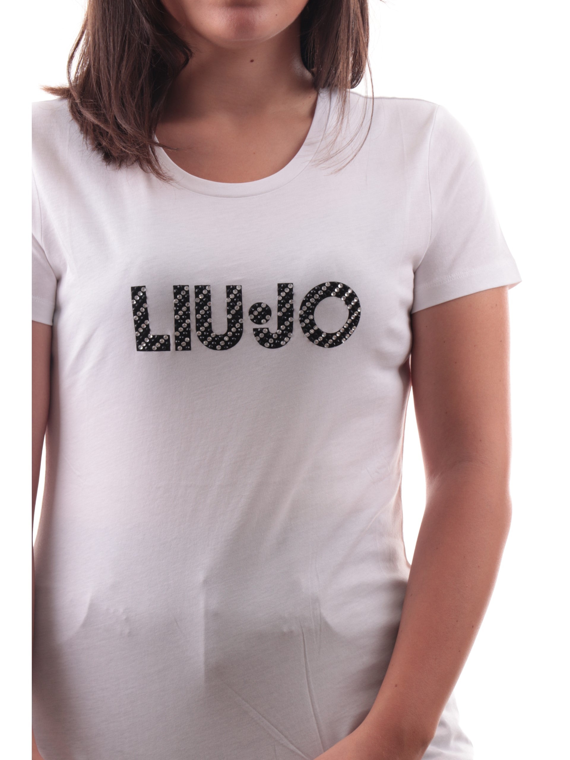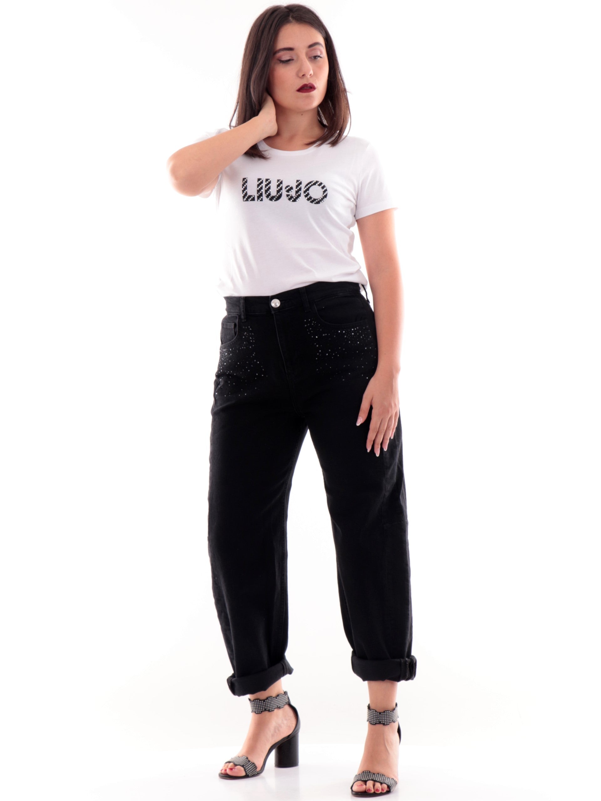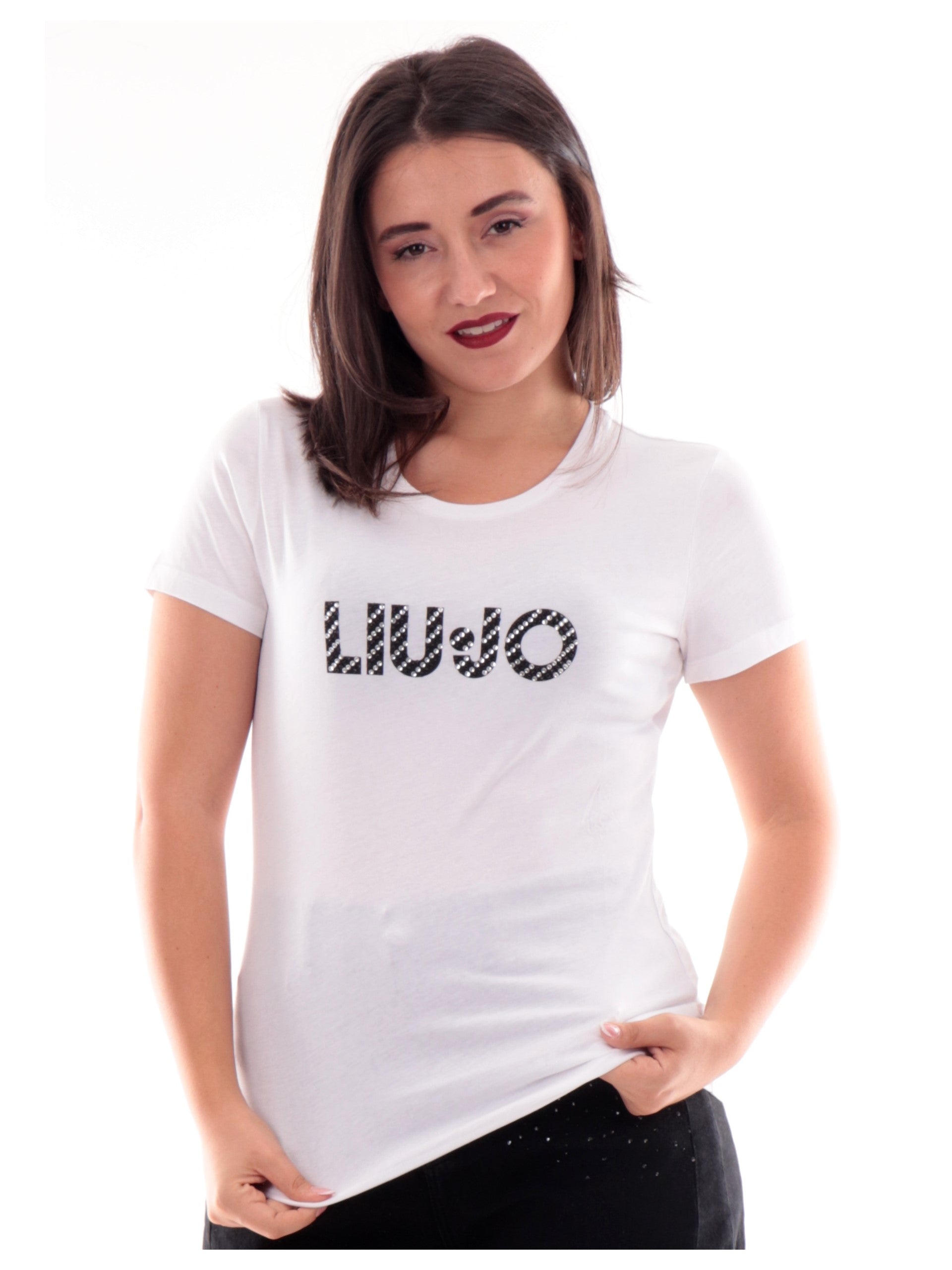 Maglia Liu Jo bianca da donna con logo strass nero e argento UF5266JS904M979
