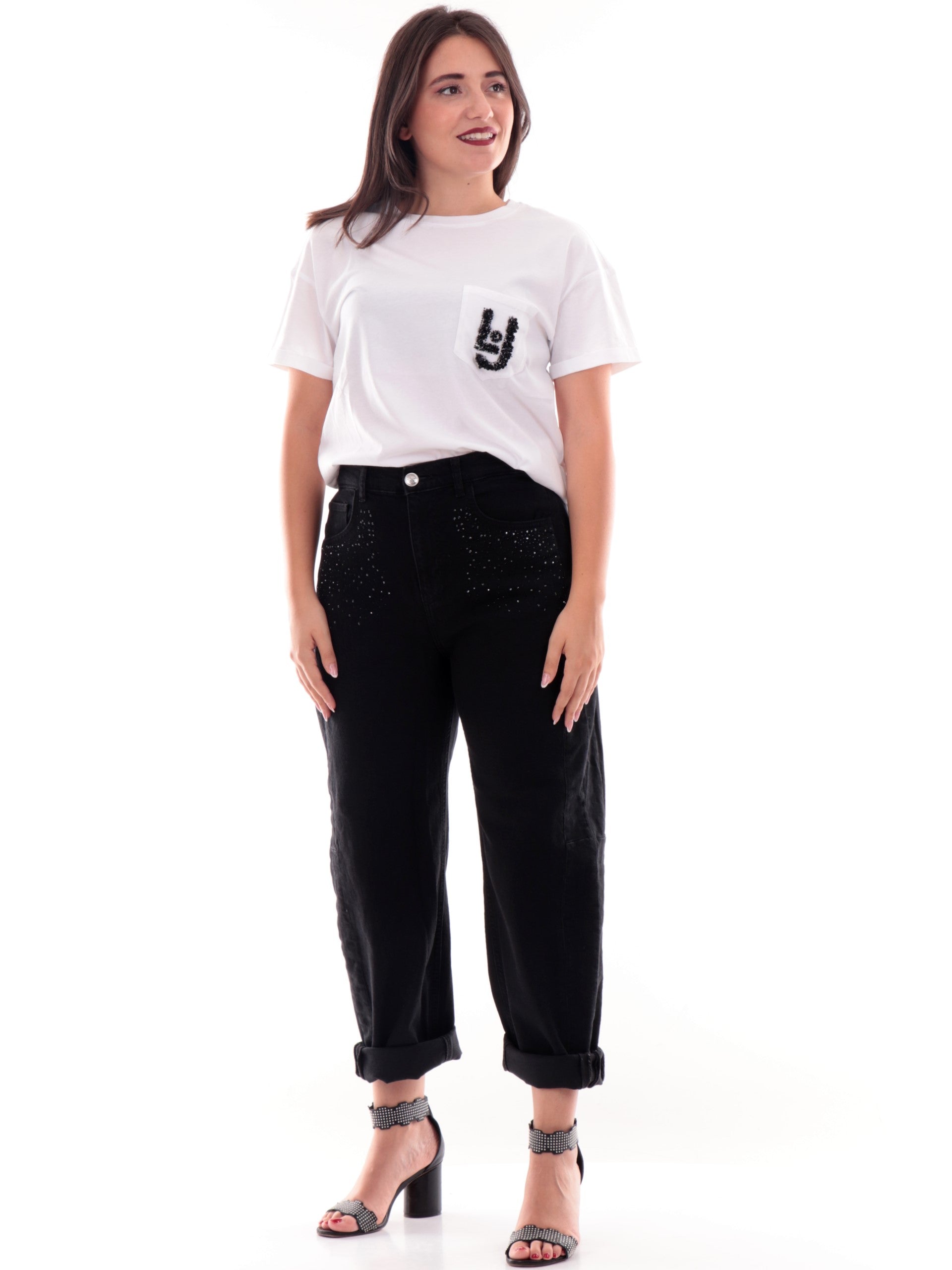 Maglia Liu jo bianca da donna realizzata in morbido cotone elasticizzato con logo monogram strass nero sul taschino. Questa maglia Liu Jo donna è una basic tee perfetta da abbinare come vuoi.