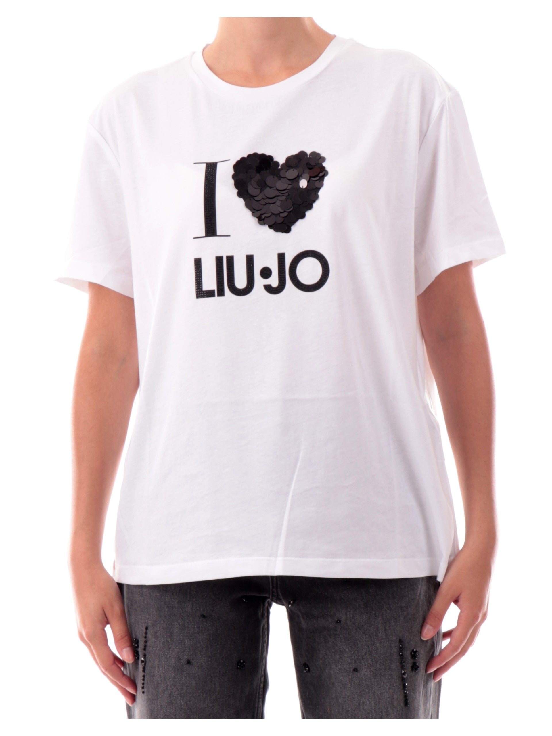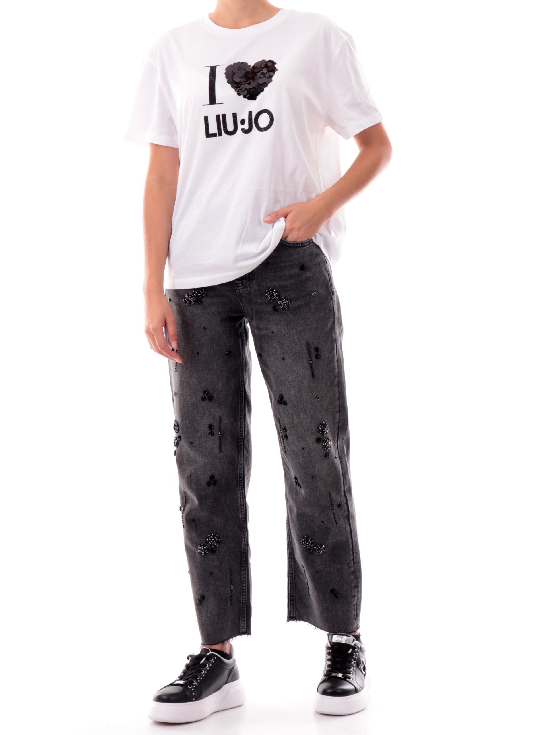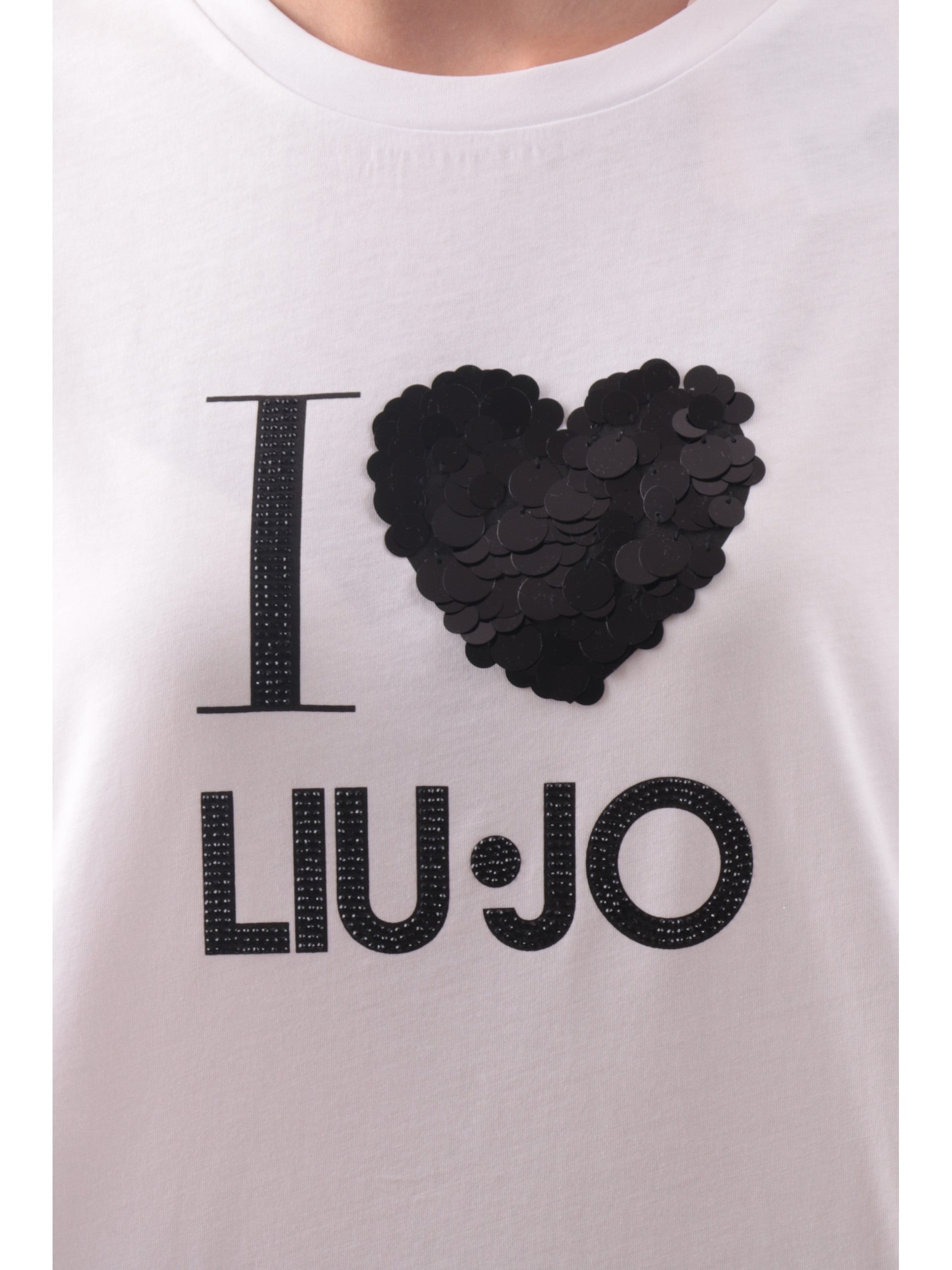 T-shirt Liu Jo bianca da donna girocollo stampa strass e paillettes MF5345JS923