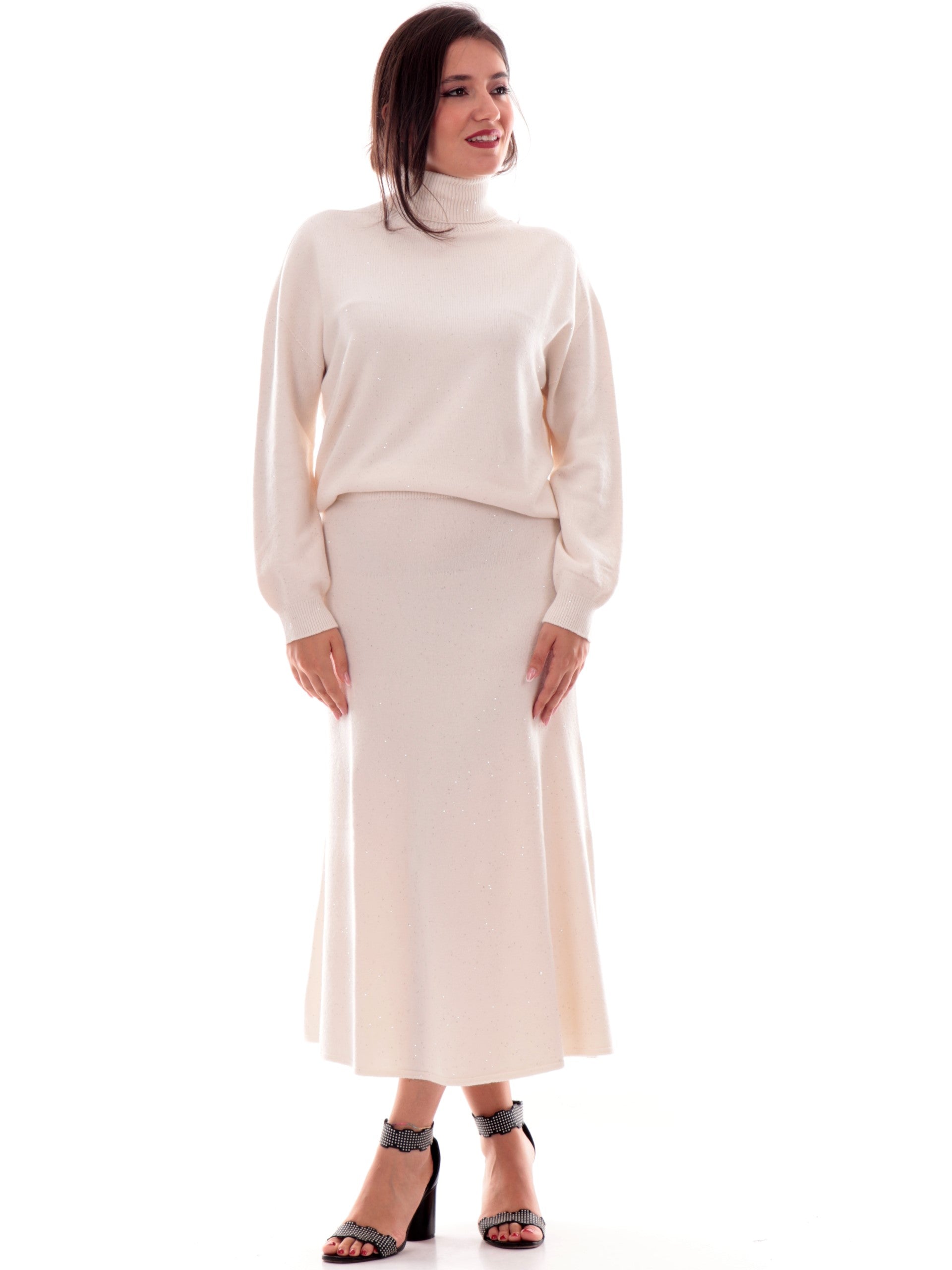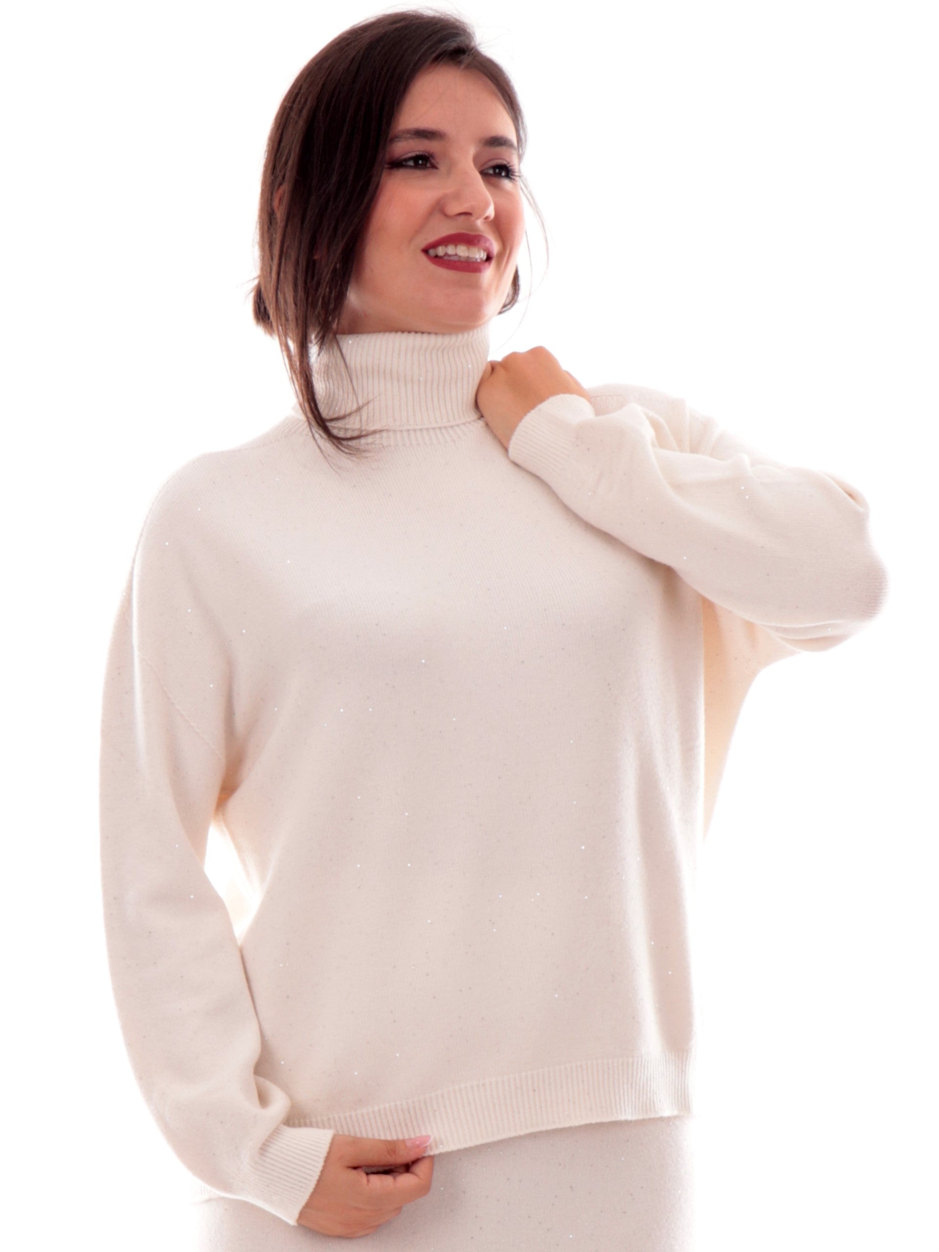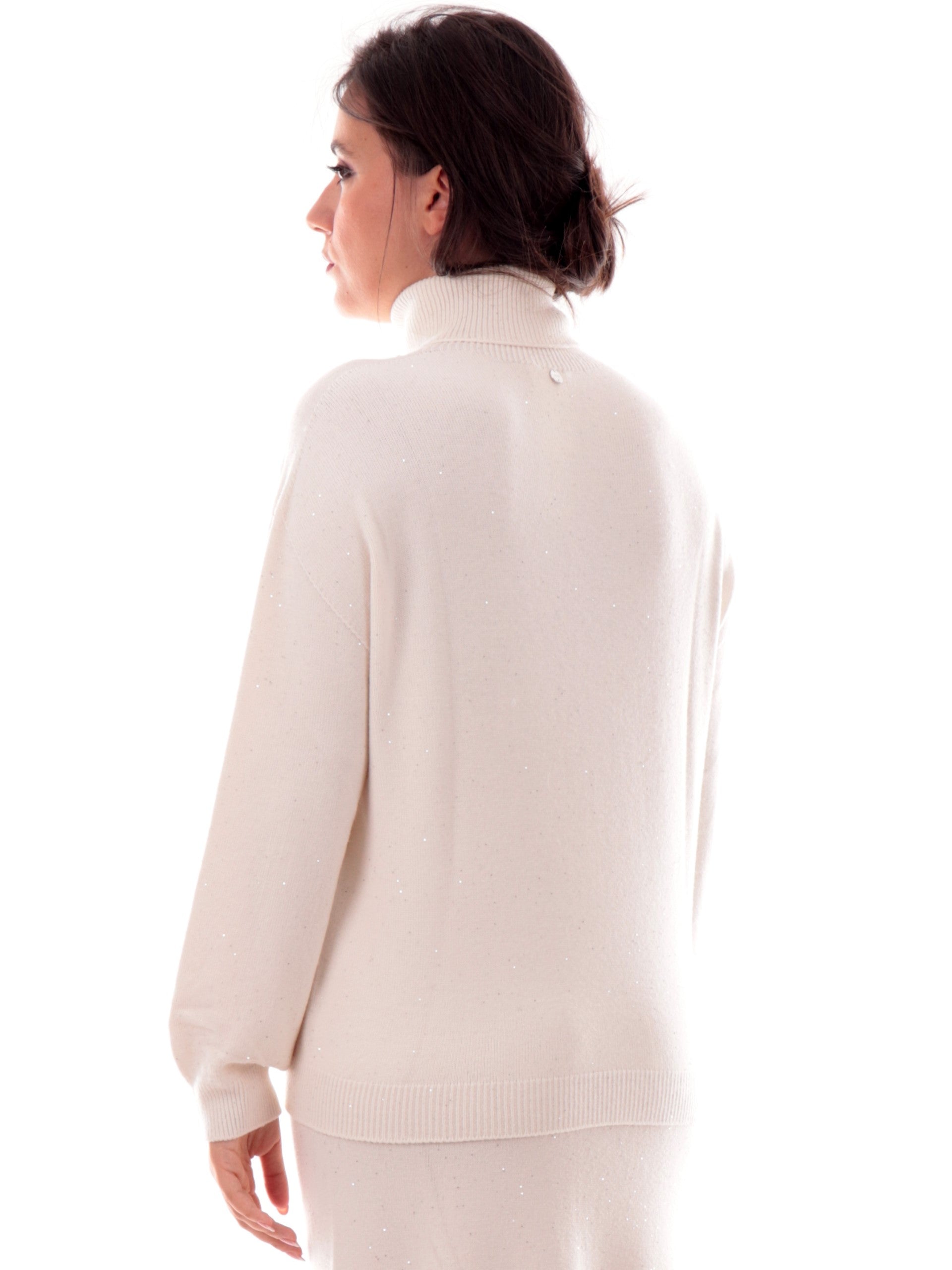 Maglione dolcevita Liu Jo bianco da donna con paillettes MF5234MA27R, realizzato in viscosa. Questo maglione bianco Liu Jo ha lo scollo a V, paillettes all over, polsini e fondo elasticizzati.