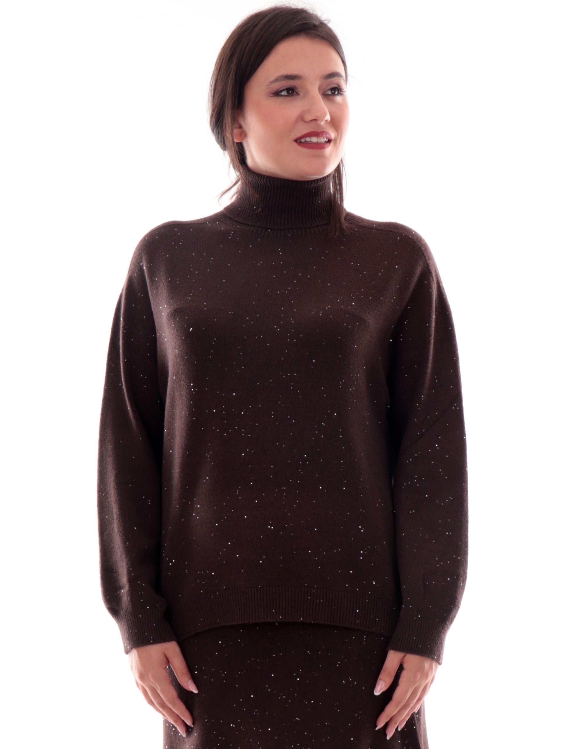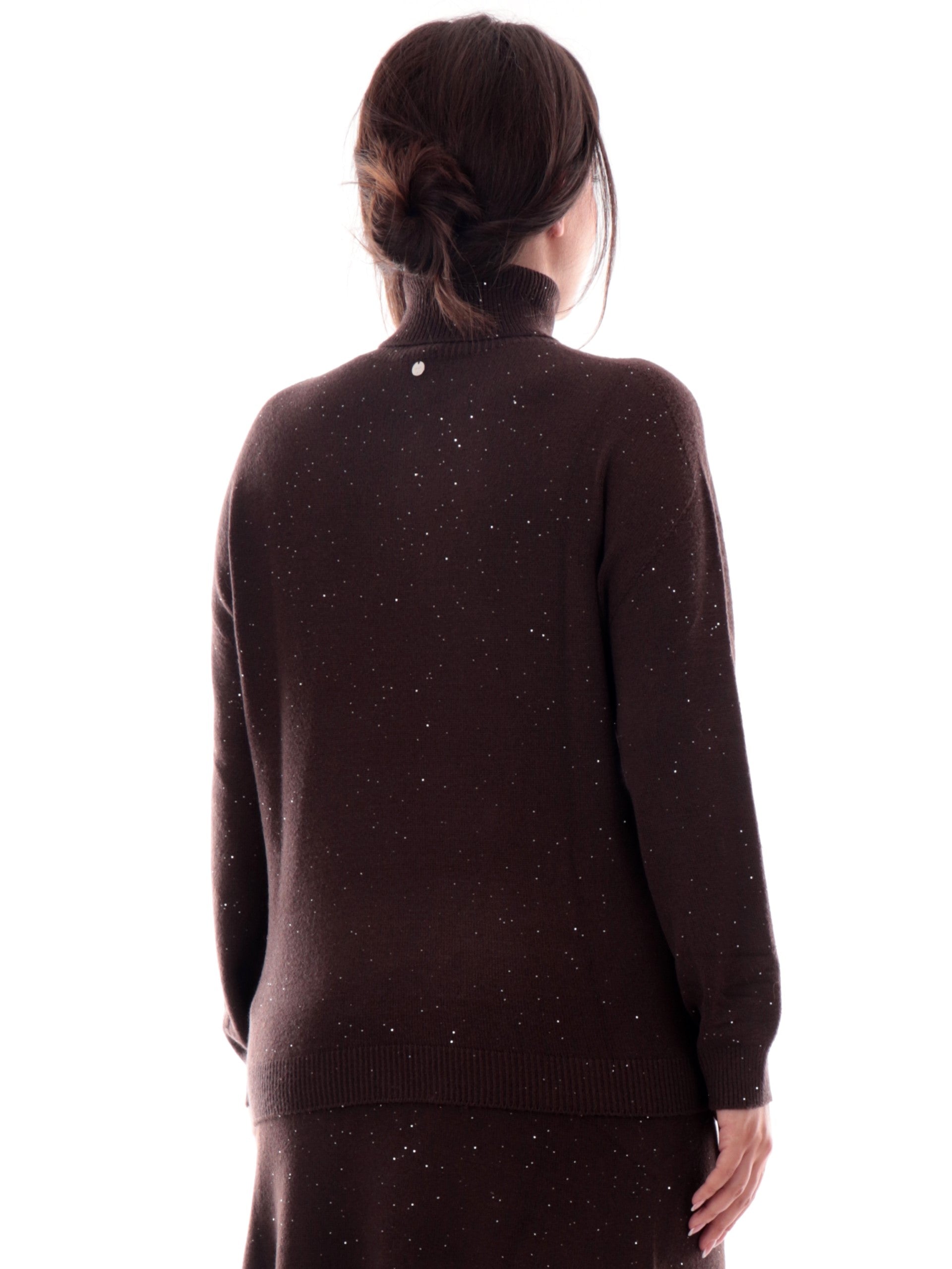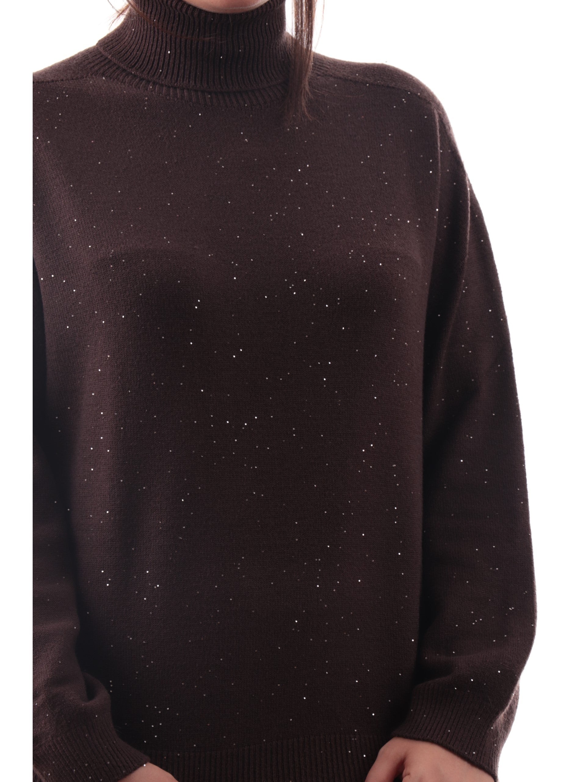 Maglione dolcevita Liu Jo marrone da donna con paillettes MF5234MA27R, realizzato in viscosa. Questo maglione marrone Liu Jo ha lo scollo a V, paillettes all over, polsini e fondo elasticizzati.