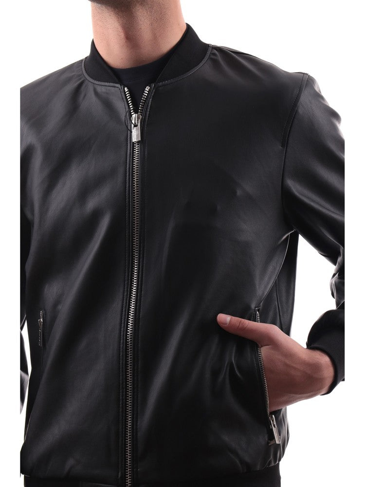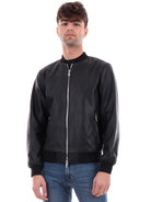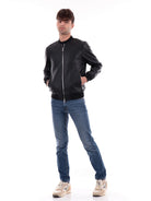 Schwarze Markup-Jacke für Herren MK14005, hergestellt aus weichem, einfarbig beschichtetem Stoff. Diese Markup-Öko-Lederjacke verfügt über einen zentralen durchgehenden Reißverschluss mit doppeltem Logo-Schieber, zwei Seitentaschen mit Reißverschluss und elastische Bündchen an Ärmeln und Saum.