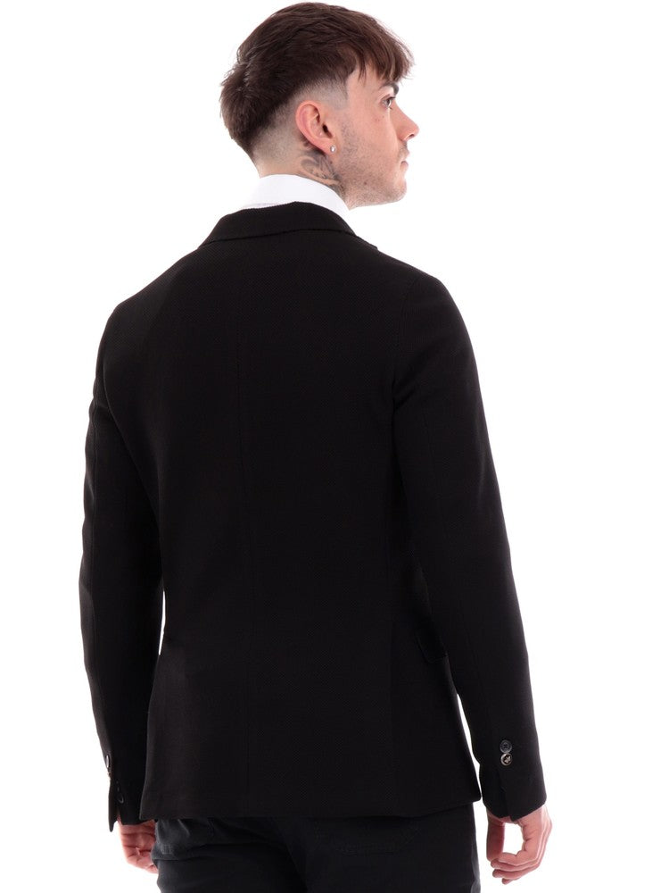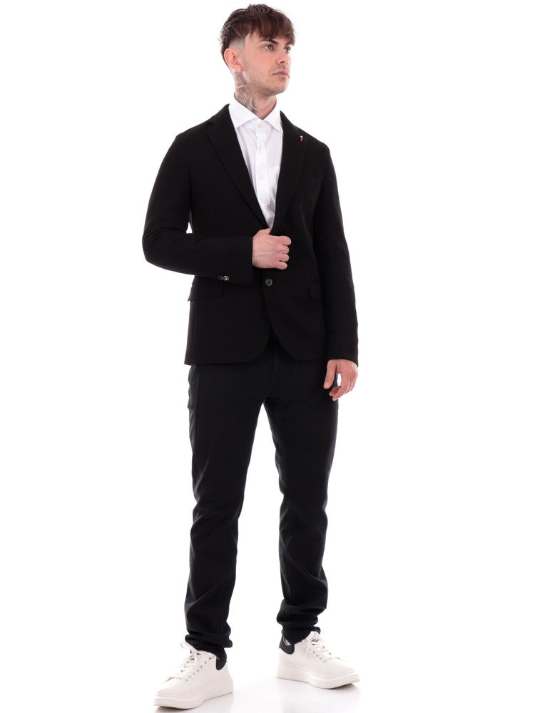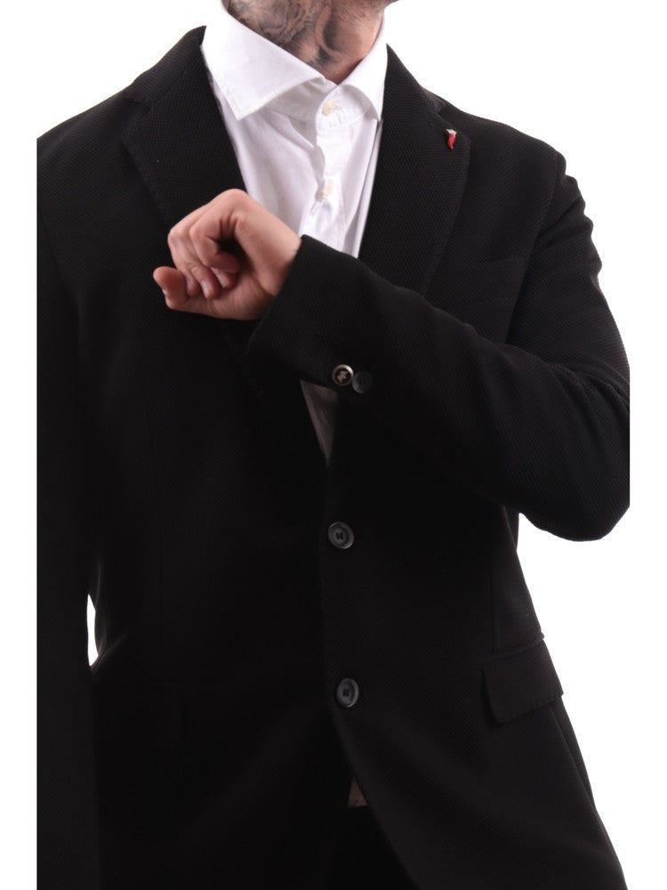 Schwarze Mulish-Jacke für Herren Nido D'Ape CHOGKS900, aus weichem und leichtem Stoff, perfekt für den Sommer. Diese elegante Mulish-Jacke hat einen breiten Kragen, einen Knopfverschluss, zwei Seitentaschen mit Patte, eine Brusttasche und ein kontrastierendes rotes Horn.