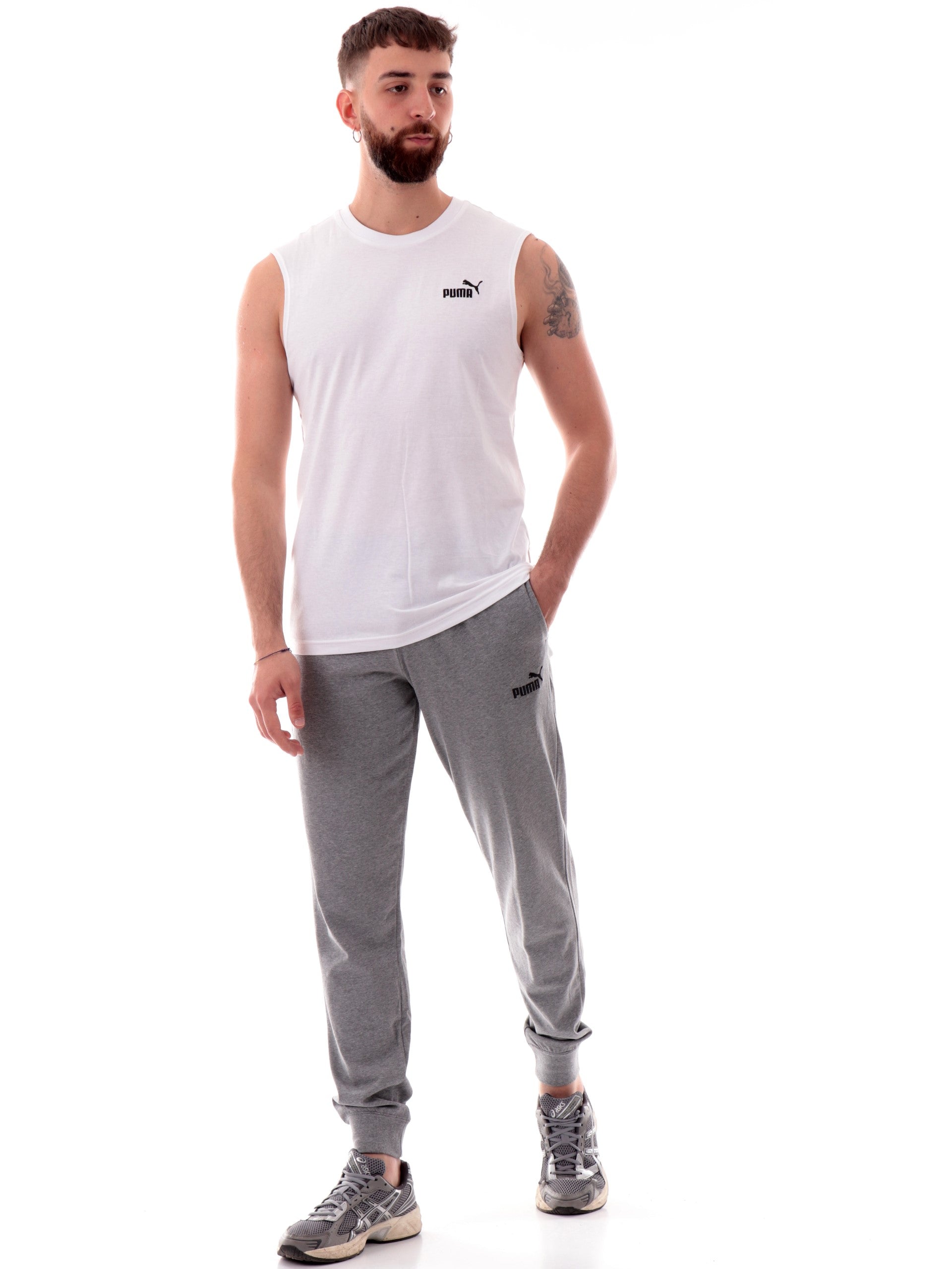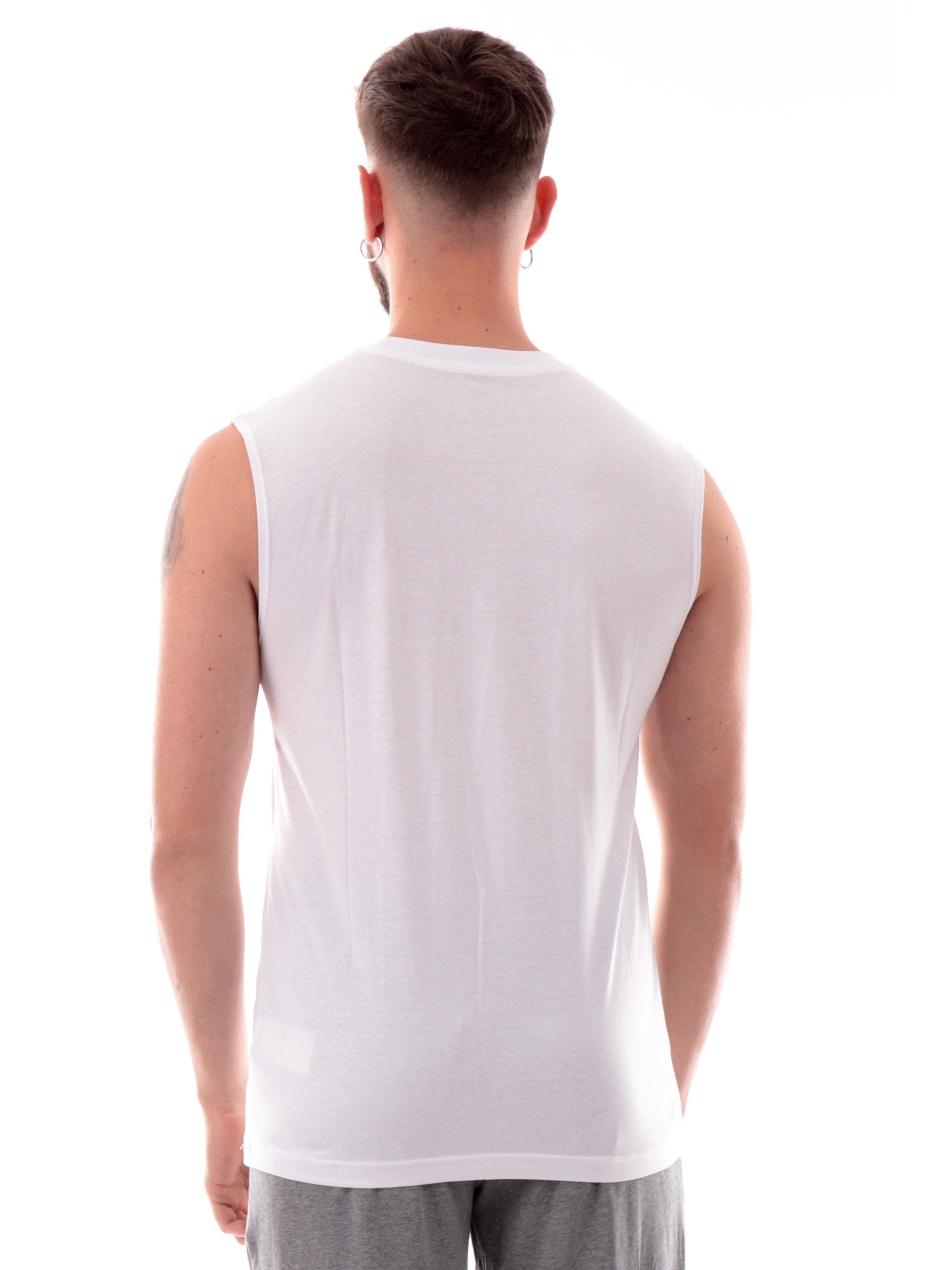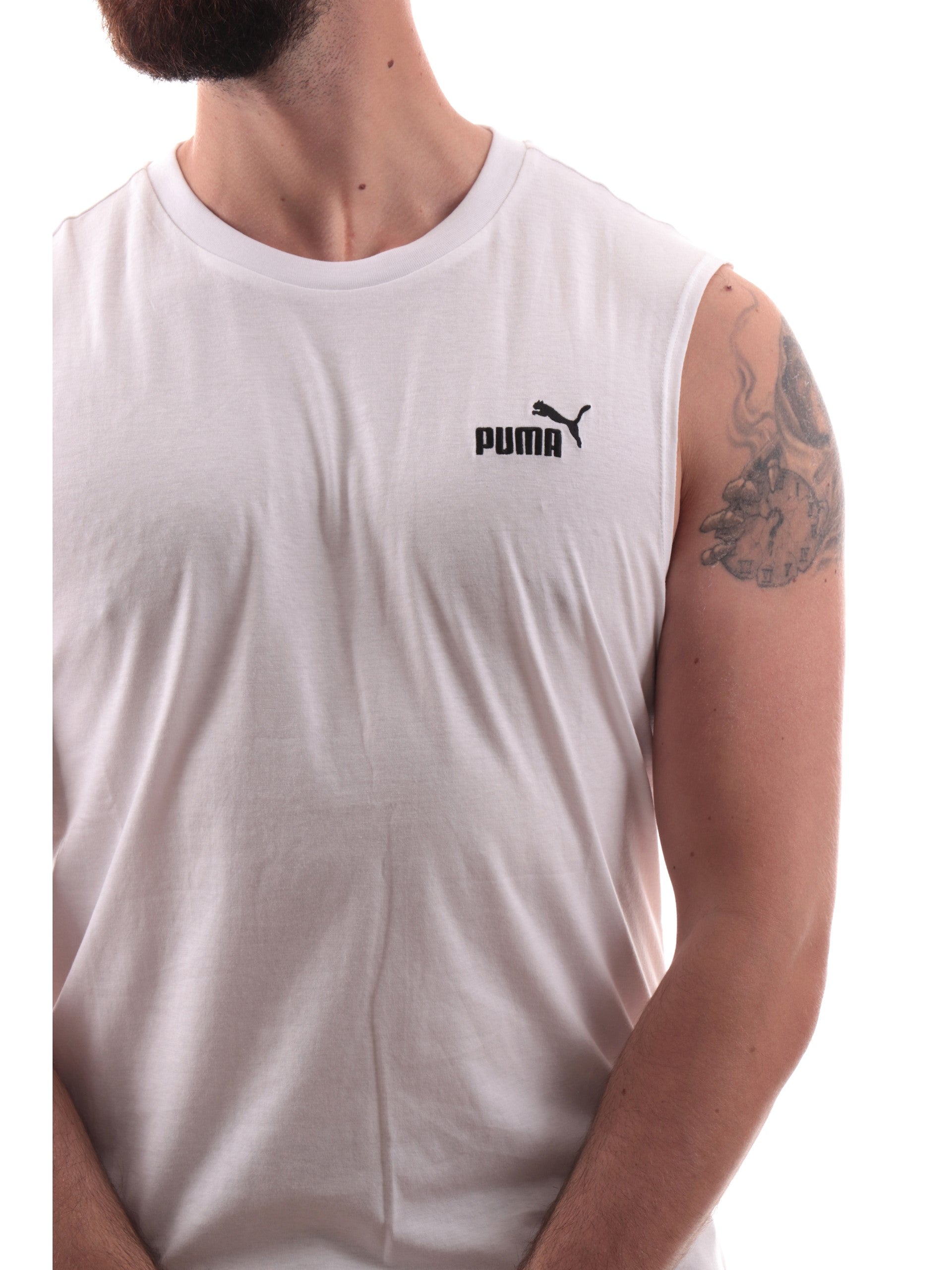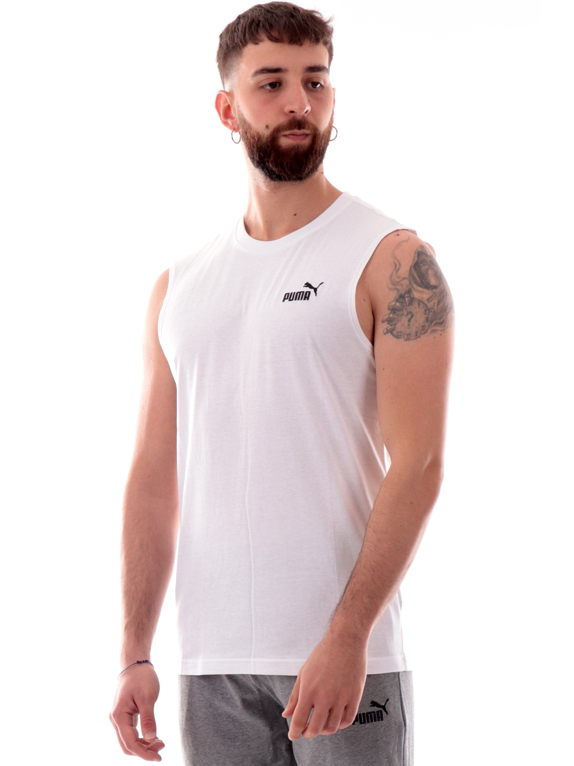 Canotta Puma bianca girocollo da uomo logo a contrasto 682626, realizzata in cotone. Questa maglia smanicata Puma girocollo è caratterizzata dal logo Puma lato cuore.