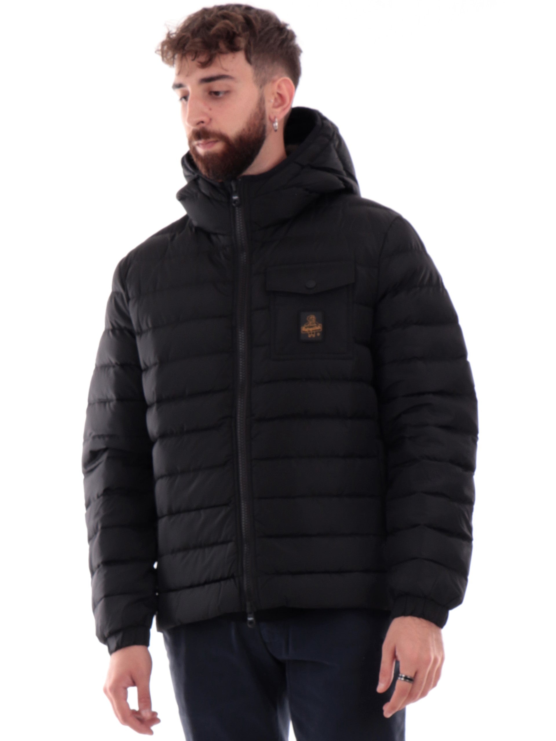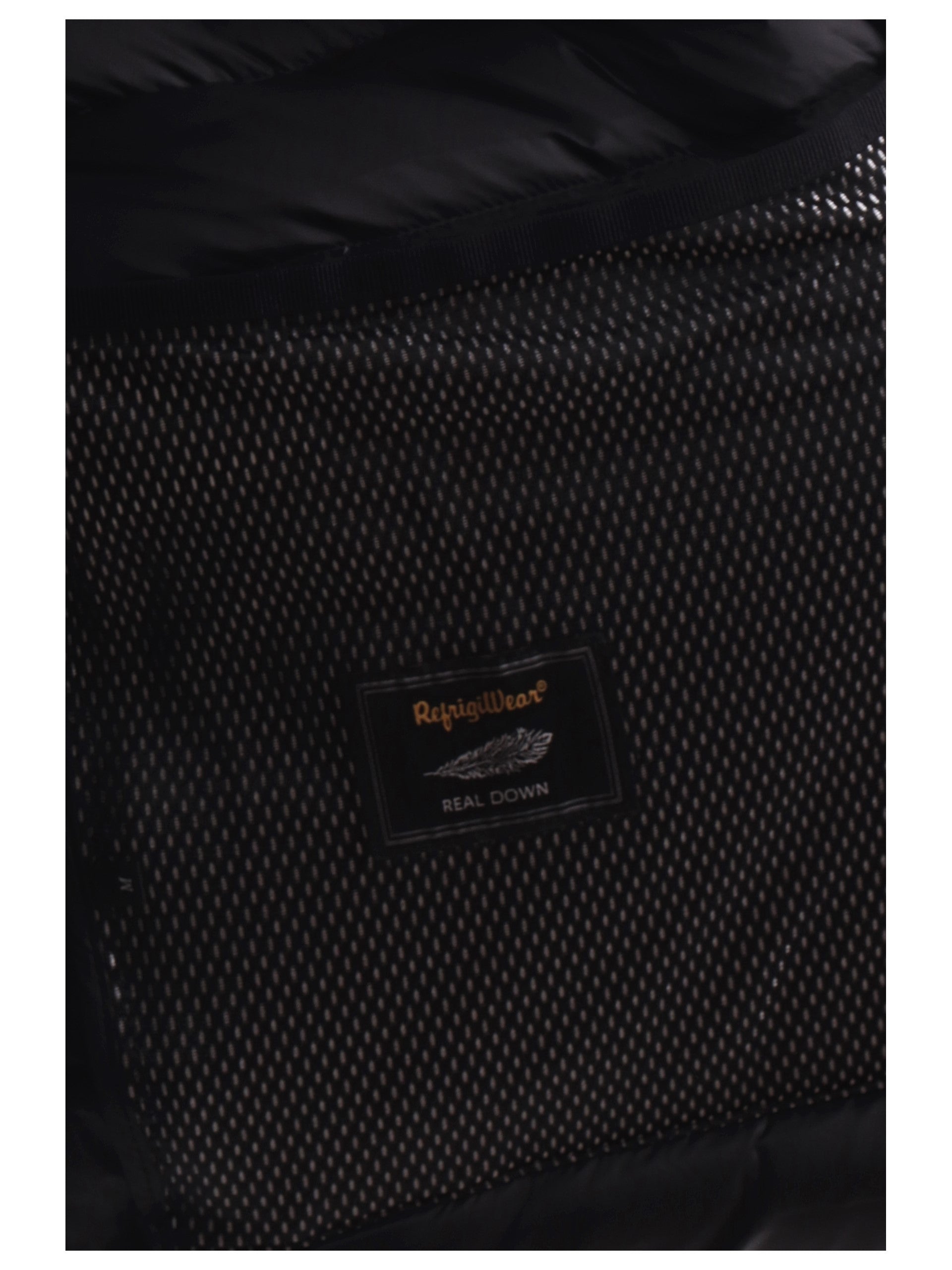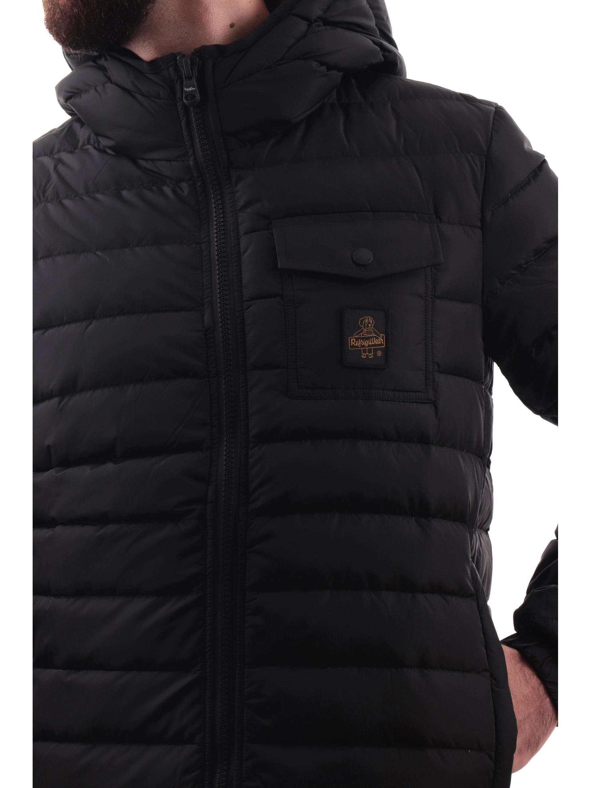 Giubbino Refrigiwear Hunter nero da uomo full zip con cappuccio G92708, realizzato con imbottitura in piuma naturale. Questo giubbotto Refrigiwear nero ha il cappuccio fisso con banda elastica, la chiusura full zip centrale, due tasche laterali con zip, un taschino con patta, polsini elasticizzati e il patch del brand cucito sul cuore a contrasto colore.