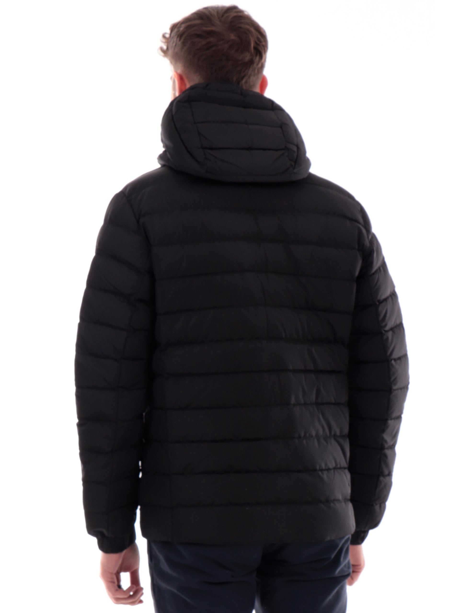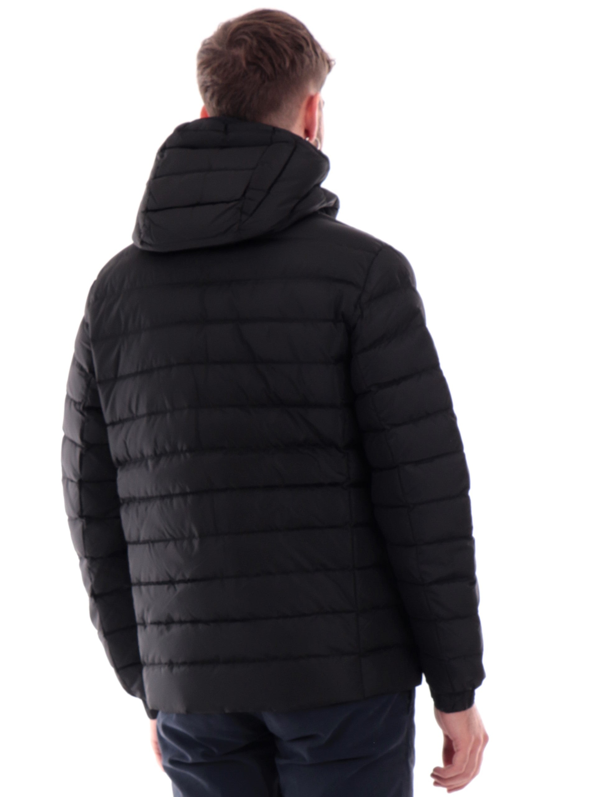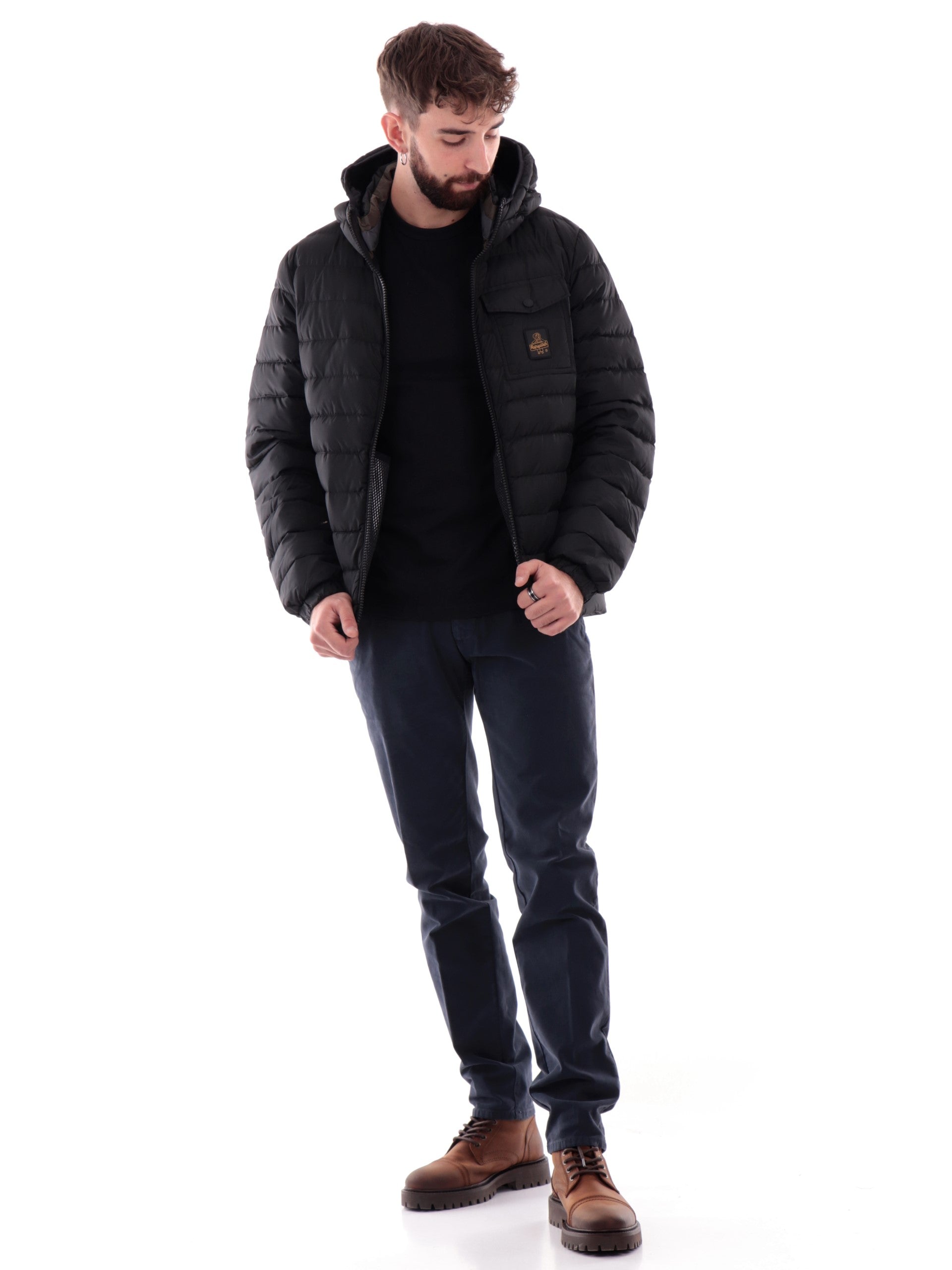 Giubbino Refrigiwear Hunter nero da uomo full zip con cappuccio G92708, realizzato con imbottitura in piuma naturale. Questo giubbotto Refrigiwear nero ha il cappuccio fisso con banda elastica, la chiusura full zip centrale, due tasche laterali con zip, un taschino con patta, polsini elasticizzati e il patch del brand cucito sul cuore a contrasto colore.