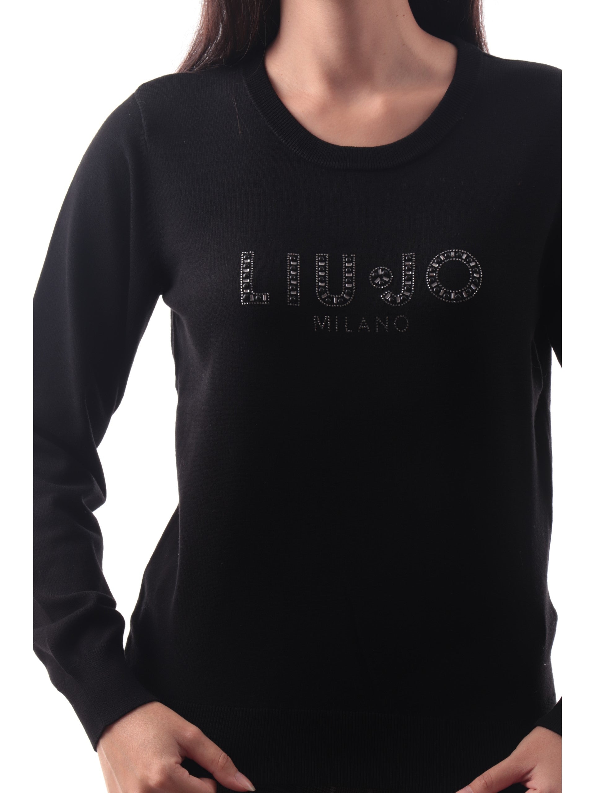 Maglioncino Liu Jo nero da donna realizzato in morbido filato di viscosa e poliestere. Questa maglia Liu Jo Donna nera è caratterizzato da scritta strass sul davanti con perle bianche e strass.