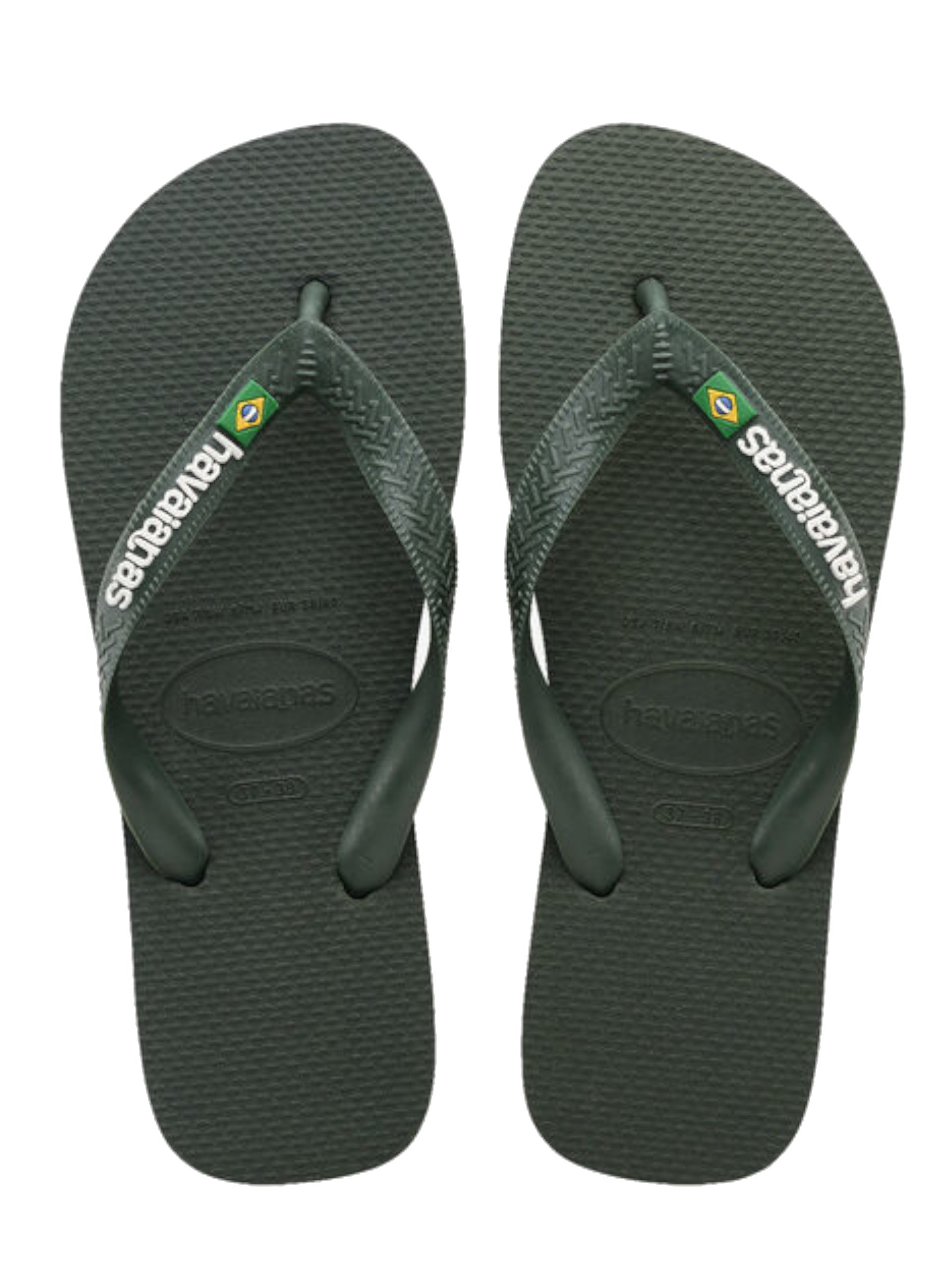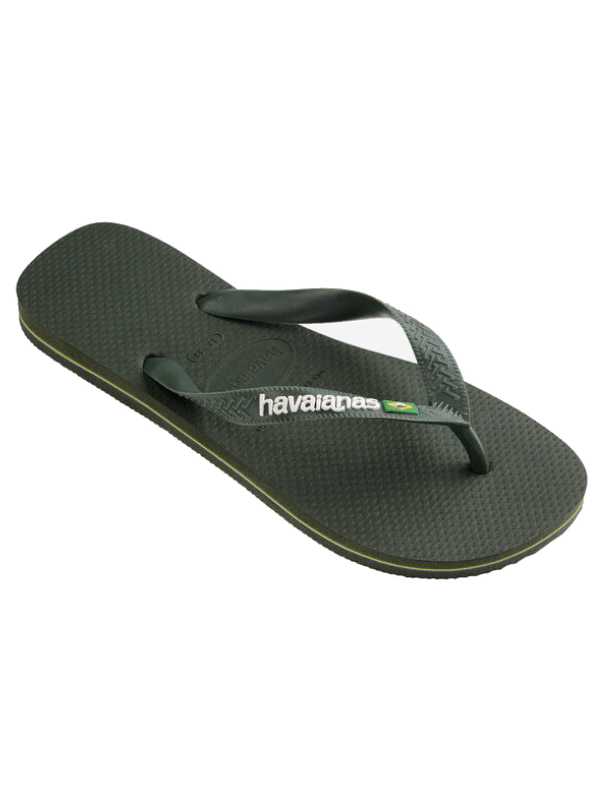 Infradito Havaianas Brasil Logo verde militare da uomo 4110850, realizzate in morbida gomma rigata con i tre colori del Brasile, giallo, verde e blu, e dotate di suola antiscivolo. Queste Ciabatte mare sono leggere e resistenti all'acqua oltre che al calore. Le originali infradito Havaianas hanno le fascette larghe con trama a rilievo con l'iconica scritta "havaianas" bianca su fondo verde e bandiera del Brasile. L'inconfondibile motivo a grana di riso sulla suola interna, al contatto con la pianta del piede, garantisce comodità consentendo di indossare queste ciabatte Havaianas 4110850 sia al mare che in città.