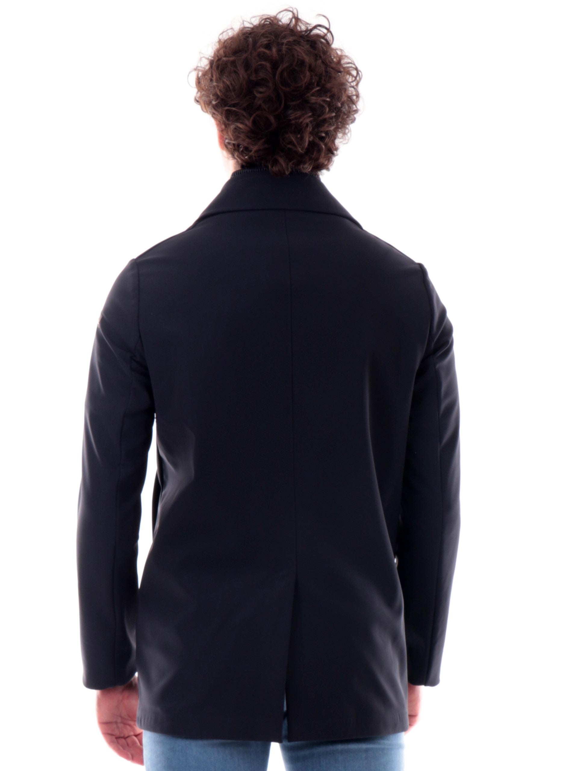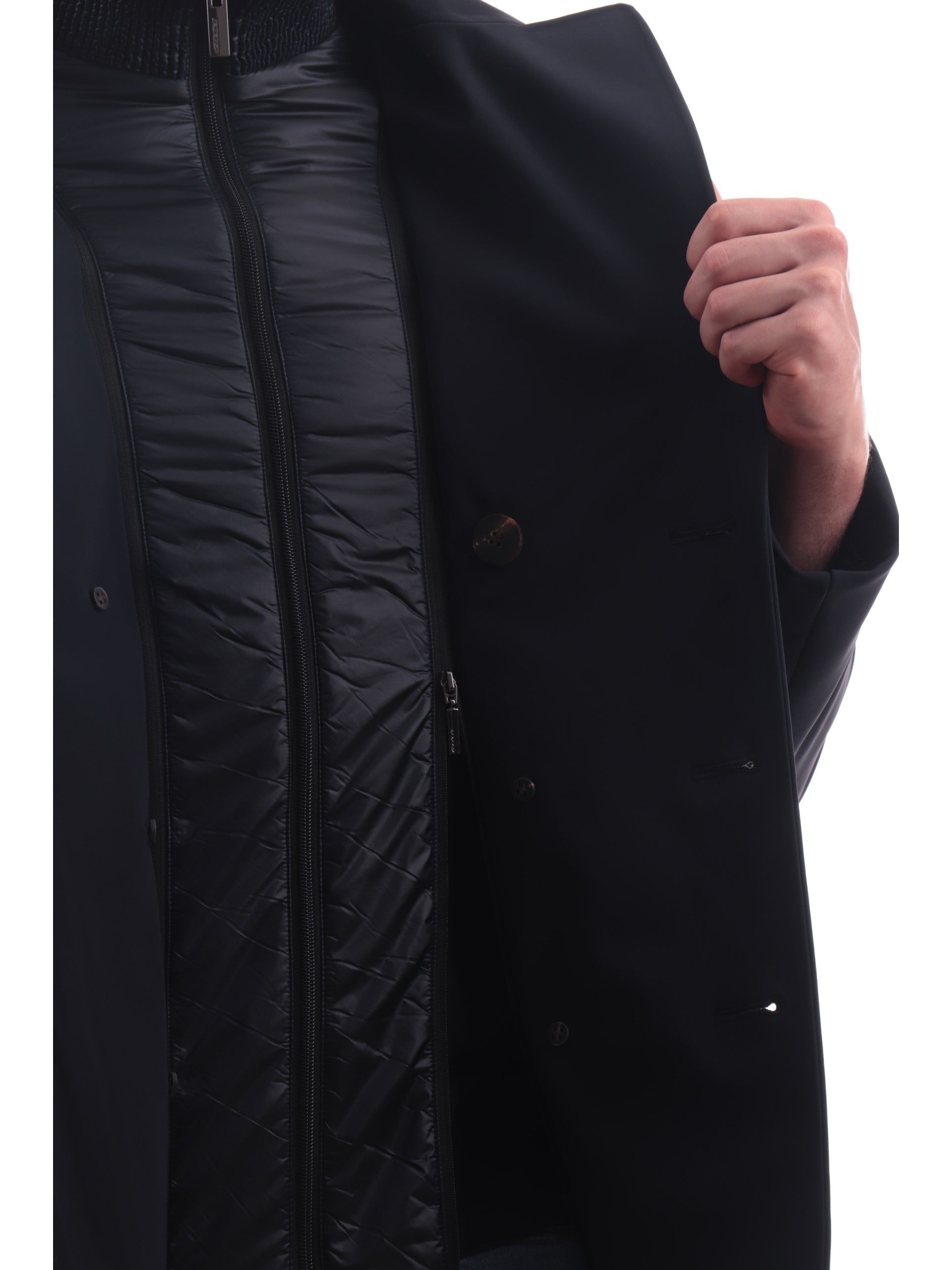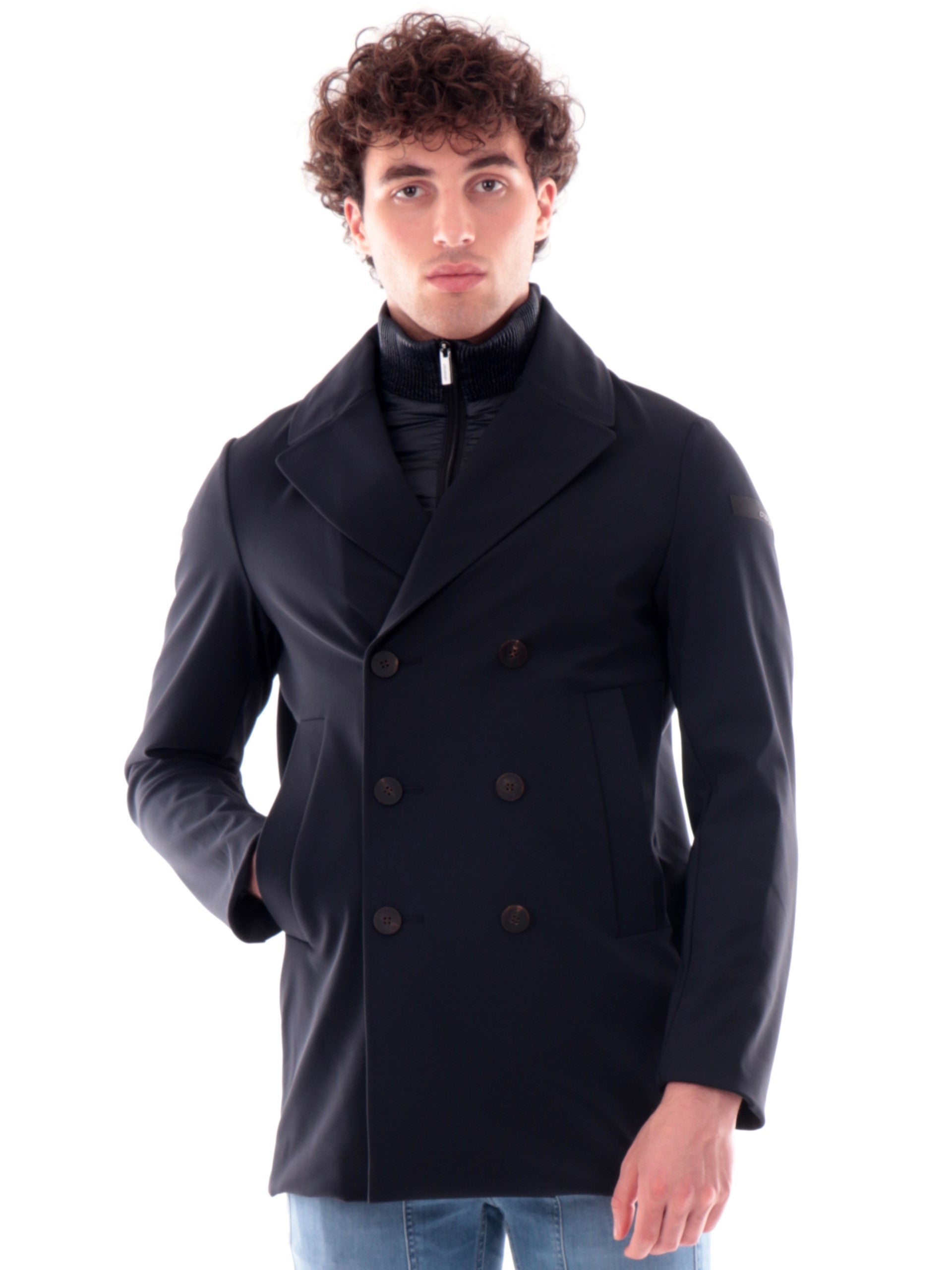 Cappotto RRD blu black da uomo con gilet rimovibile Superflex Winter Thermo Peacot. Questa giacca lunga RRD blu realizzato in tessuto tecnico resistente all'acqua, ha un finto gilet interno removibile, la chiusura con bottoni centrale, due tasche laterali con zip,il logo del brand applicato sulla manica sinistra, all'interno troviamo una tasca con zip e un tessuto caldo. Levando il gilet diventa un vero e proprio cappotto per un outfit elegante