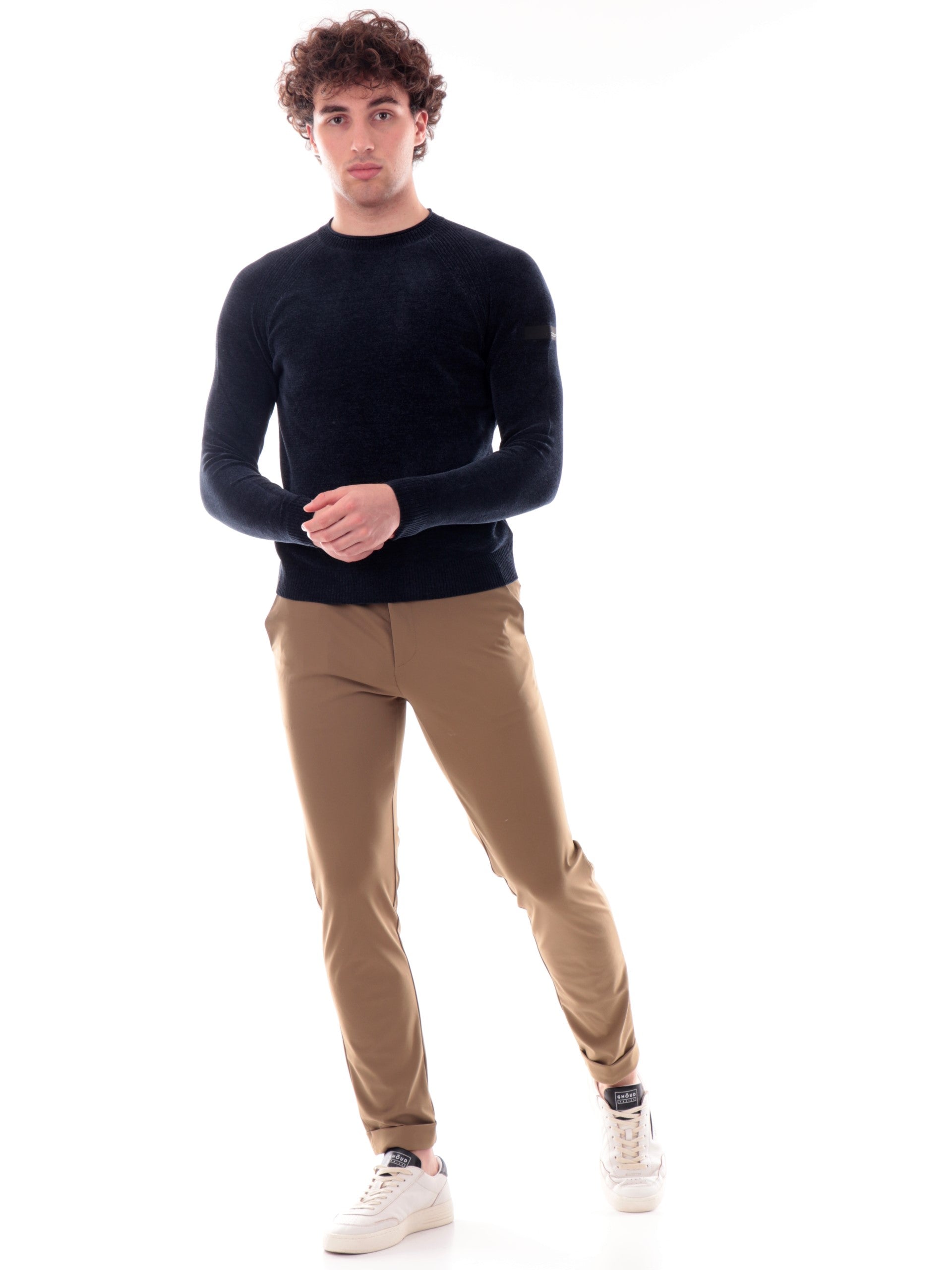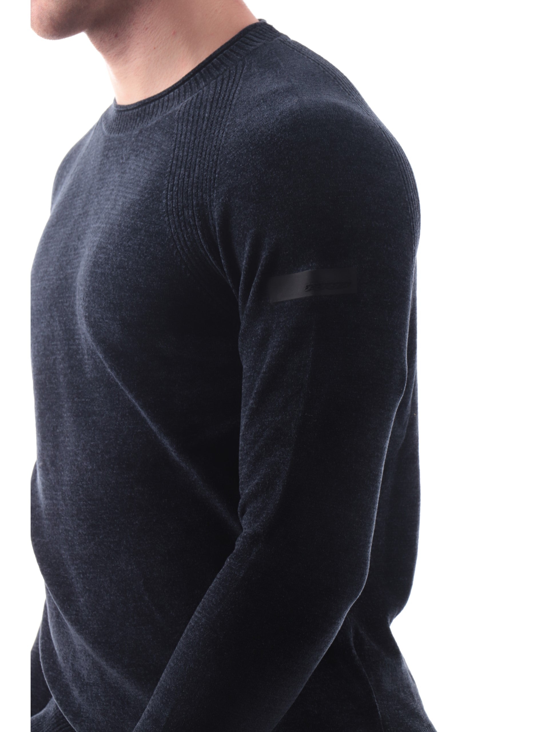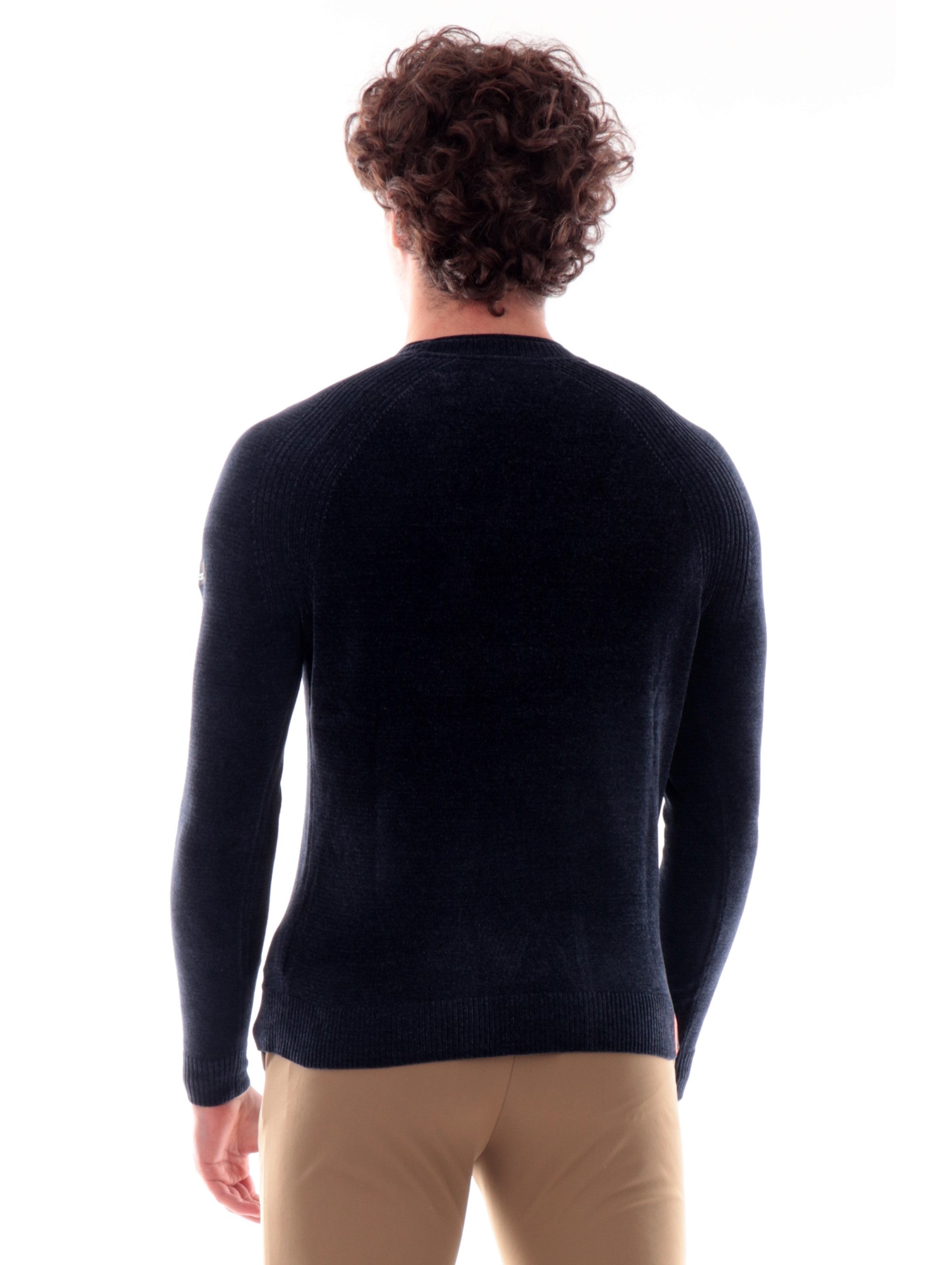 Maglione girocollo RRD blu da uomo Velvet Round Knit. Questo maglione blu da uomo RRD a girocollo realizzato in ciniglia stretch e dal touch vellutato, caratterizzato dal girocollo, polsini e fondo elasticizzati a costine e il logo del brand applicato sulla manica sinistra
