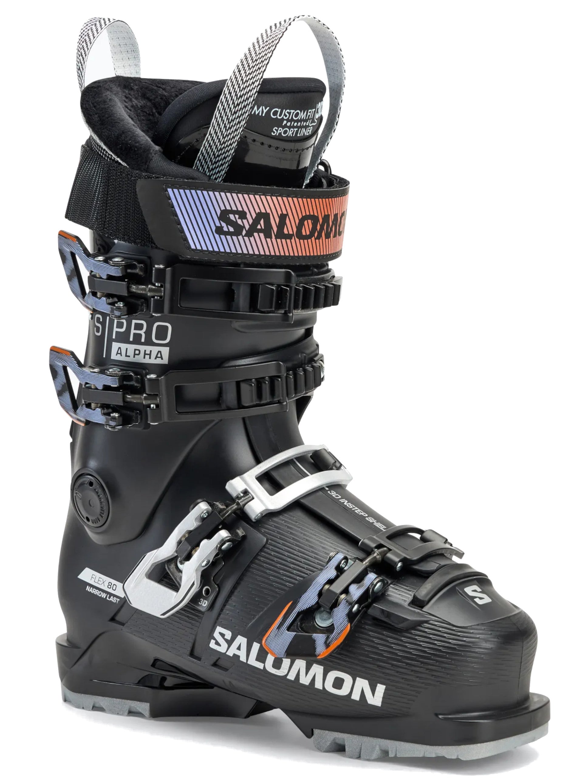 Scarponi sci Salomon S/Pro Alpha 80 neri da donna L47640. Pensato per donne in cerca di uno scarpone confortevole che si adatta all'istante alla morfologia dei piedi, l'S/Pro Alpha 80 di Salomon offre un nuovo livello di calzata e prestazioni. Dotato di scarpetta dal comfort immediato, questo scarpone con larghezza di 98 mm blocca bene il tallone senza aggiungere pressione inutile sul collo del piede.