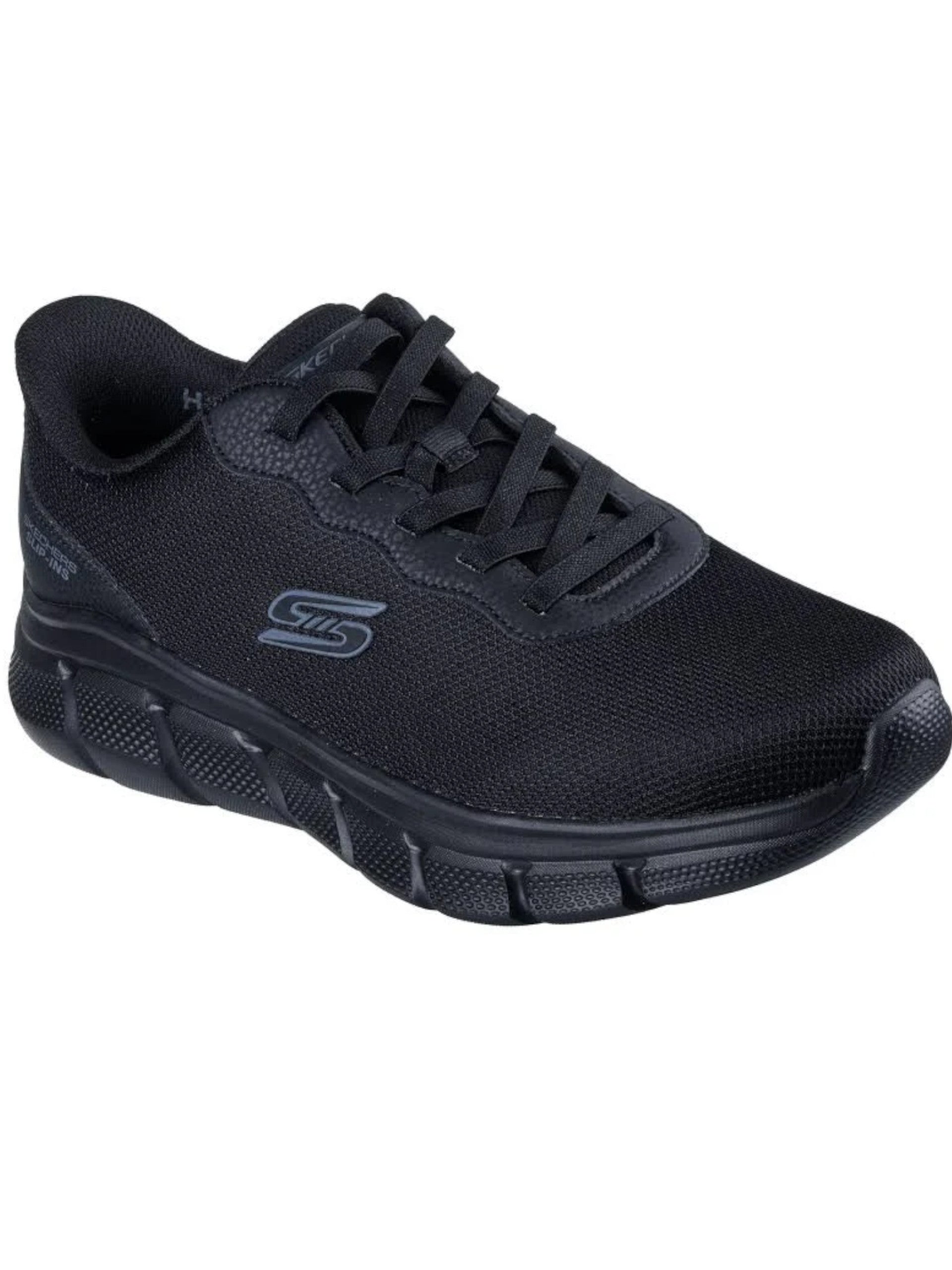 Scarpe Skechers neri Bob Flex Glacial Edge da uomo Vegan. Queste scarpe Skechers neri hanno la tomaia in tessuto traspirante, la chiusura con lacci, la suola in gomma che garantisce un corretto sostegno dell'arco plantare, con la tecnologia SLIP IN per il massimo comfort e praticità