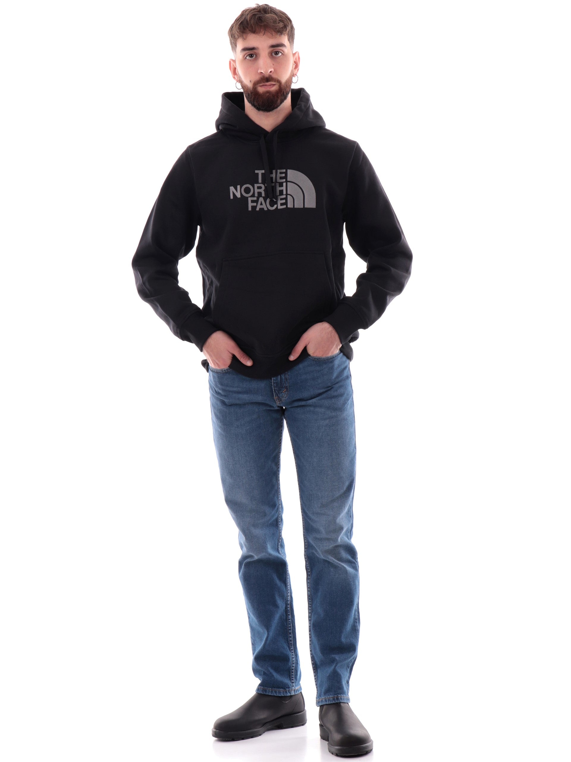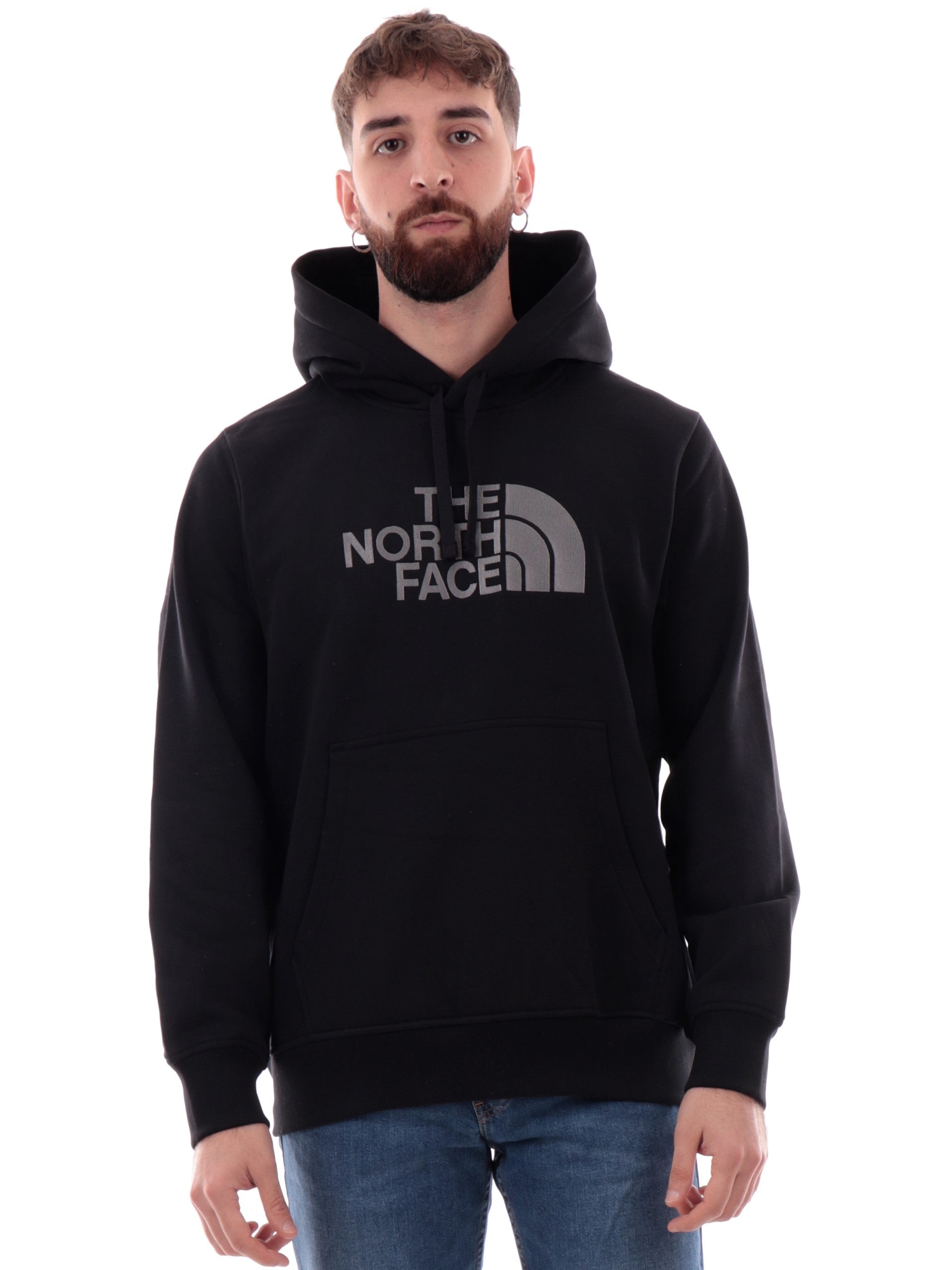 Felpa The North Face nera da uomo Drew Peak NF0A89EM, realizzata in cotone. Questa felpa North Face nera ha il cappuccio regolabile con laccetti, una comoda tasca a marsupio, un maxi ricamo a contrasto colore, polsini e fondo elasticizzati a costine.