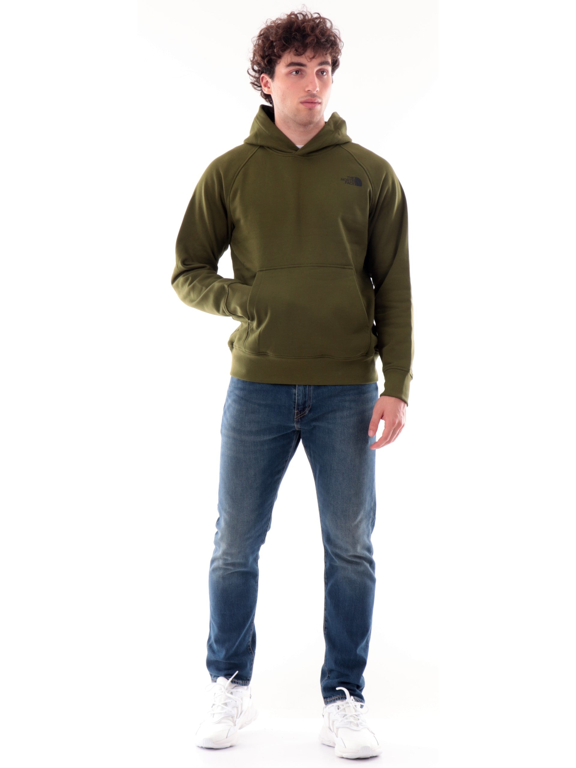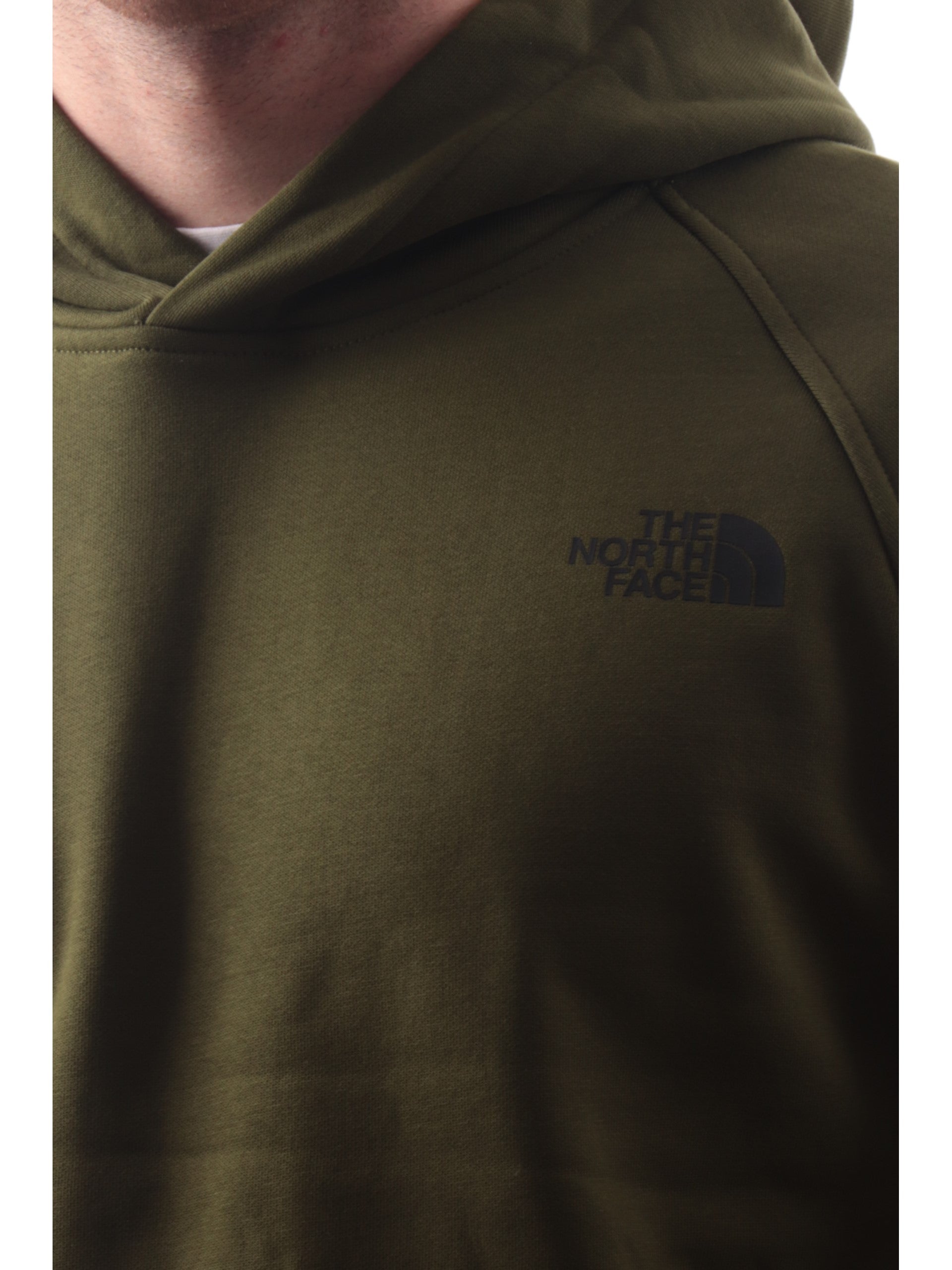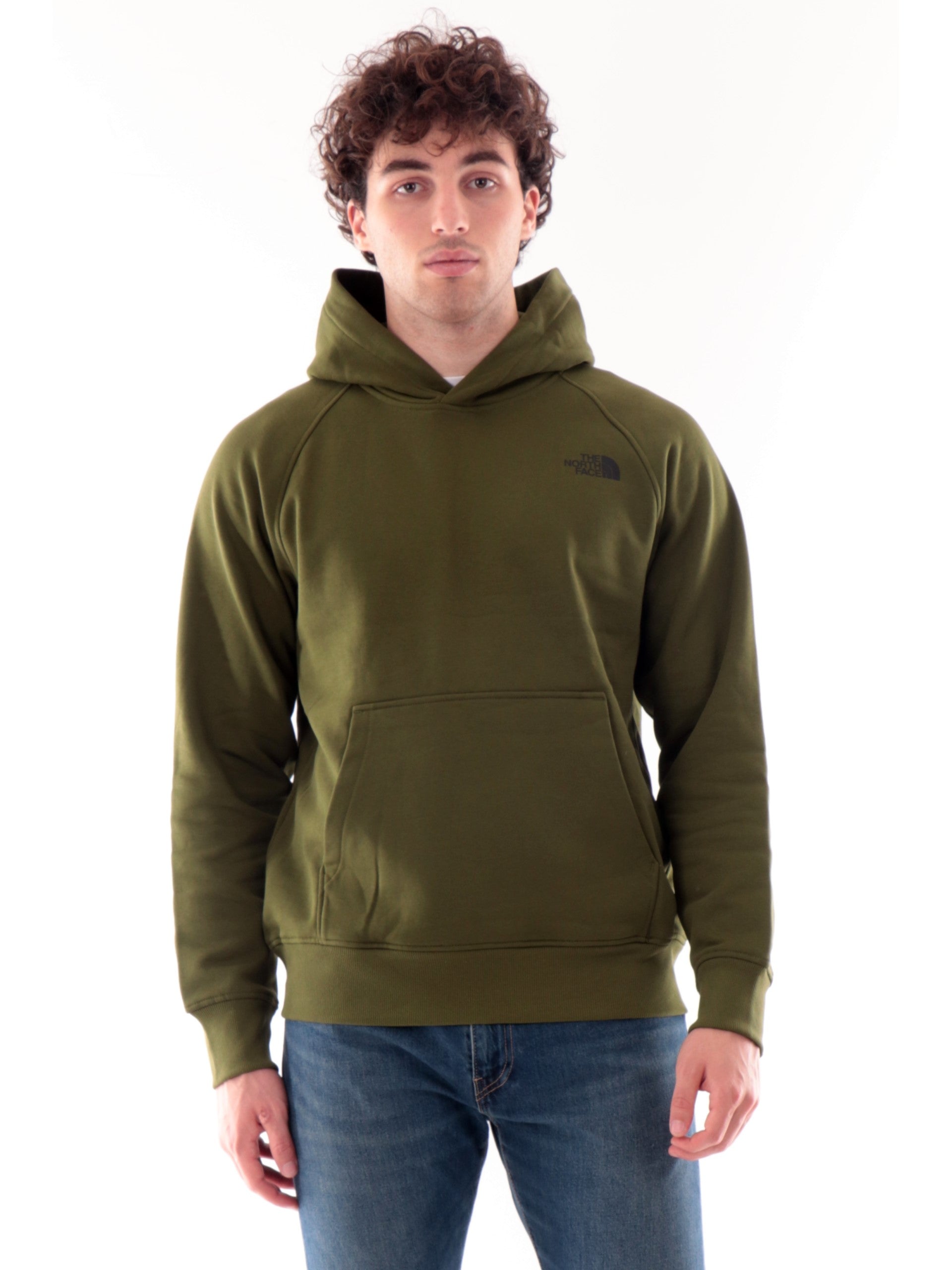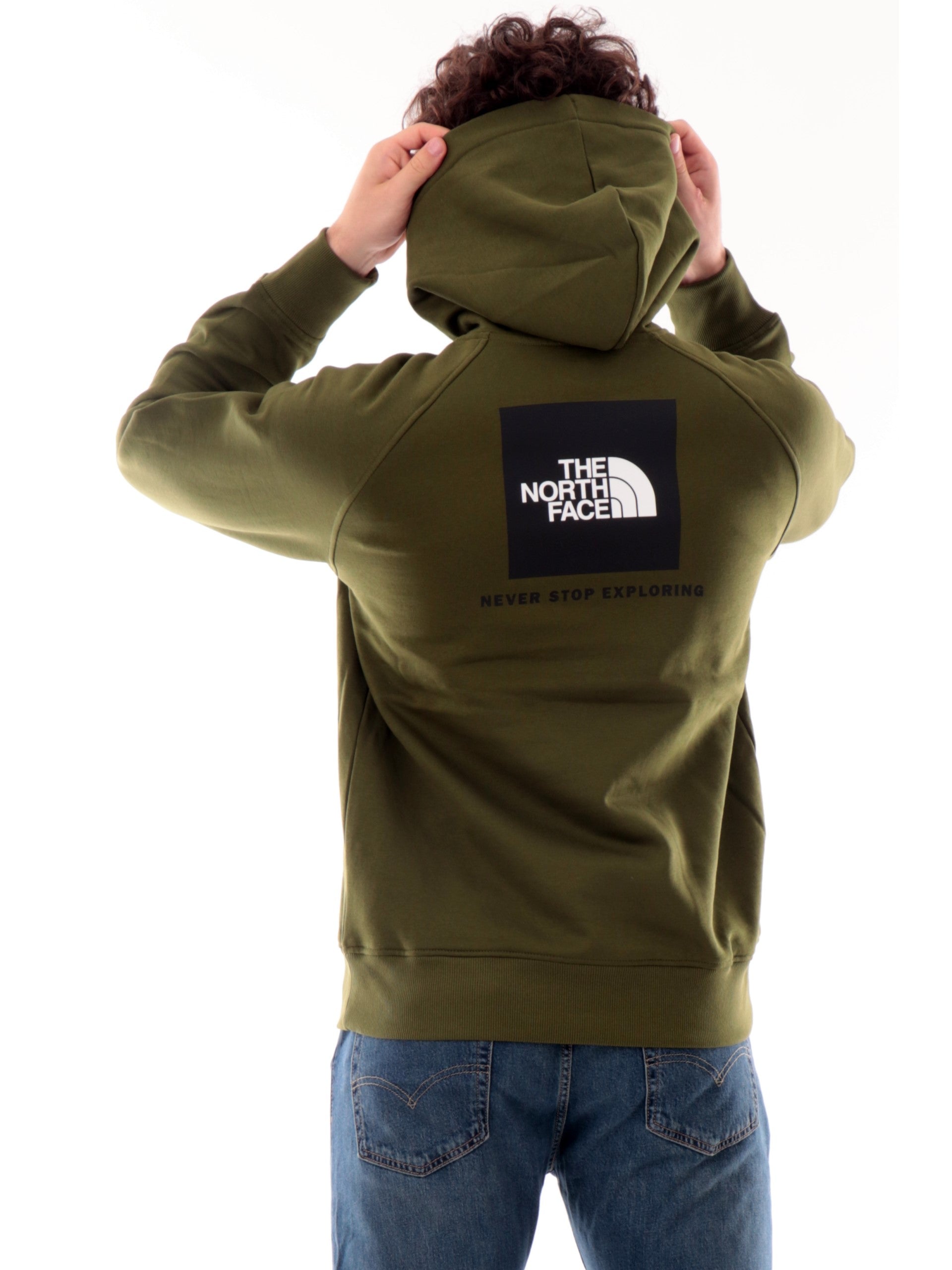 Felpa The North Face verde con cappuccio Raglan Box NF0A89F9, realizzata in cotone. Questa felpa North Face verde ha il cappuccio fisso, una comoda tasca a marsupio, la maxi stampa sul lato posteriore, il logo North Face lato cuore, polsini e fondo elasticizzati.