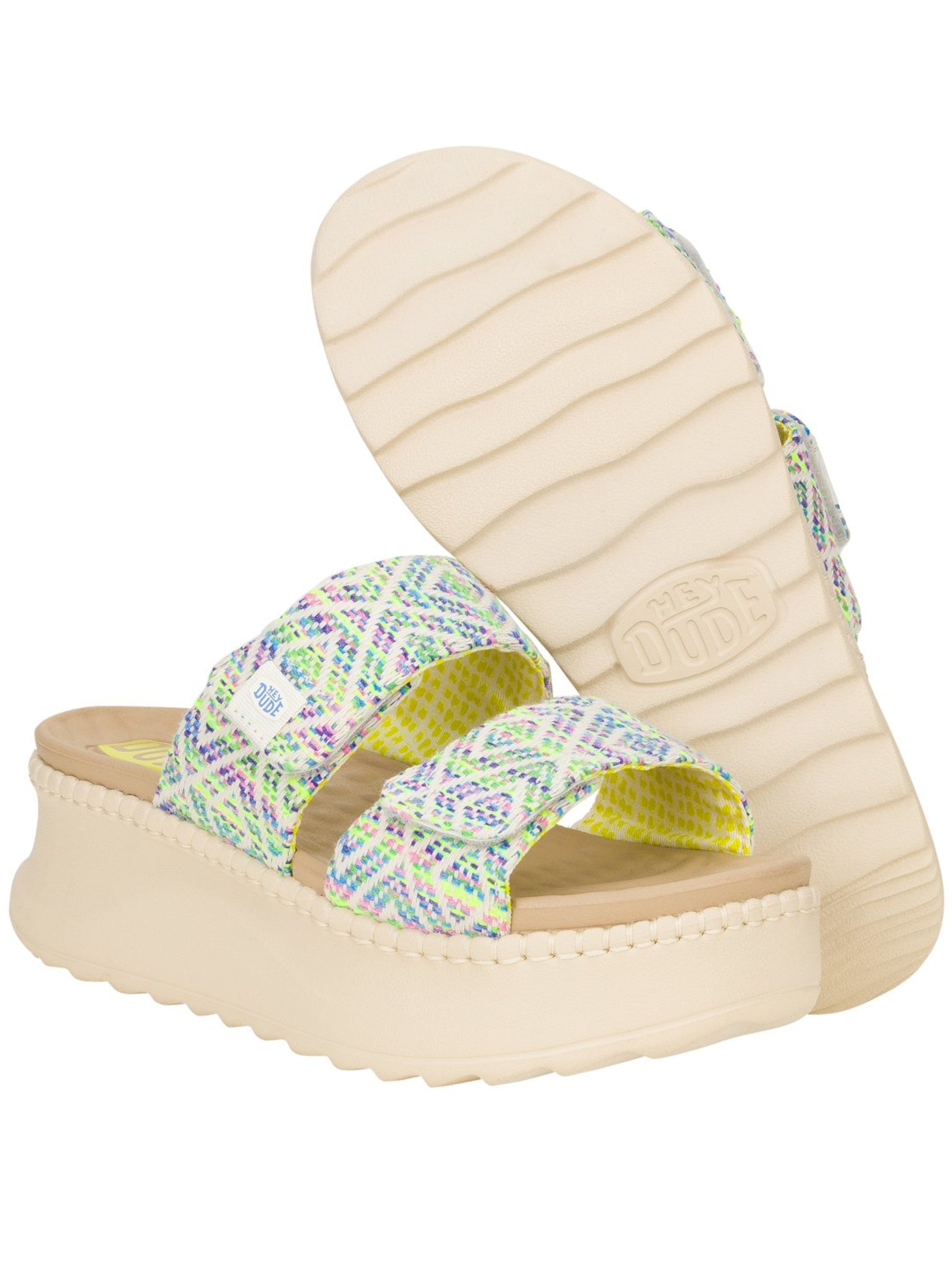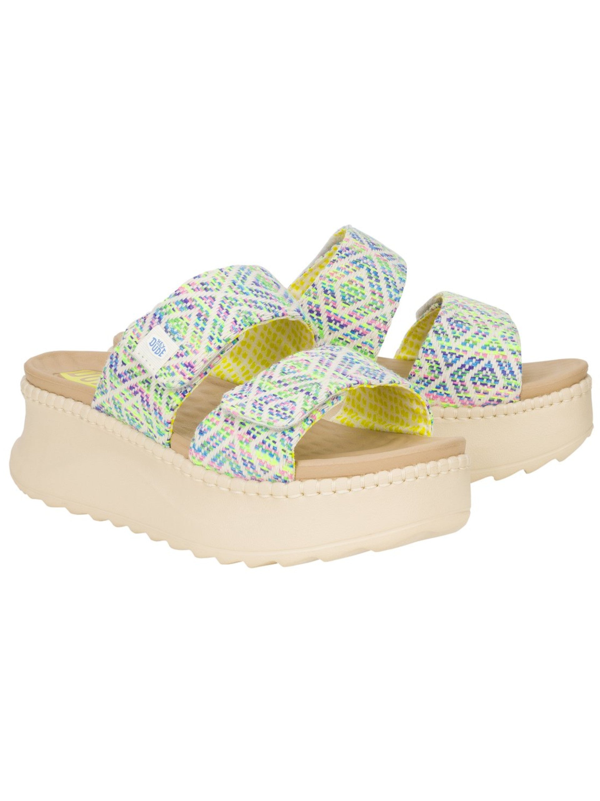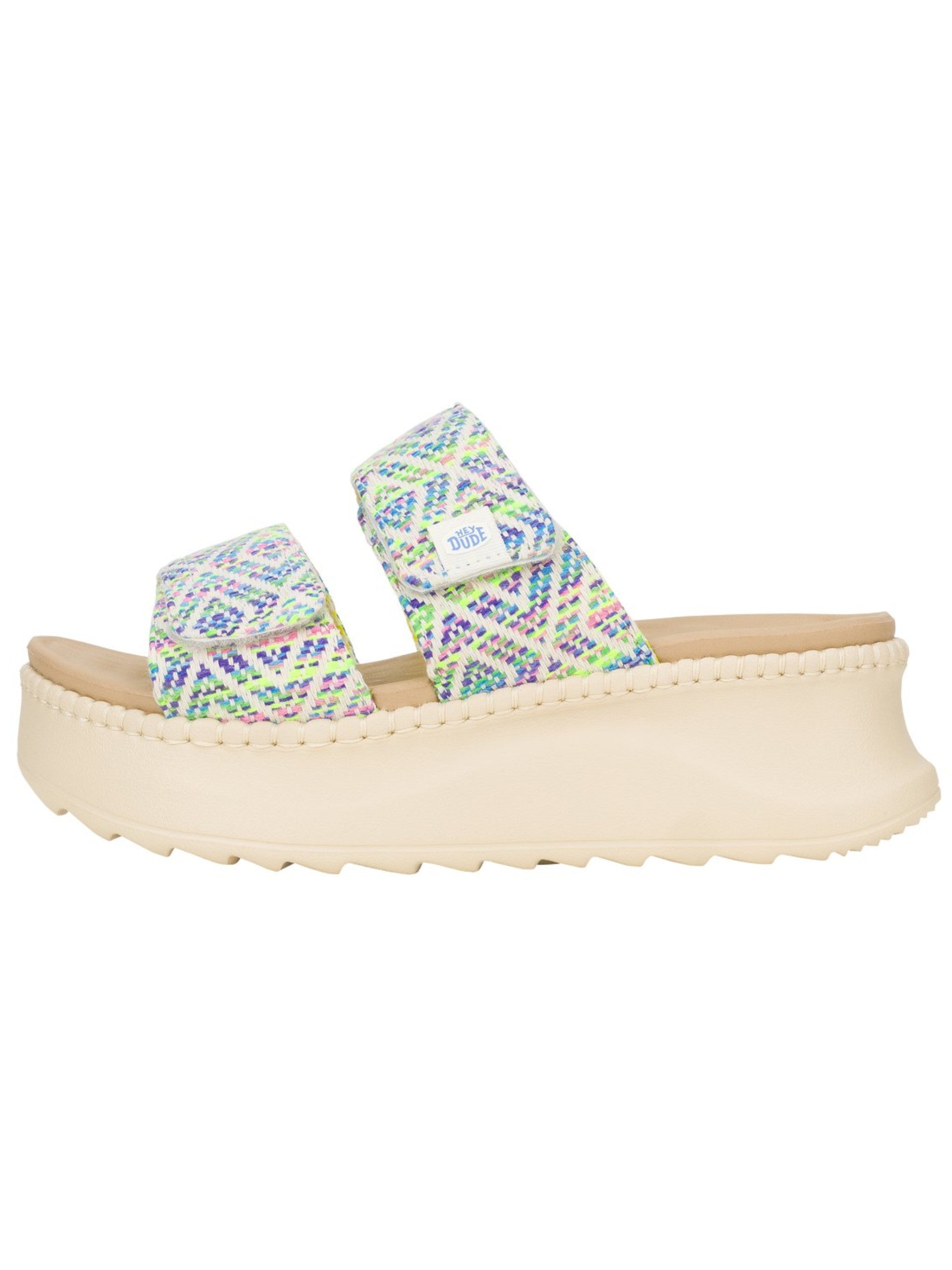 Scarpe Hey Dude blu multicolor Delray Slide Surf Baja da donna 43210. Queste scarpe Hedy Dude sono realizzate con doppio cinturino multicolore. La suola in gomma, i bordi con inserti in corda rendonoqueste ciabatte donna Hey Dude un Must have di questa stagione. Altezza 5 cm.