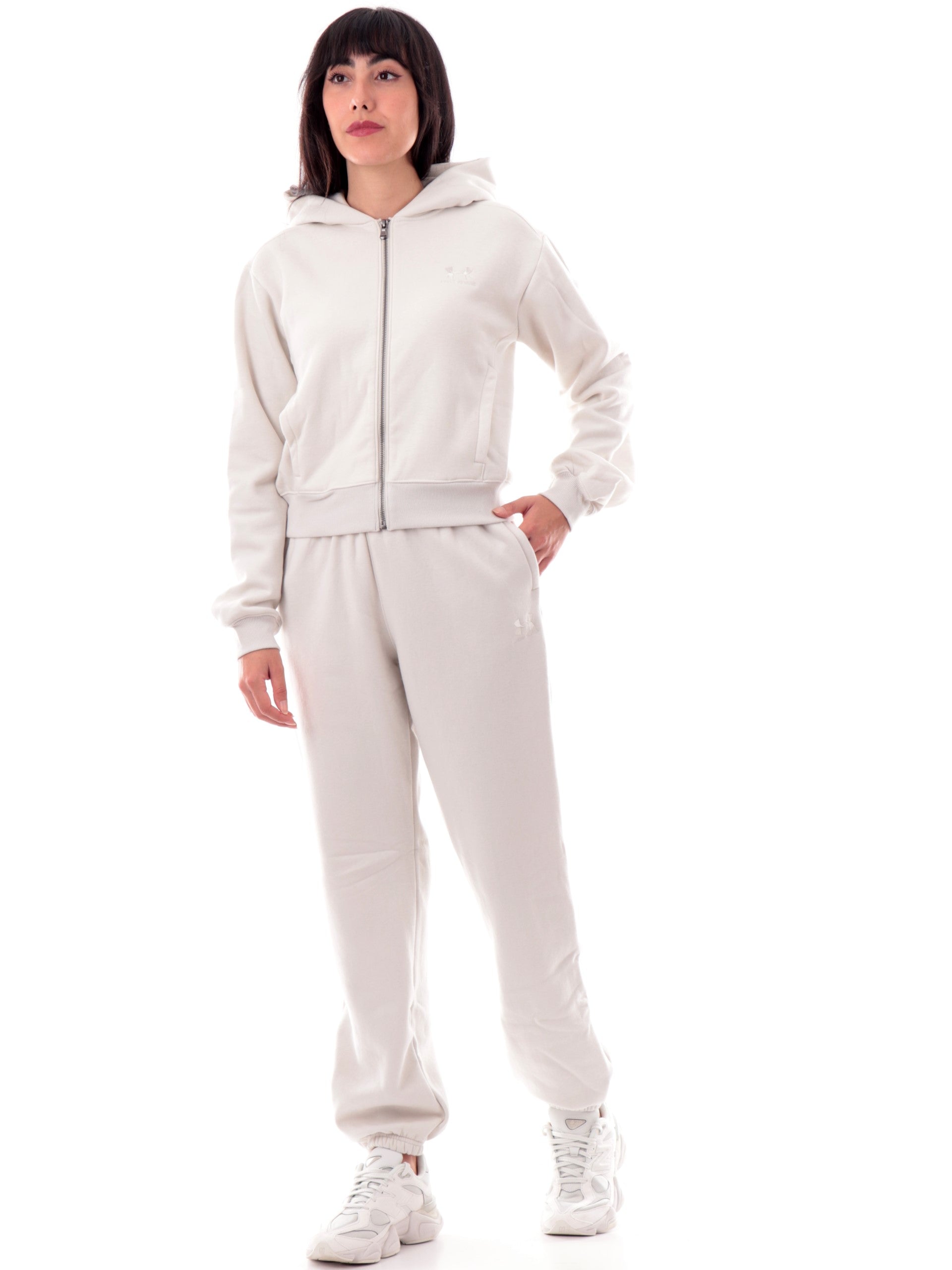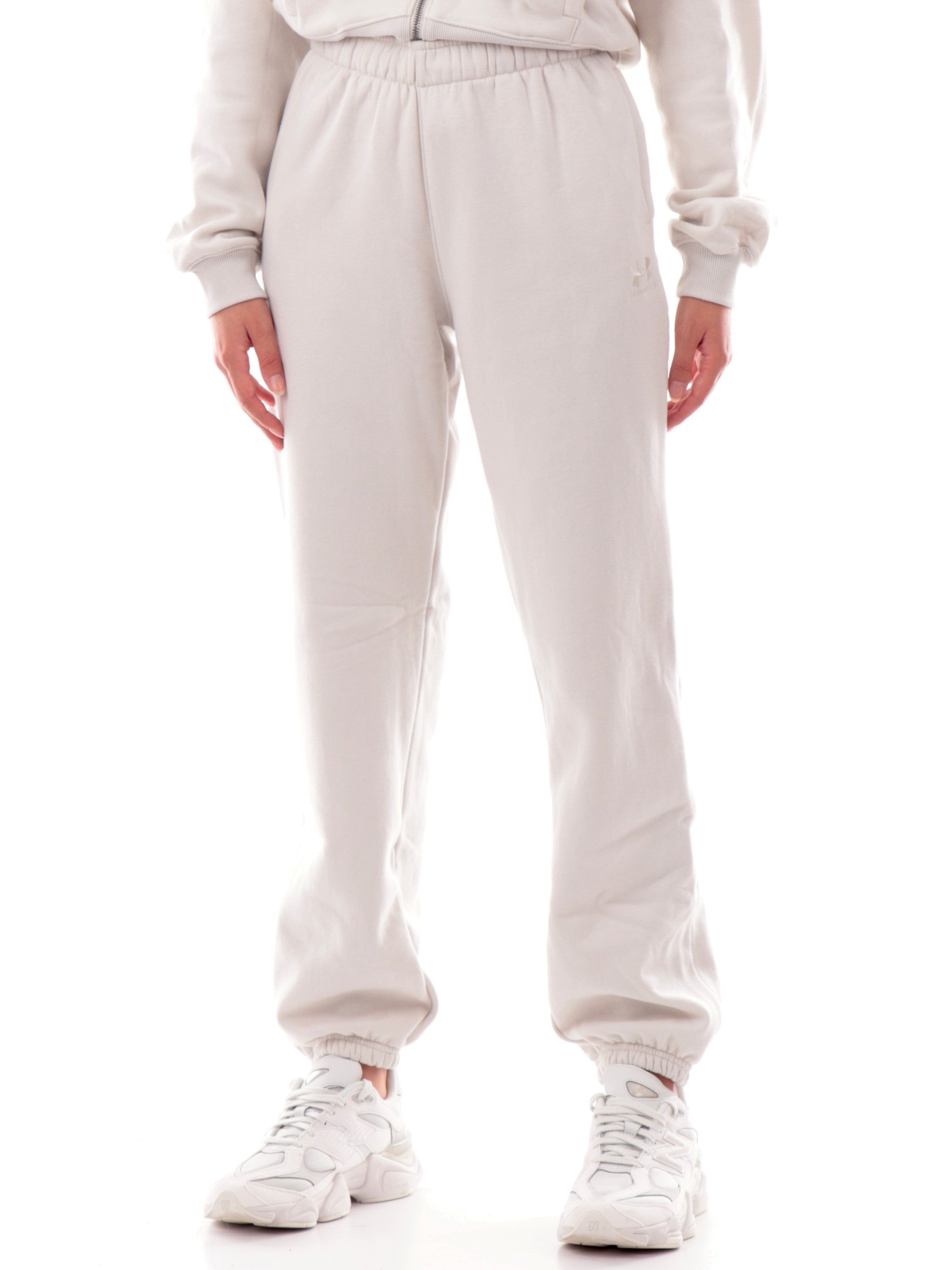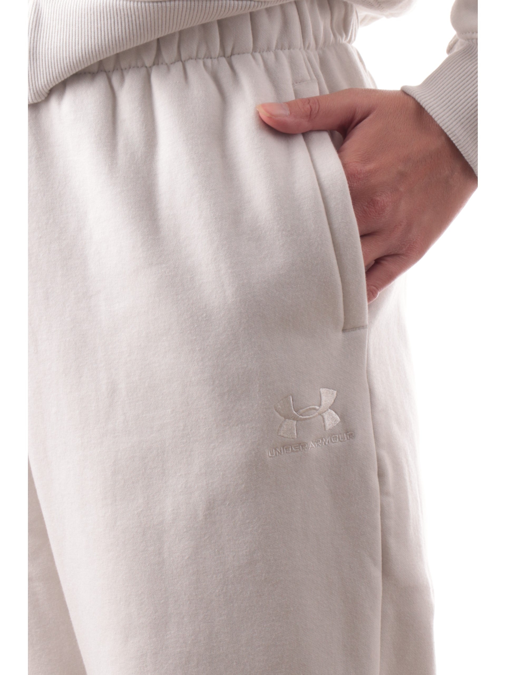 Pantaloni da tuta Under Armour beige da donna ICON VIDA FLC JOGGER. Questi pantaloni tuta Under Armour beige hanno la banda elastica sul punto vita regolabile con laccetti, due tasche laterali aperte, logo ricamato sul davanti lato sinistro