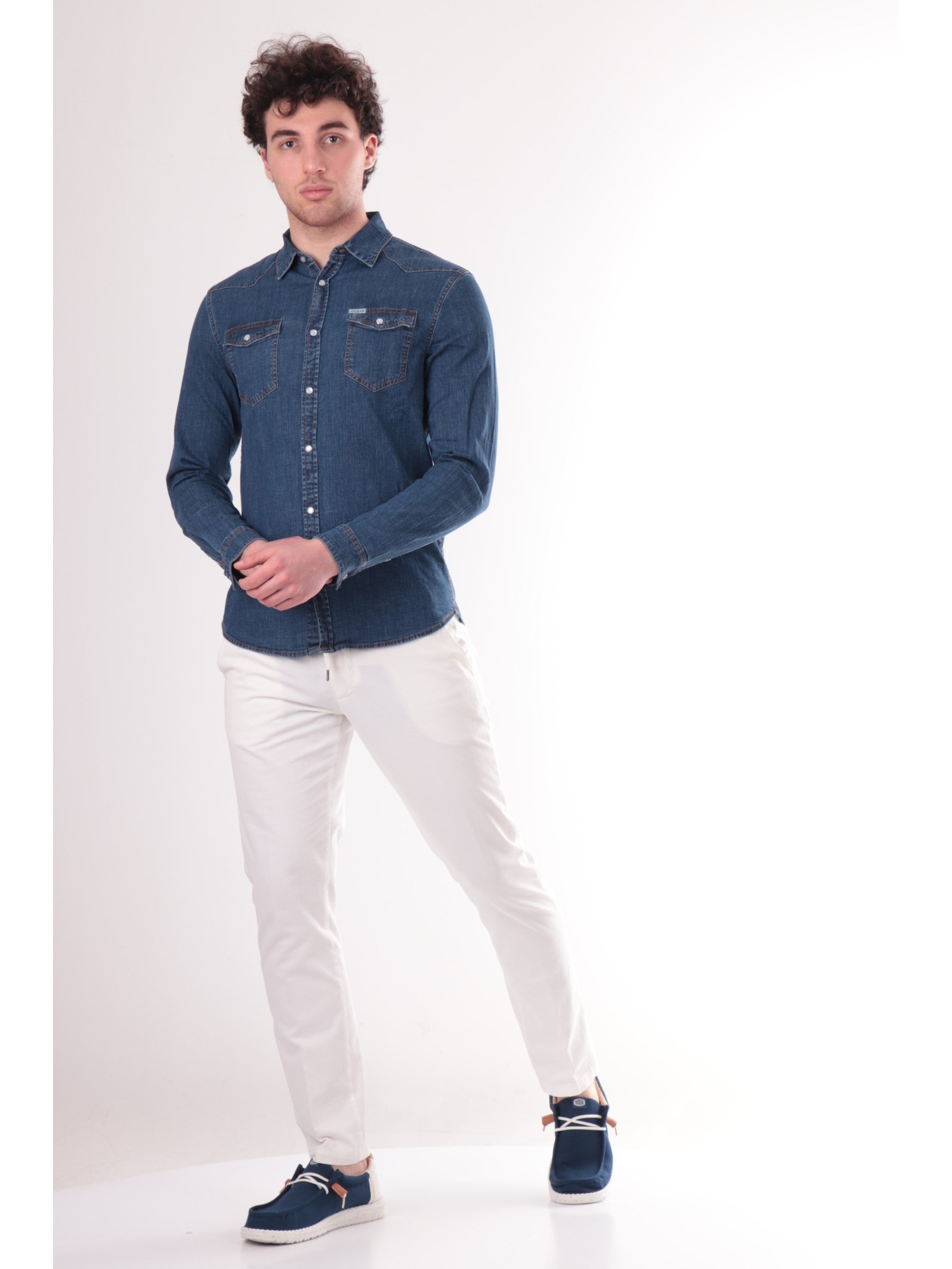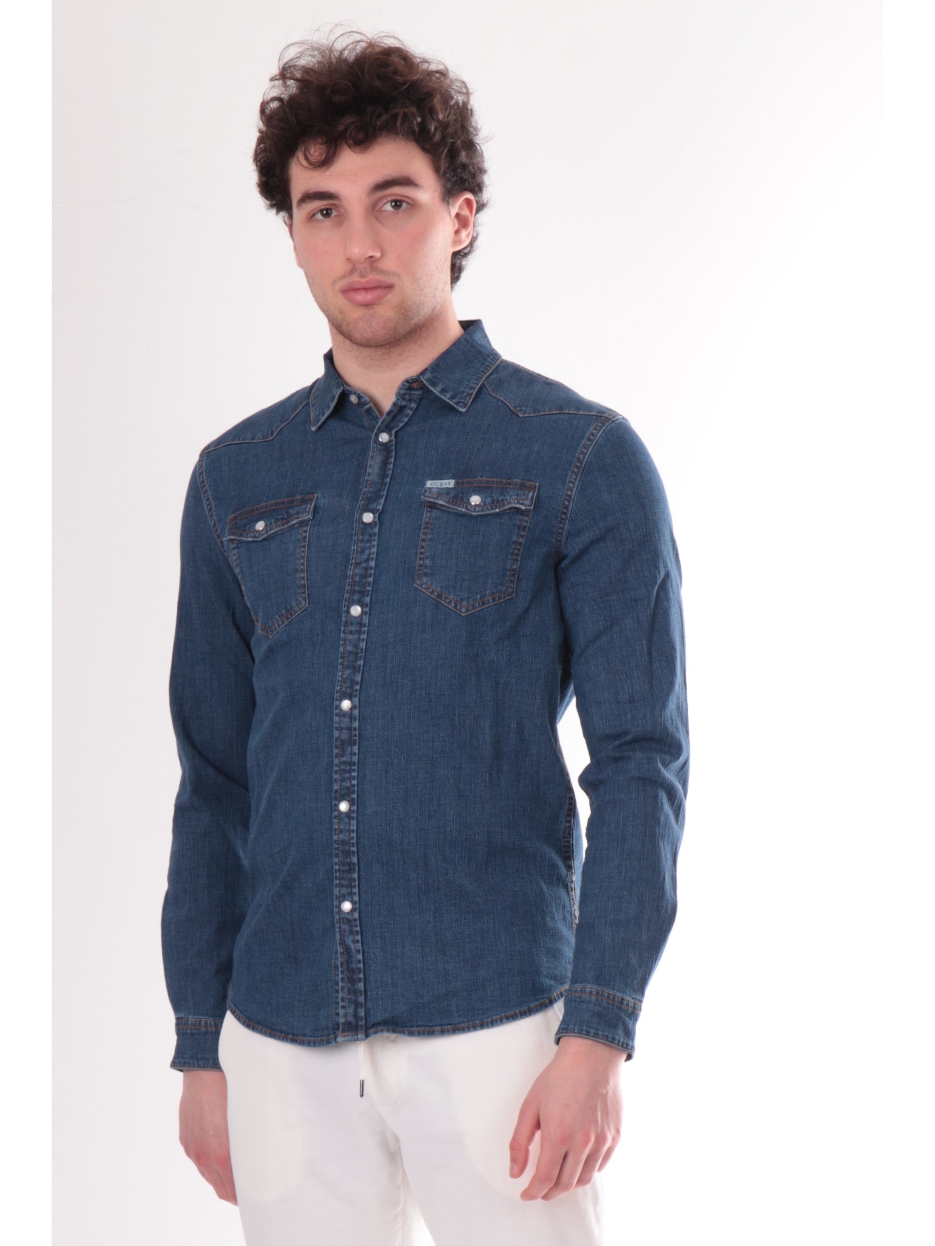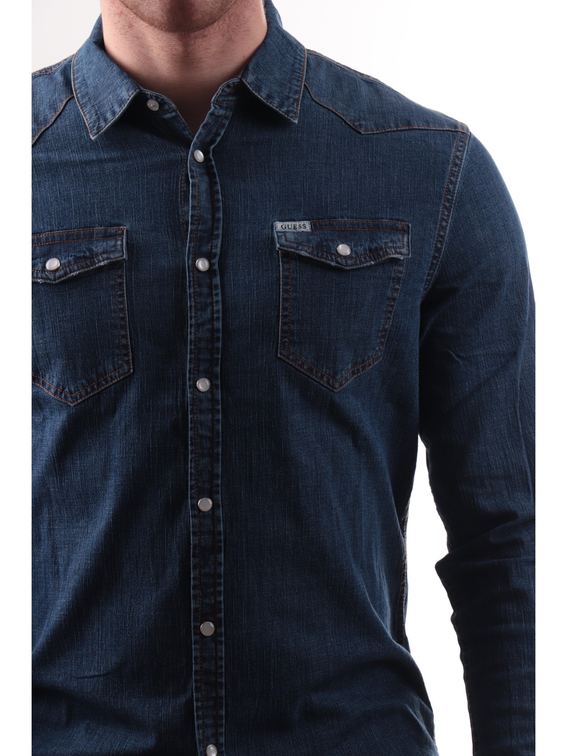 Camicia jeans Guess da uomo Truckee, realizzata in cotone. Questa camicia Guess blu ha il colletto tradizionale, la chiusura a bottoni automatici, il logo del brand sul davanti a contrasto colore e due taschini sul davanti con patta a bottoni automatici.