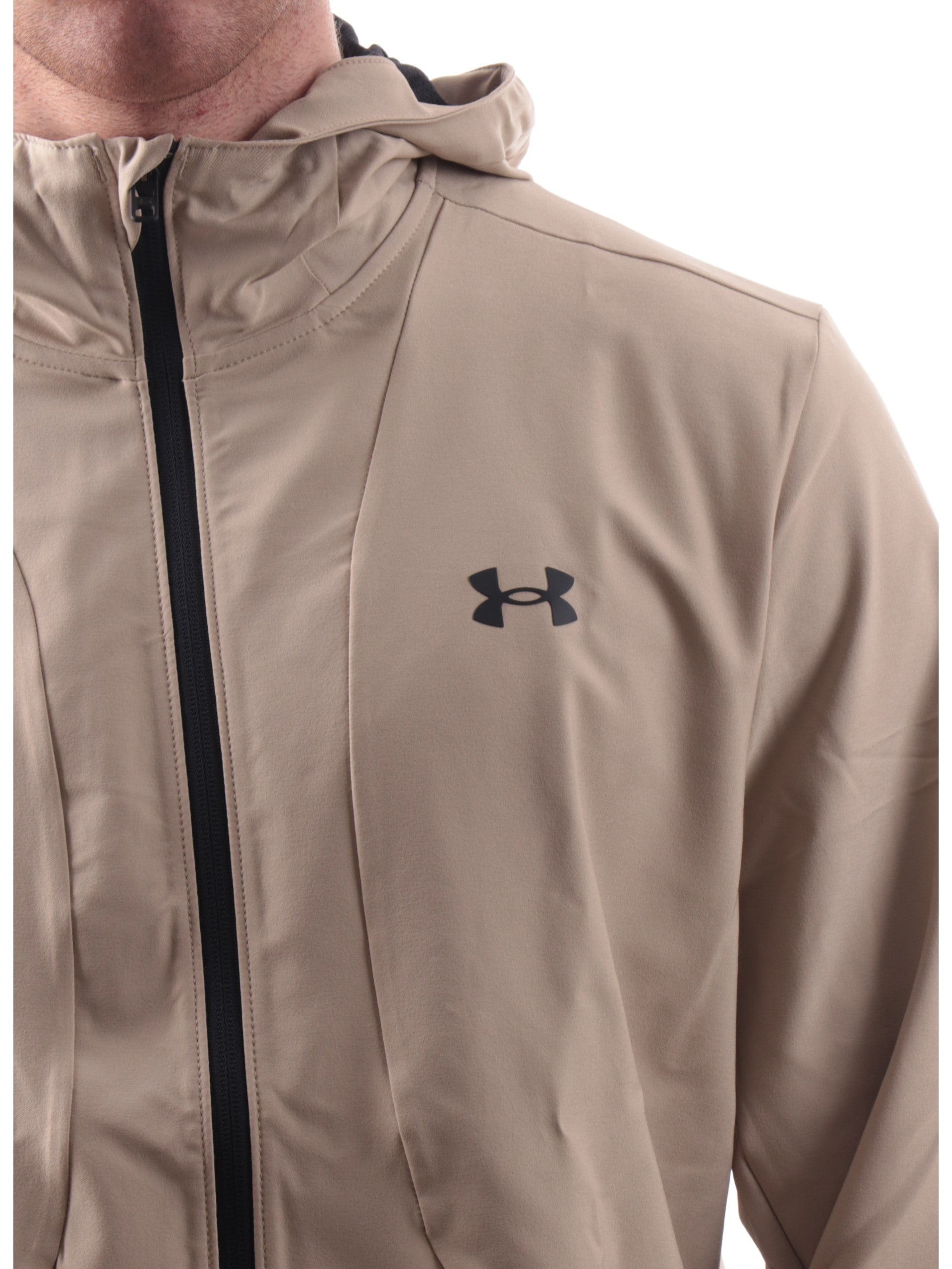Felpa beige da uomo Under Armour. Questa felpa da uomo, realizzata in tessuto tecnico, morbido e leggero al tatto, perfetto per la stagione primaverile è caratterizzata dal cappuccio fisso, chiusura full zip centrale, due tasche laterali con zip, logo Under Armour a lato cuore, polsini e fondo regolari.