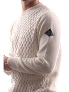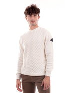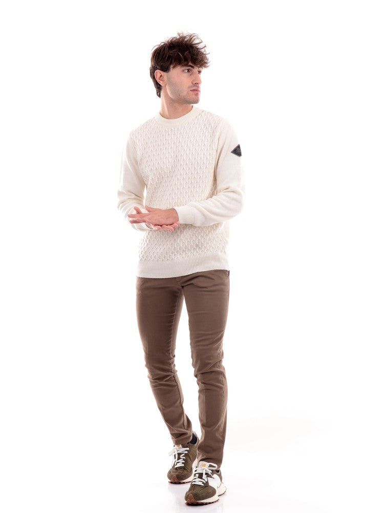 Roy Rogers weißer Herrenpullover RU502CC64XXXX, aus weichem Melange-Stoff. Dieser weiße Pullover von Roy Rogers hat einen Rundhalsausschnitt aus geripptem Stoff, das Markenlogo auf dem linken Ärmel in Kontrastfarbe sowie gerippte elastische Bündchen und Saum.