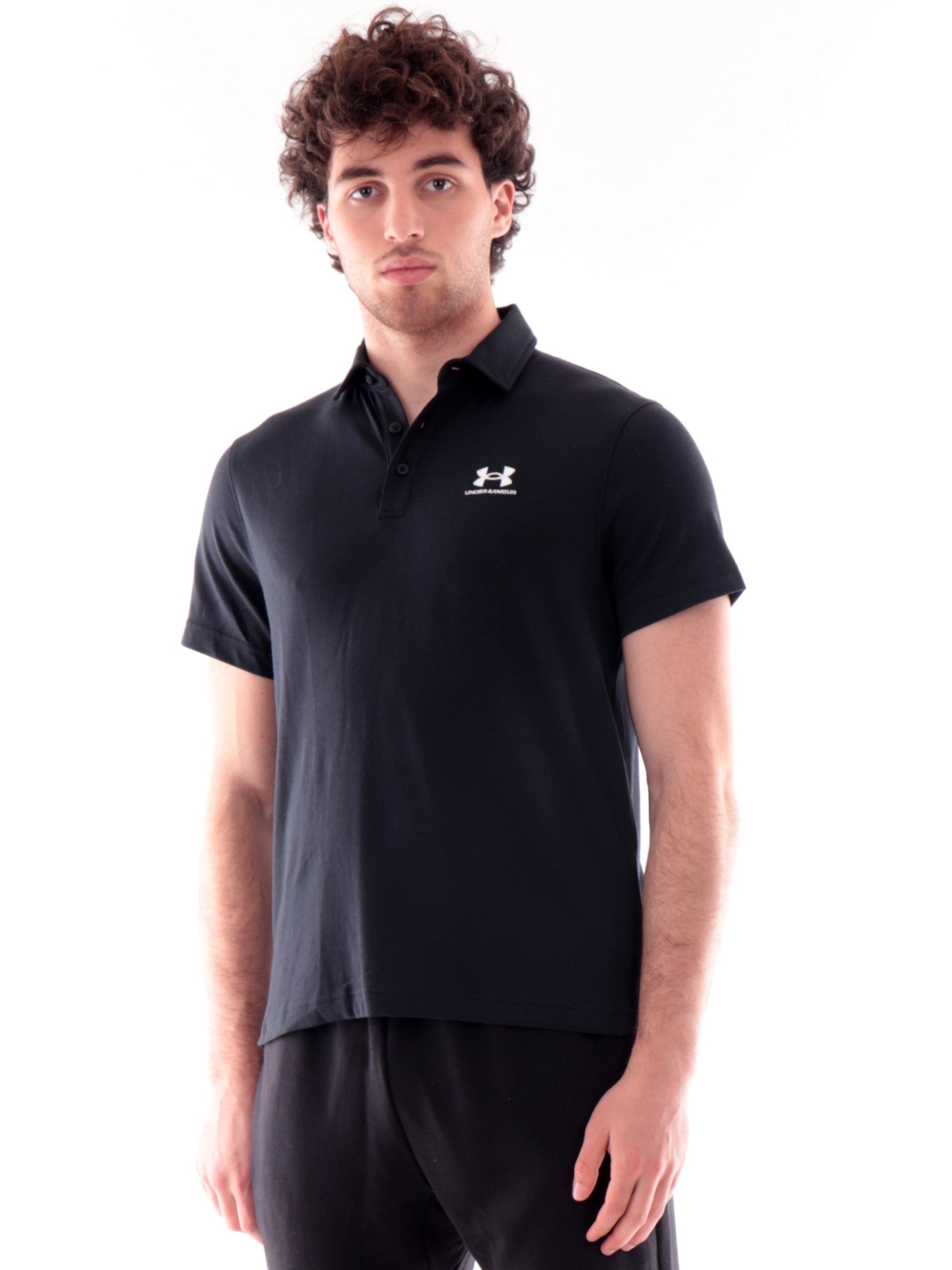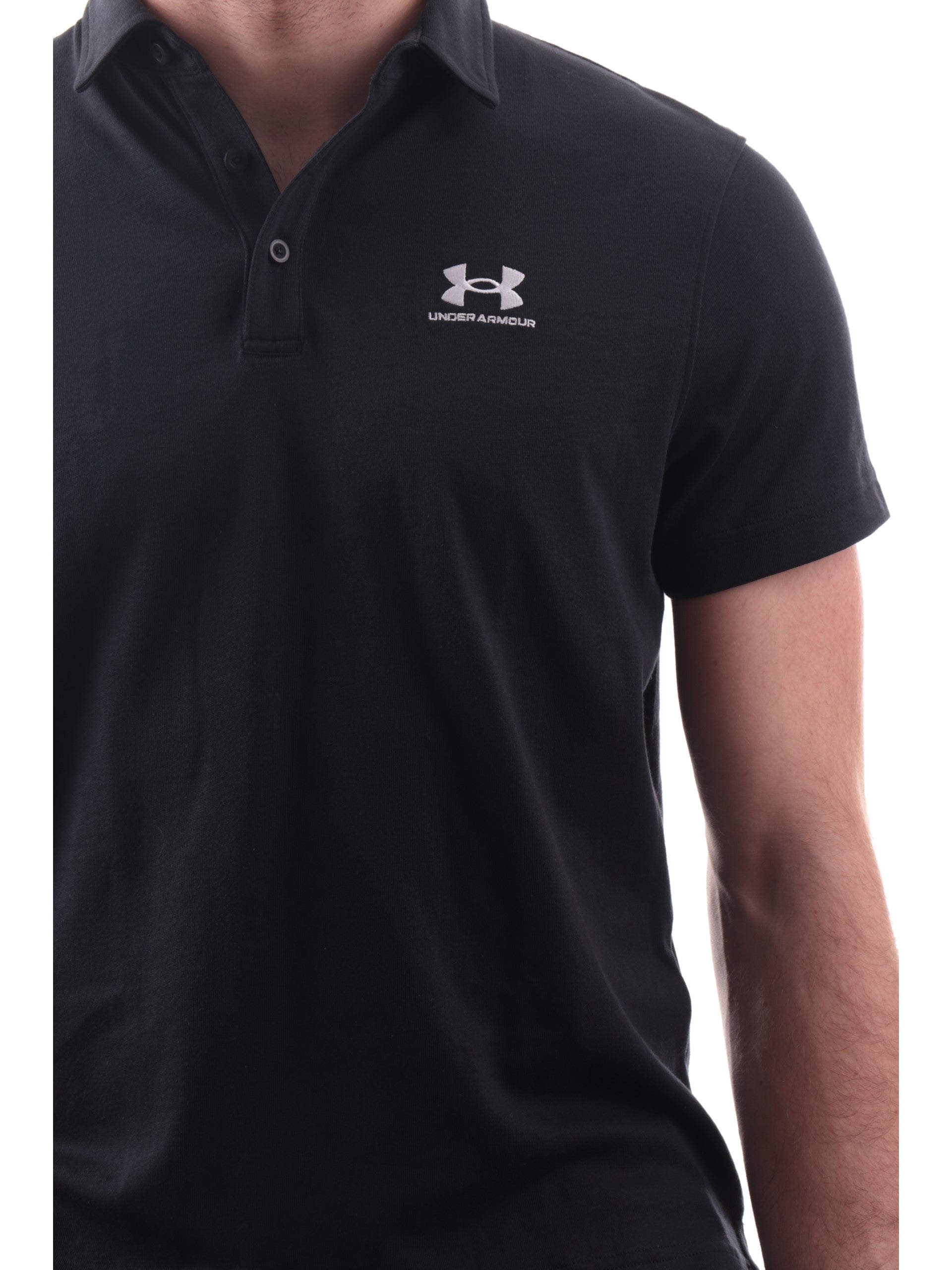Polo Under Armour nera da uomo. Questa polo Under Armour nera realizzata in cotone, ha il classico colletto, la chiusura con tre bottoni, le maniche corte, il patch del brand cucito sul davanti lato sinistro e il fondo regolare