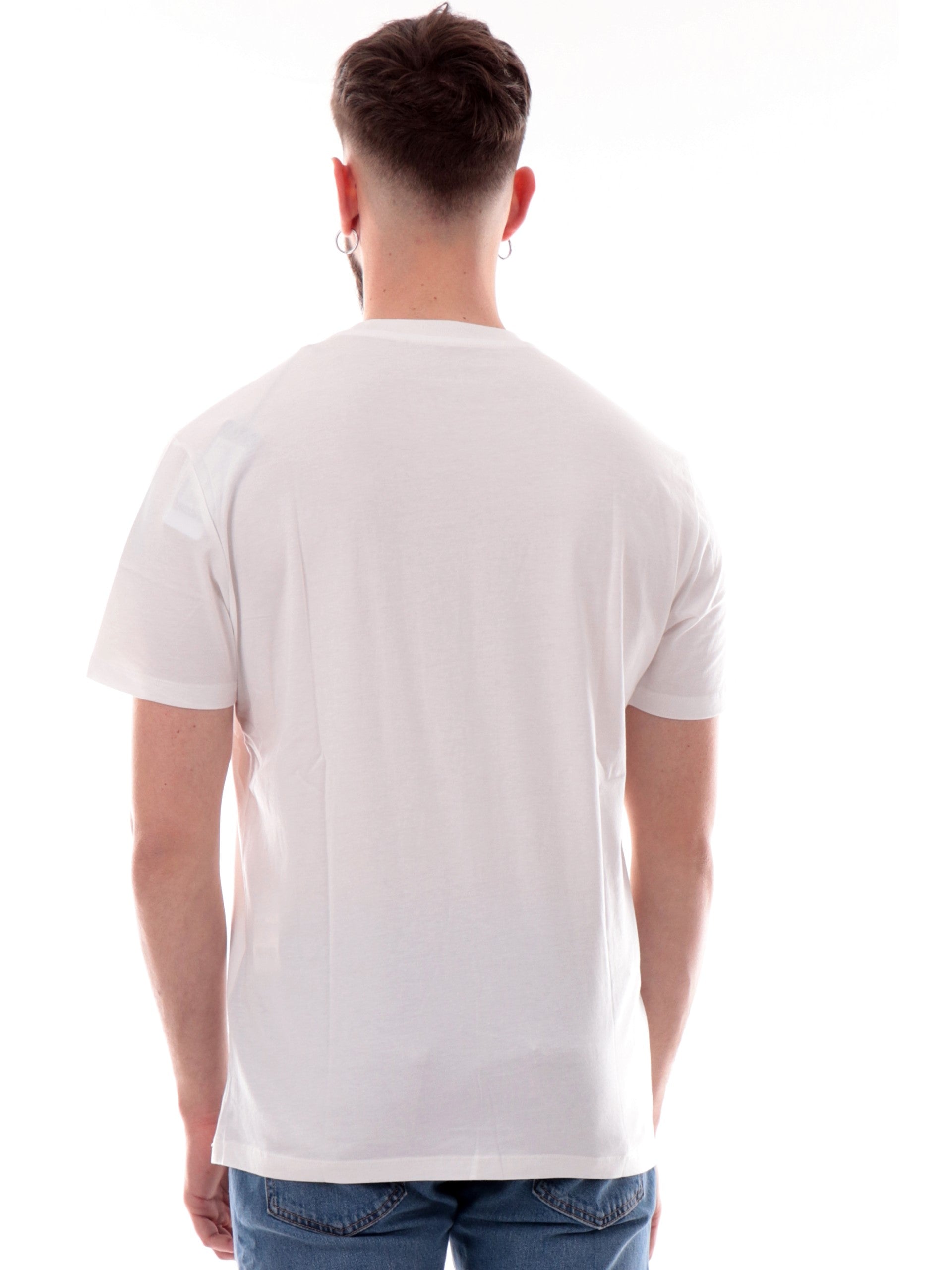 Maglia Armani Exchange AX bianca da uomo patch Armani gommato XM000787AF12308, realizzata in 100% puro cotone. Questa t-shirt AX bianca girocollo ha le maniche corte e il patch Armani gommato.