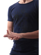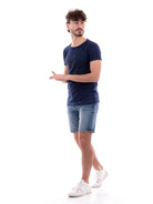Blaues Fifty Four Herren-T-Shirt mit Sommerdruck, Modell FLUSHT396, aus 100 % reiner Baumwolle. Dieses blaue Fifty Four-Shirt hat kurze Ärmel, den Maxi-Markendruck auf der Vorderseite in passenden Farben und den „Used“-Effekt an den Manschetten, dem Rundhalsausschnitt und dem Saum.