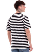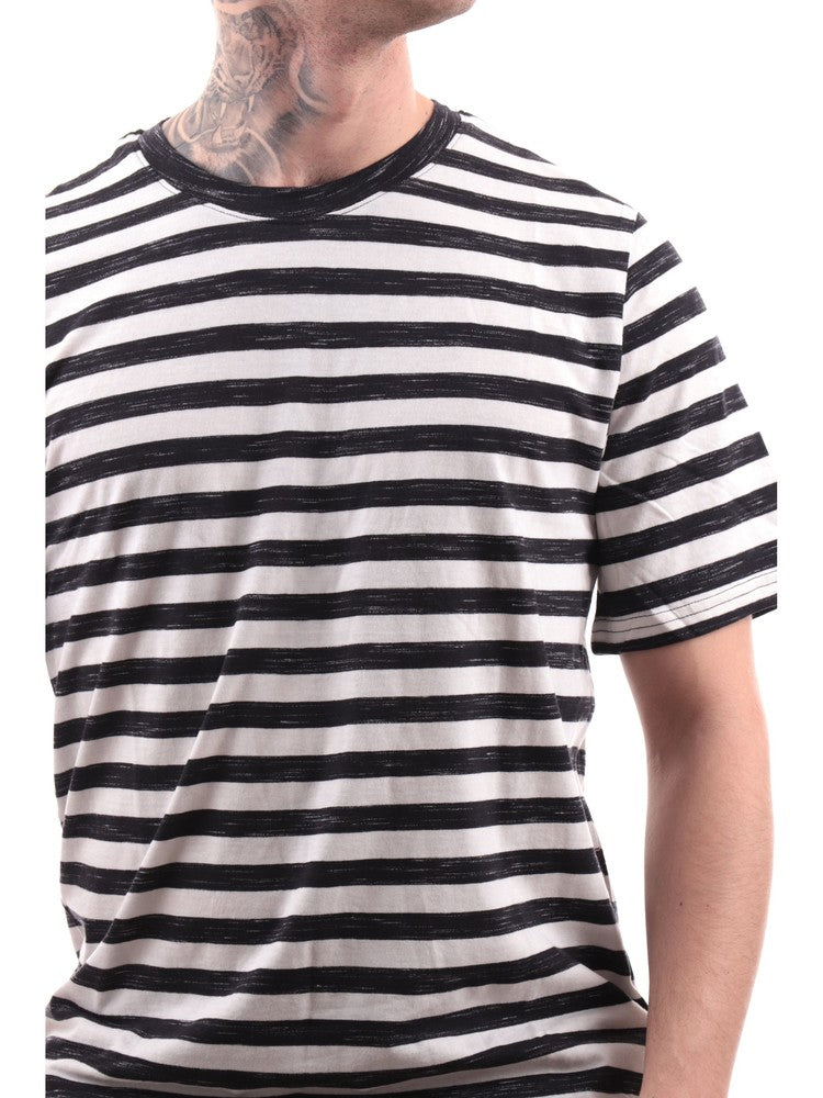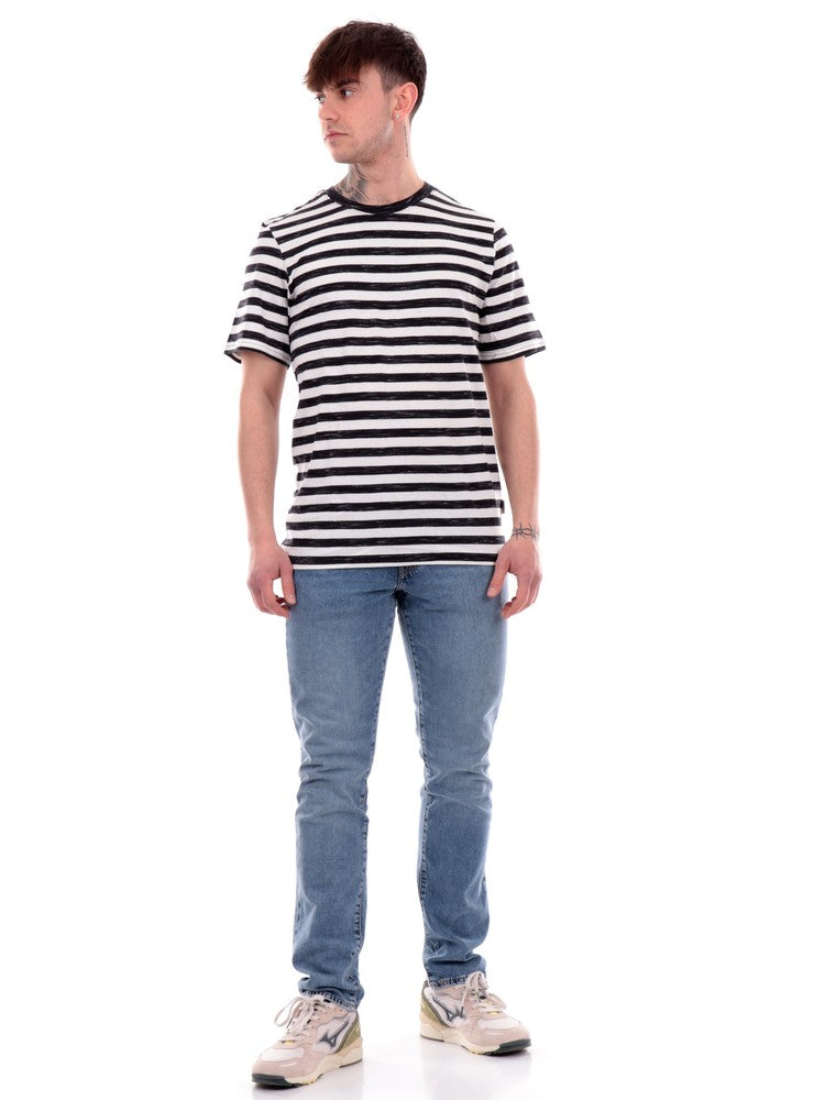 Gestreiftes, gestreiftes Herren-T-Shirt Jack Jones in Schwarz 12252176 aus weicher Baumwolle. Dieser schwarze Pullover mit Rundhalsausschnitt von Jack Jones hat kurze Ärmel, einen regulären Saum und ein durchgehendes Streifenmuster.