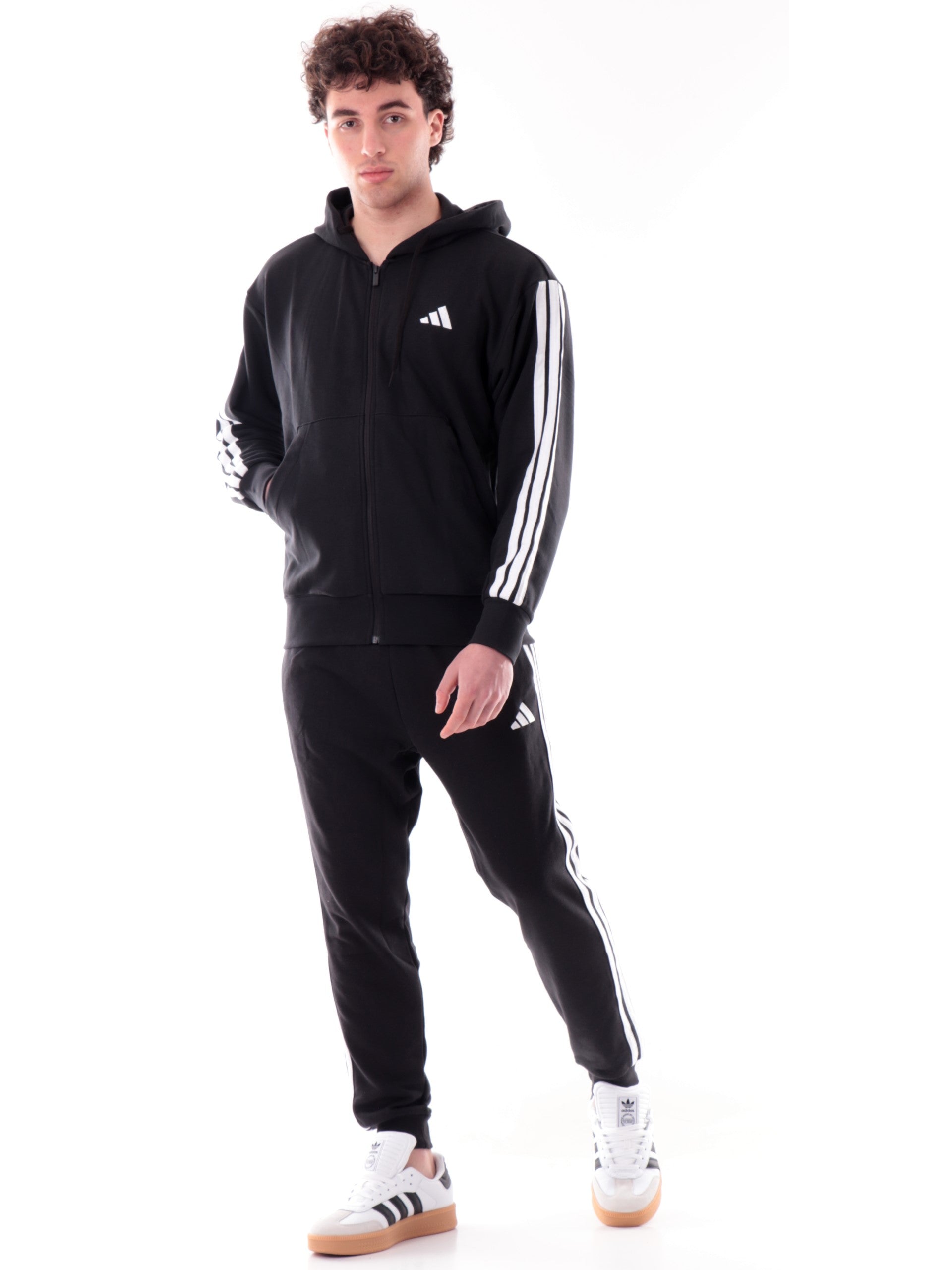 Felpa Adidas nera da uomo full zip con cappuccio. Questa felpa uomo Adidas nera ha il cappuccio regolabile con laccetti, la chiusura full zip centrale, due tasche laterali aperte, le 3Stripes ambo i lati e il logo Adidas bianco ricamato lato cuore.